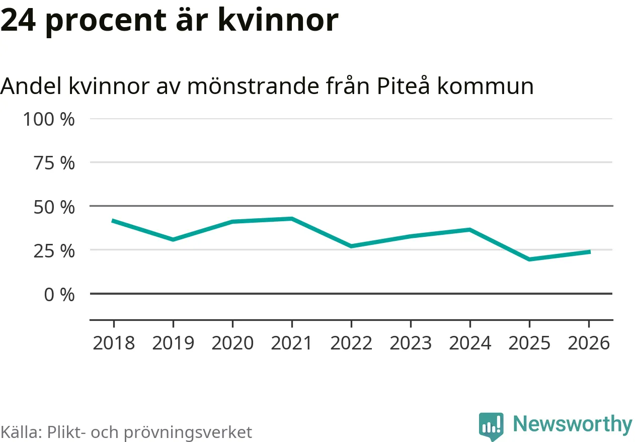 30 av de som kallats till mönstring från Piteå är kvinnor, vilket motsvarar 24 procent av de mönstrande. Som mest har 36 kvinnor kallats från kommunen (2024). I riket som helhet är 28 procent av de mönstrande tjejer.