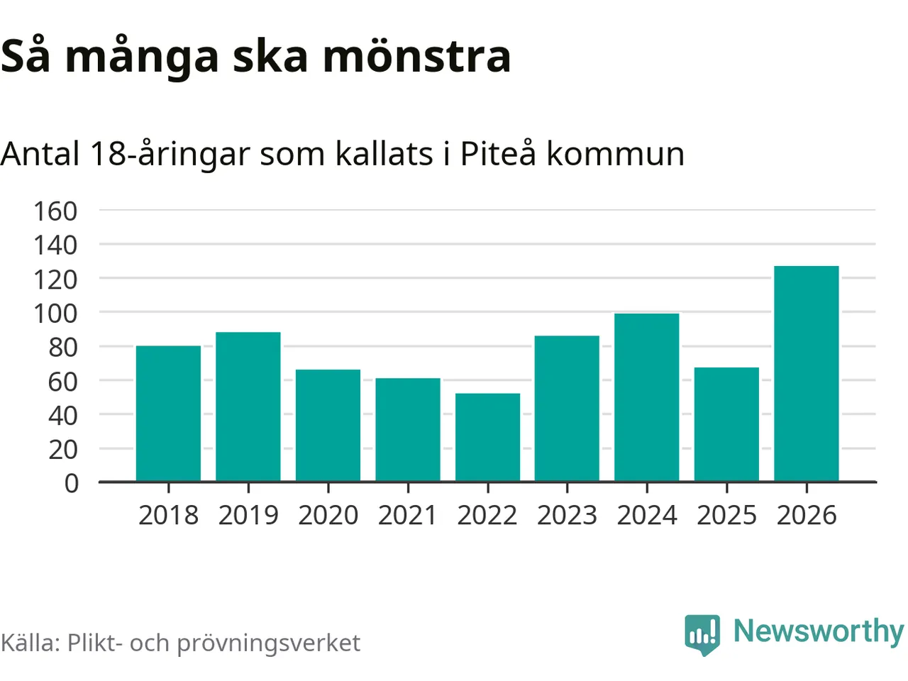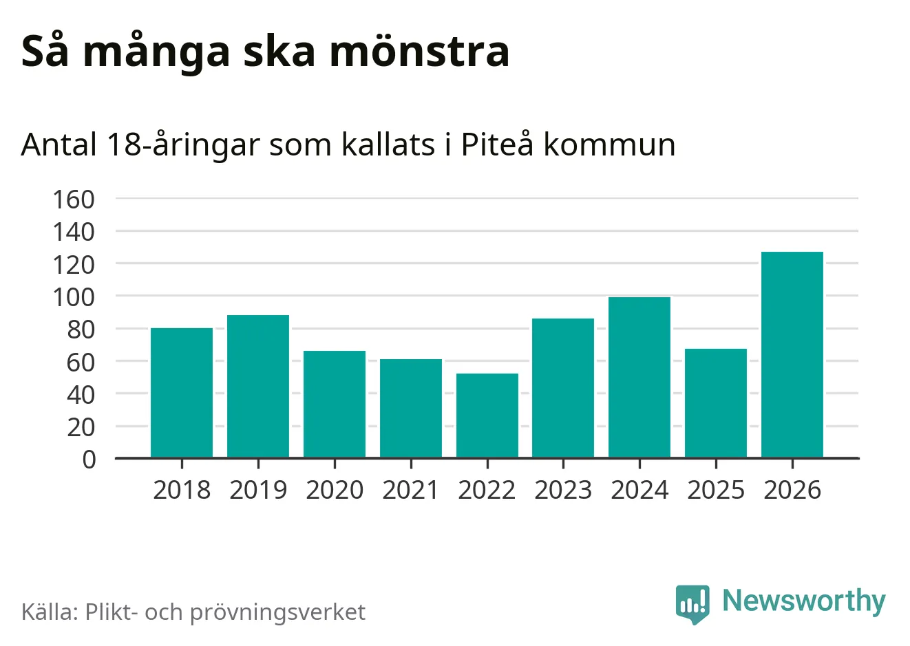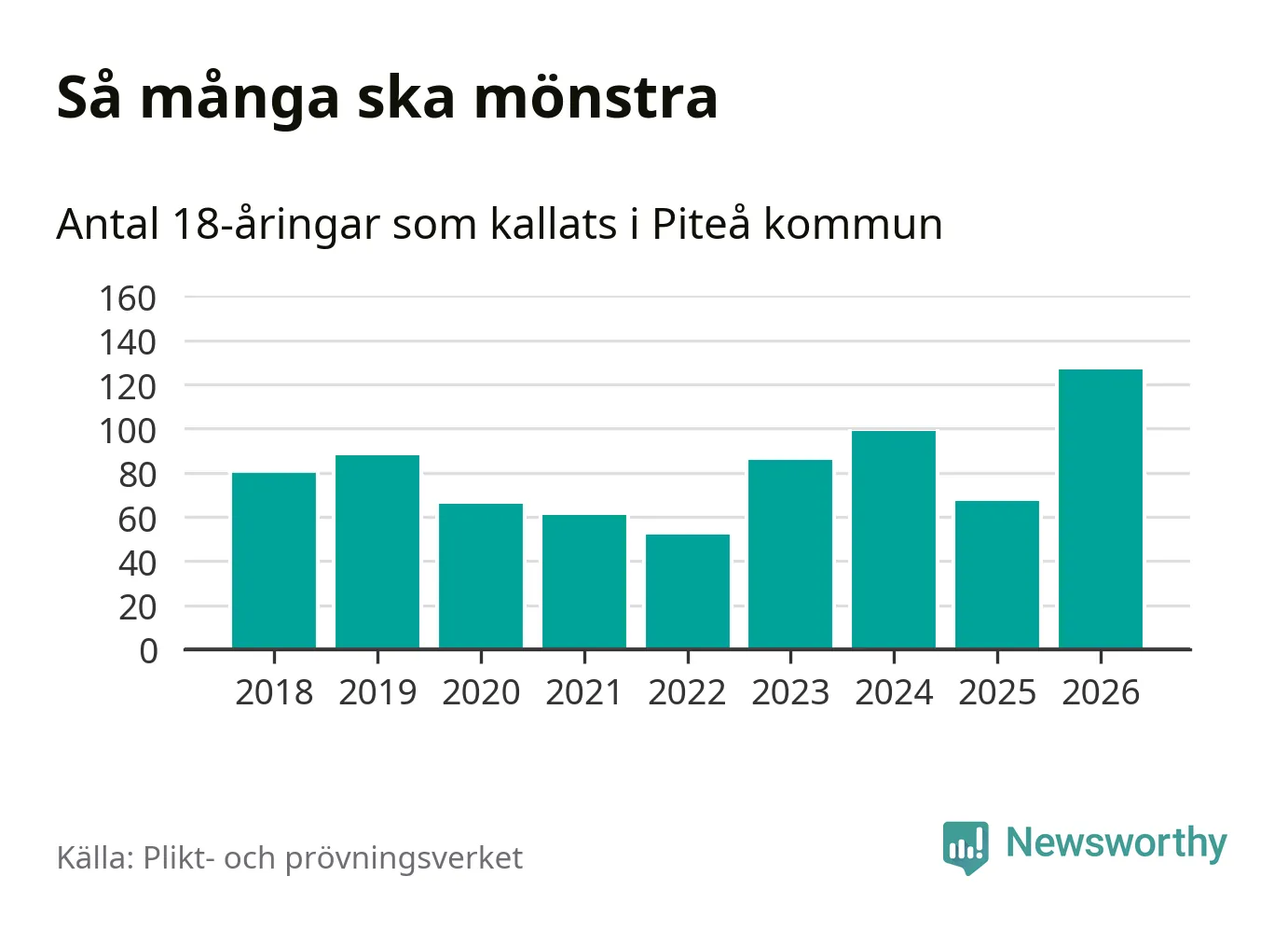 127 personer är det högsta antalet kallade i Piteå sedan 2018, som är första året med statistik på kommunnivå (värnplikten återinfördes 2017), och 60 mönstrande fler än 2025. Totalt från Norrbottens län kallas 736 personer i år.