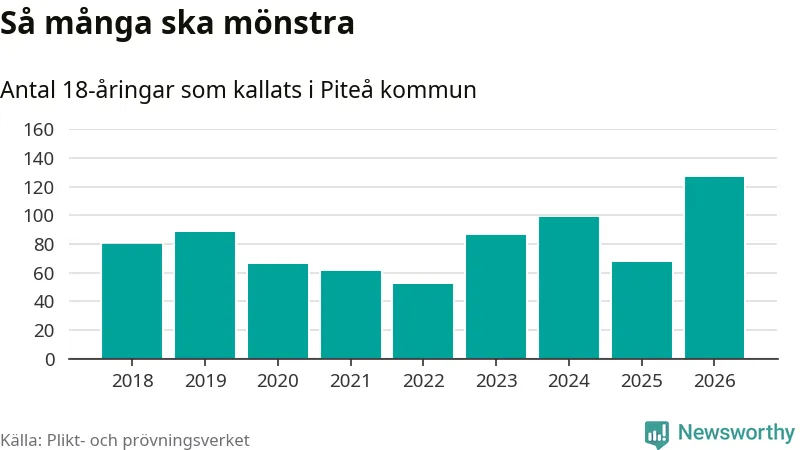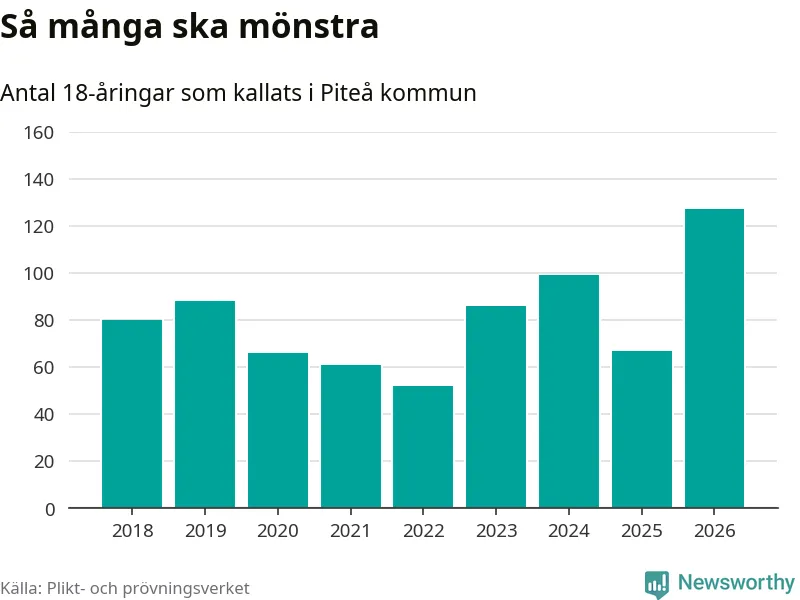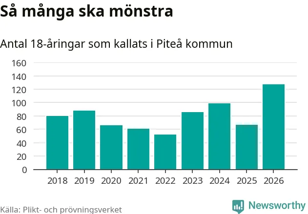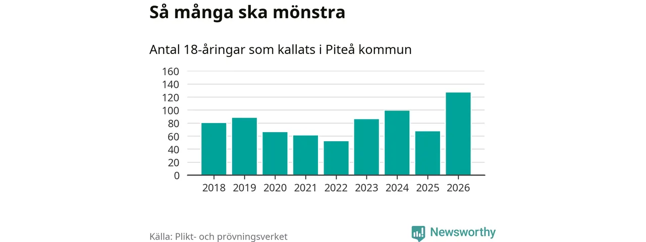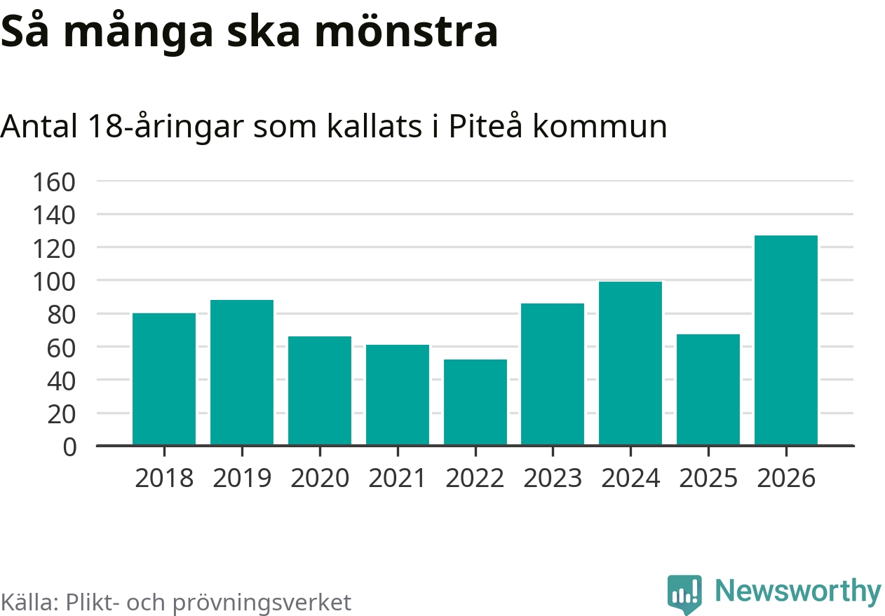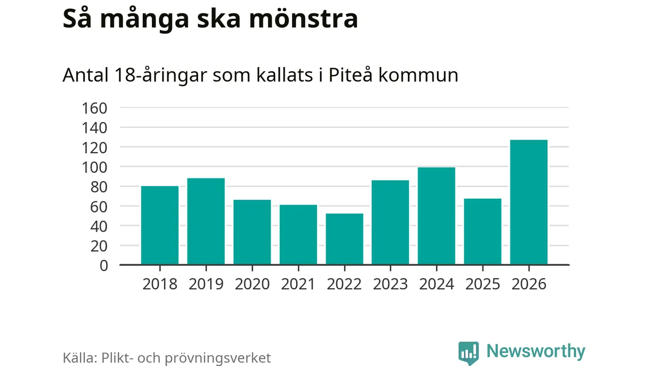 127 personer är det högsta antalet kallade i Piteå sedan 2018, som är första året med statistik på kommunnivå (värnplikten återinfördes 2017), och 60 mönstrande fler än 2025. Totalt från Norrbottens län kallas 736 personer i år.
