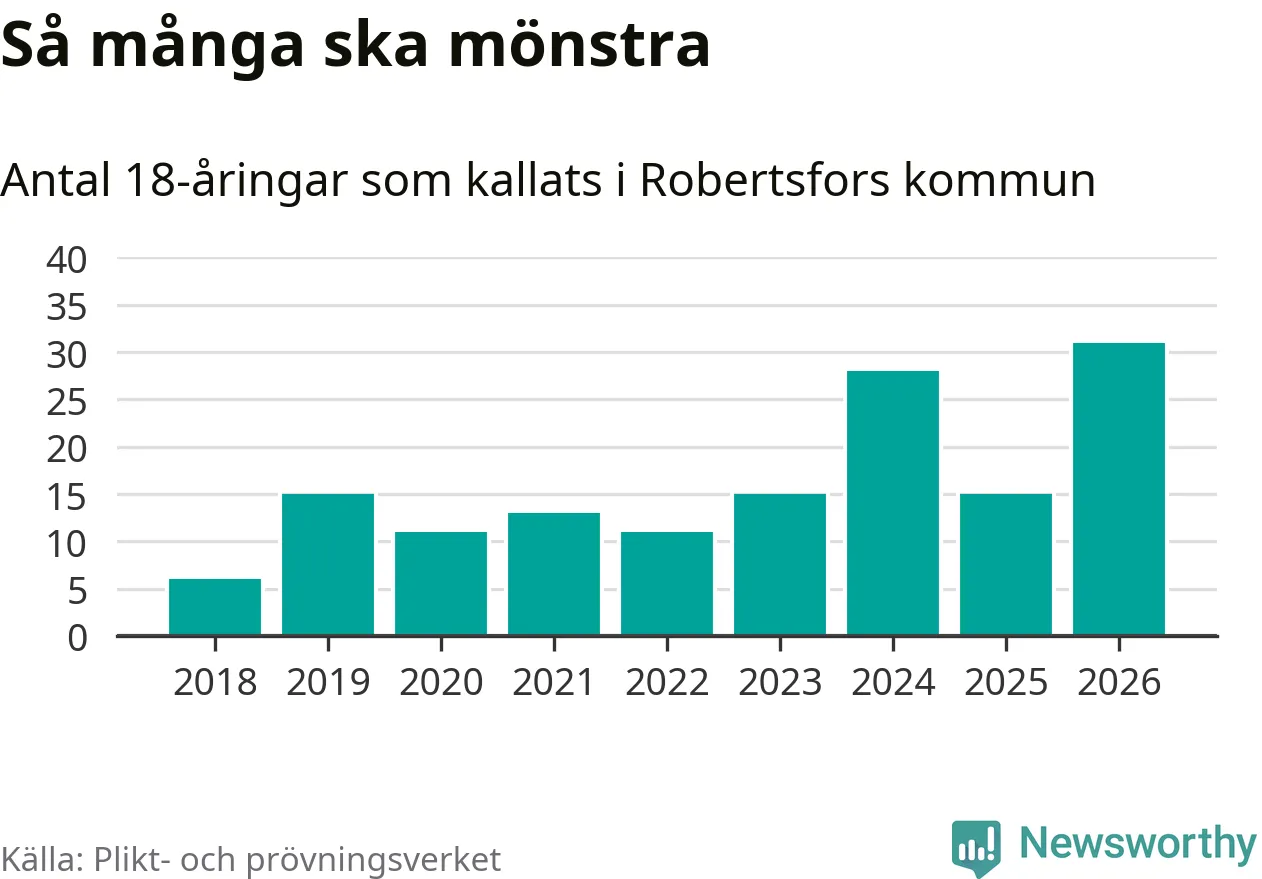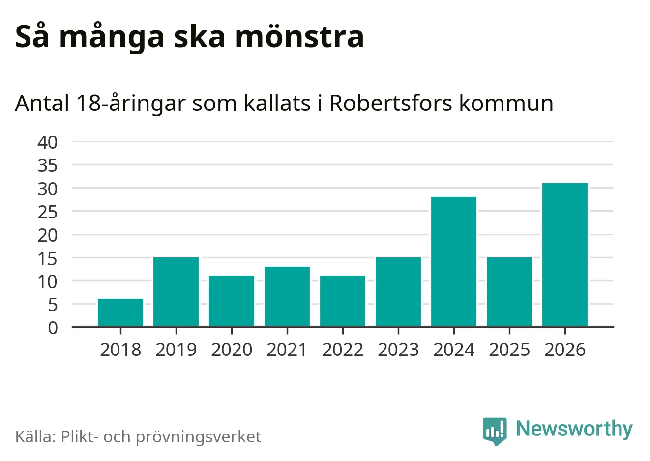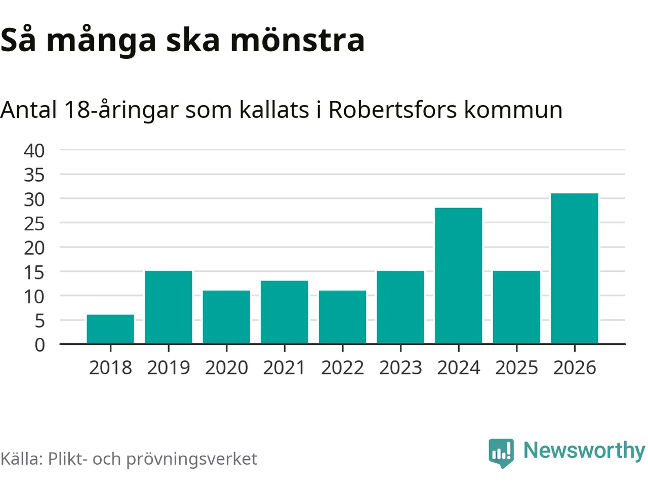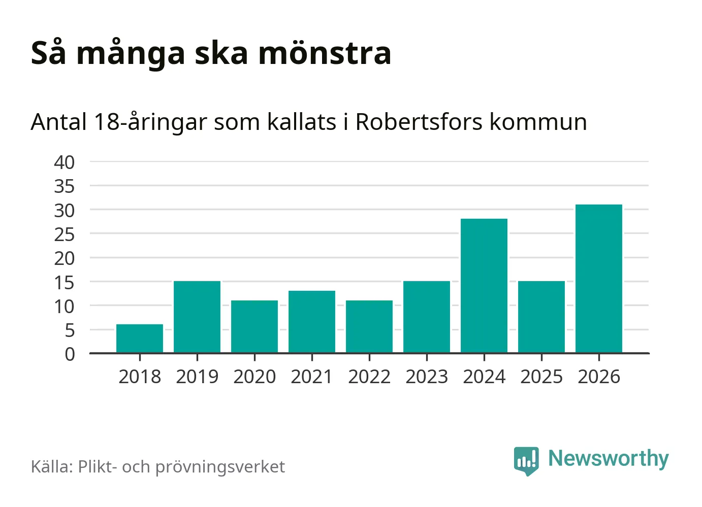 31 personer är det högsta antalet kallade i Robertsfors sedan 2018, som är första året med statistik på kommunnivå (värnplikten återinfördes 2017), och 16 mönstrande fler än 2025. Totalt från Västerbottens län kallas 878 personer i år.