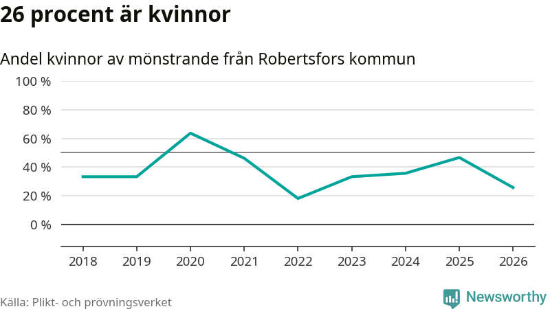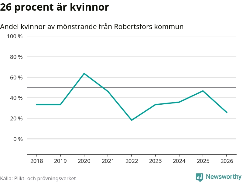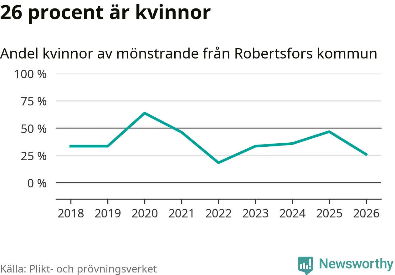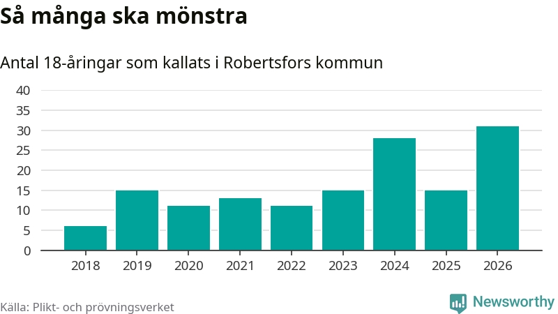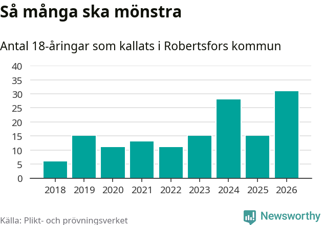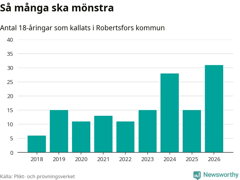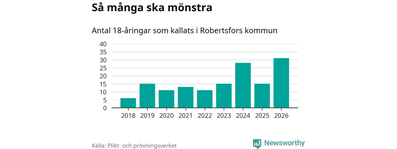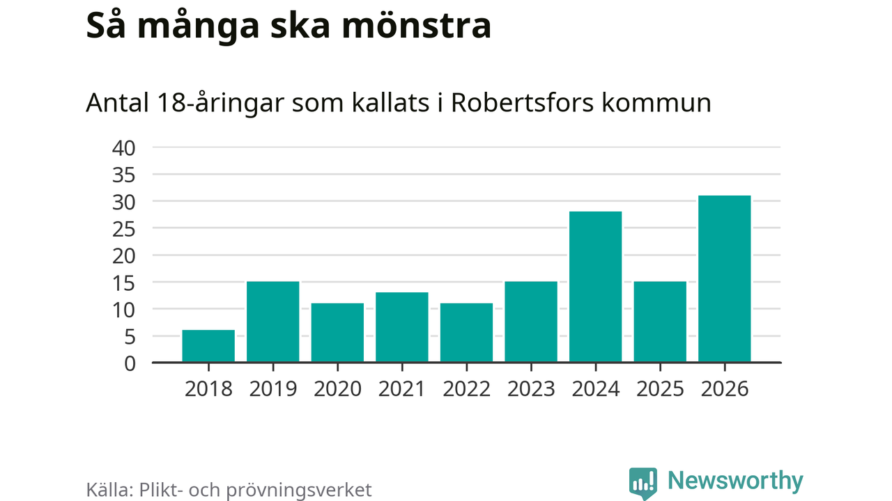 31 personer är det högsta antalet kallade i Robertsfors sedan 2018, som är första året med statistik på kommunnivå (värnplikten återinfördes 2017), och 16 mönstrande fler än 2025. Totalt från Västerbottens län kallas 878 personer i år.