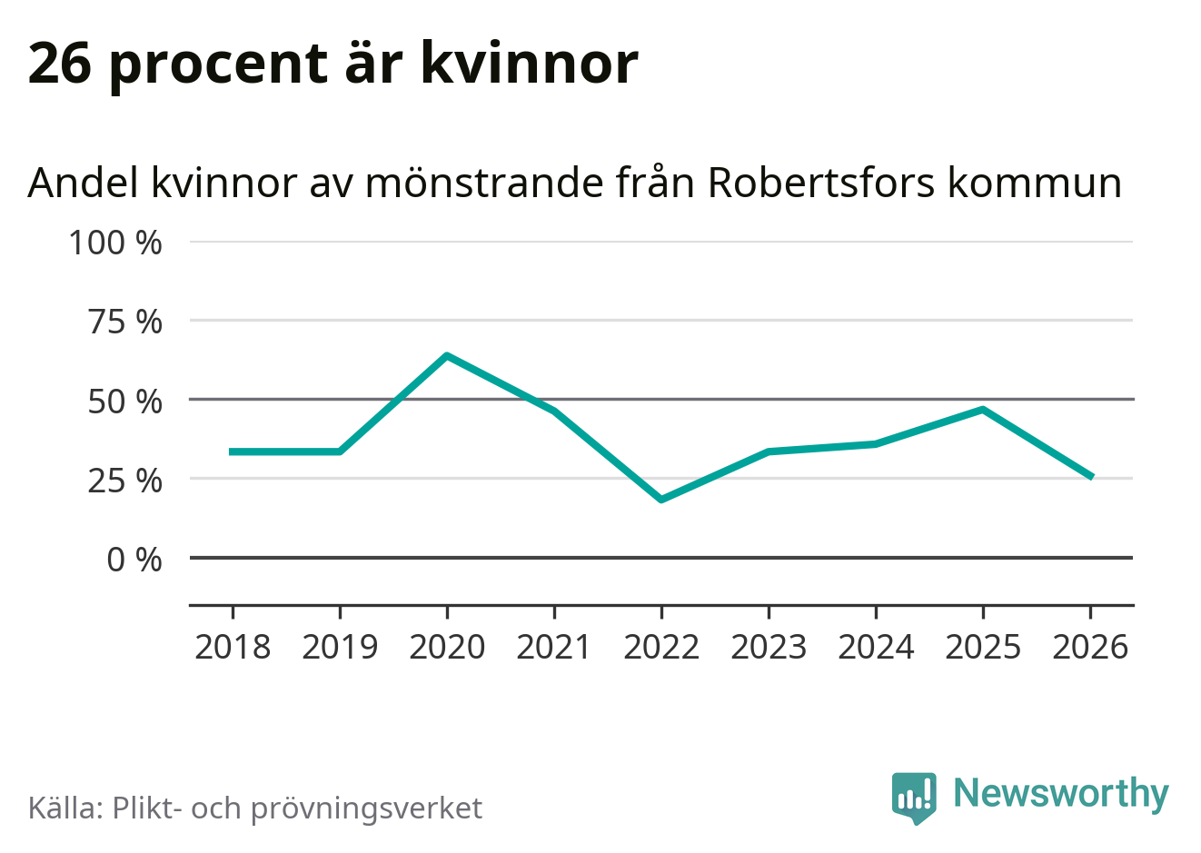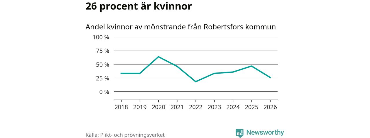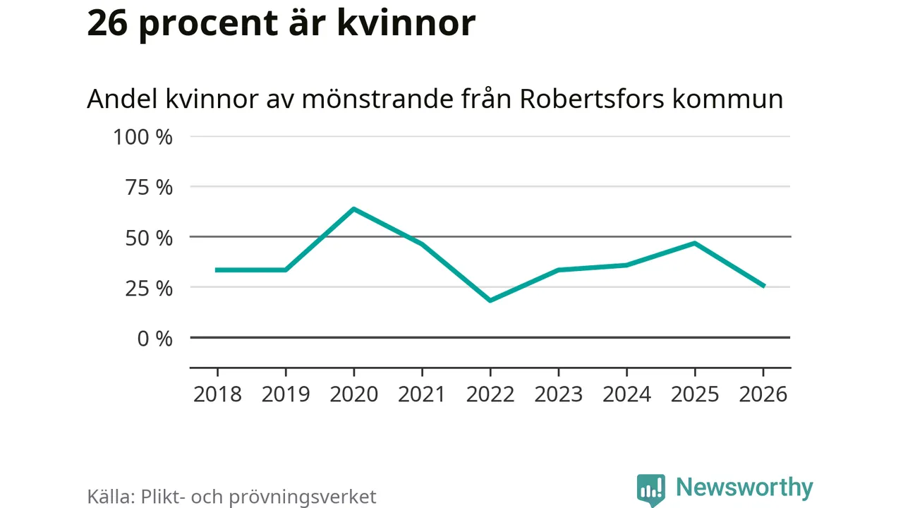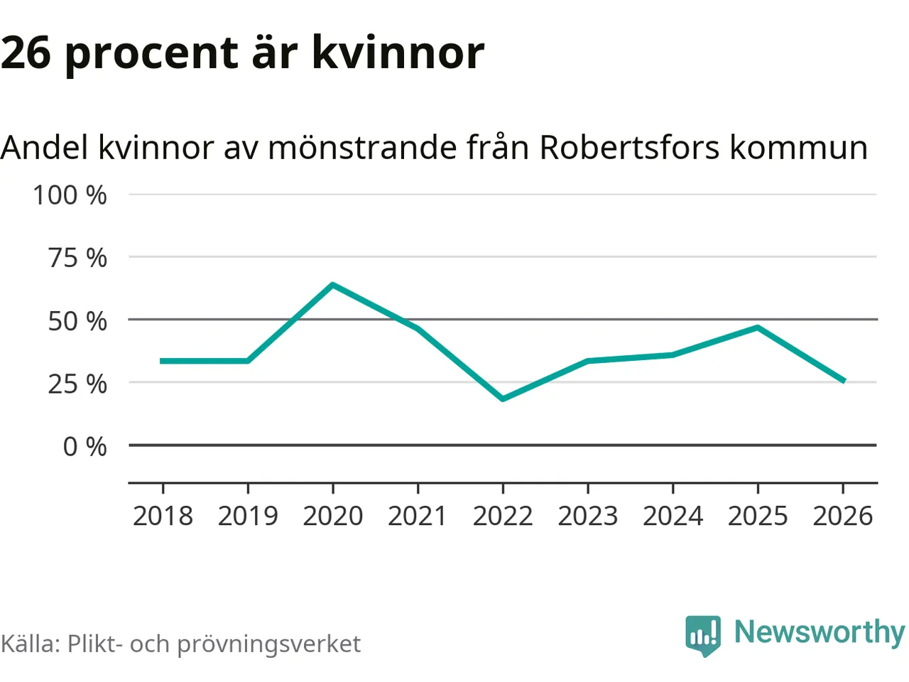 Nu kallas omkring 30 000 svenskar födda 2008 till mönstring. Och 31 av dem kommer från Robertsfors, enligt ny statistik från Plikt- och prövningsverket. Det innebär att mer än var tredje invånare i åldersgruppen i kommunen kallas till mönstring. Det är en högre andel än i Västerbotten totalt. I riket som helhet kallas nästan var fjärde person i årskullen.