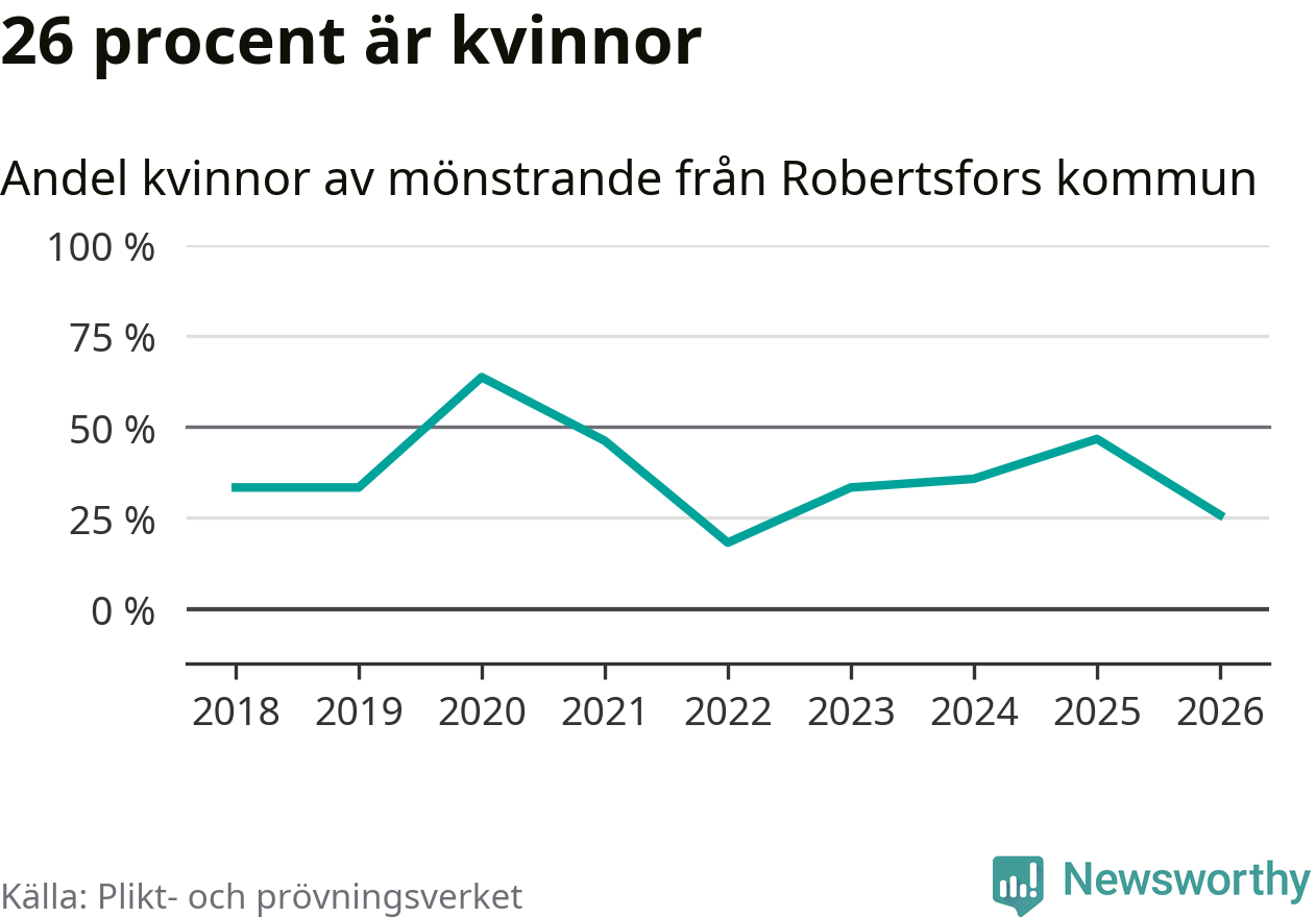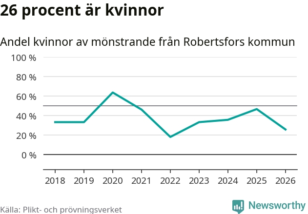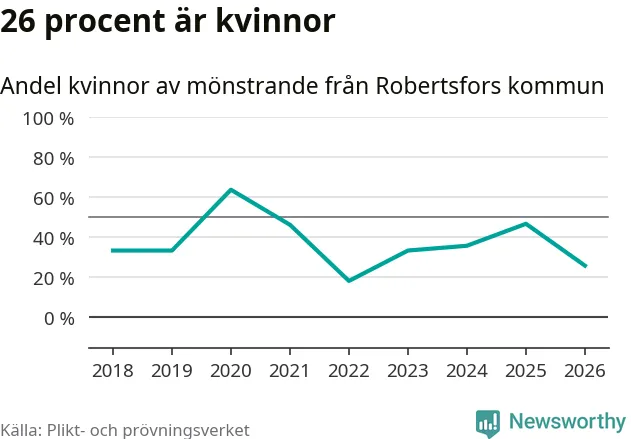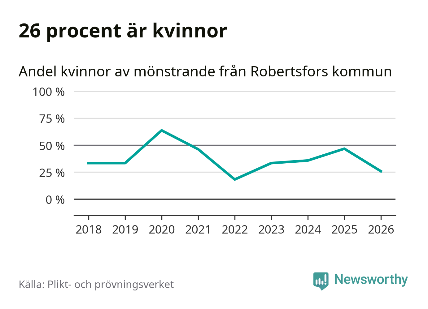 Nu kallas omkring 30 000 svenskar födda 2008 till mönstring. Och 31 av dem kommer från Robertsfors, enligt ny statistik från Plikt- och prövningsverket. Det innebär att mer än var tredje invånare i åldersgruppen i kommunen kallas till mönstring. Det är en högre andel än i Västerbotten totalt. I riket som helhet kallas nästan var fjärde person i årskullen.