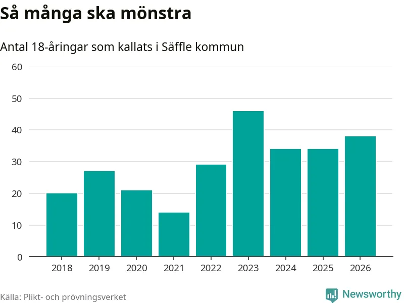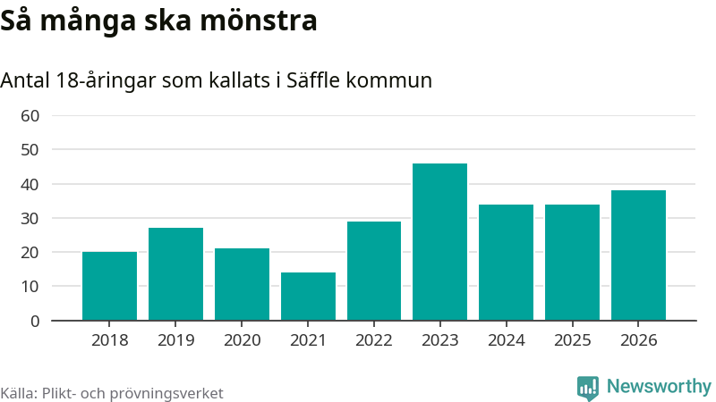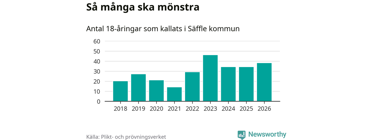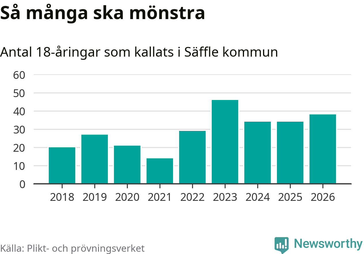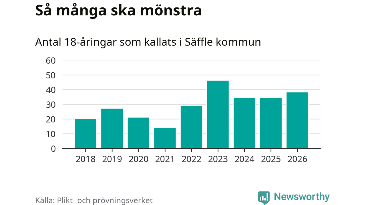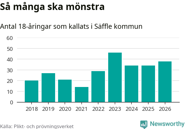 38 personer är fyra fler än 2025. Som mest har 46 personer från en årskull kommunen mönstrat (2023). Totalt från Värmlands län kallas 730 personer i år.