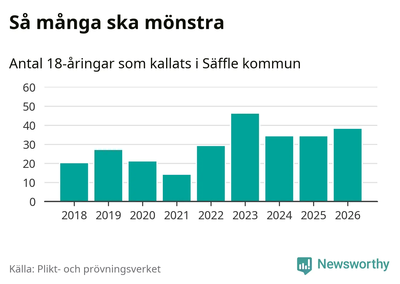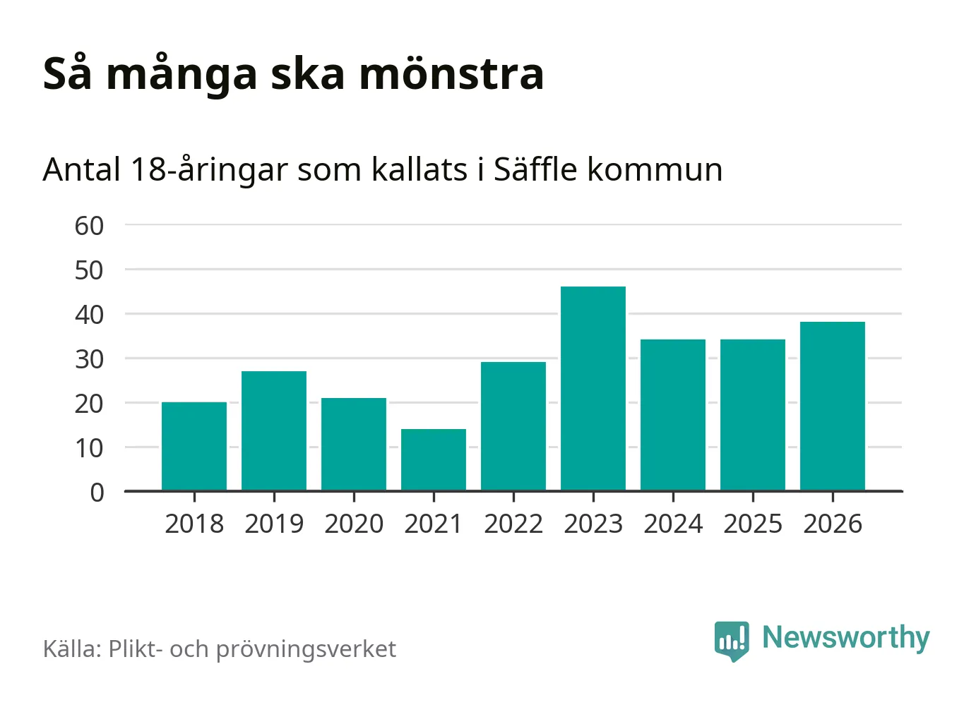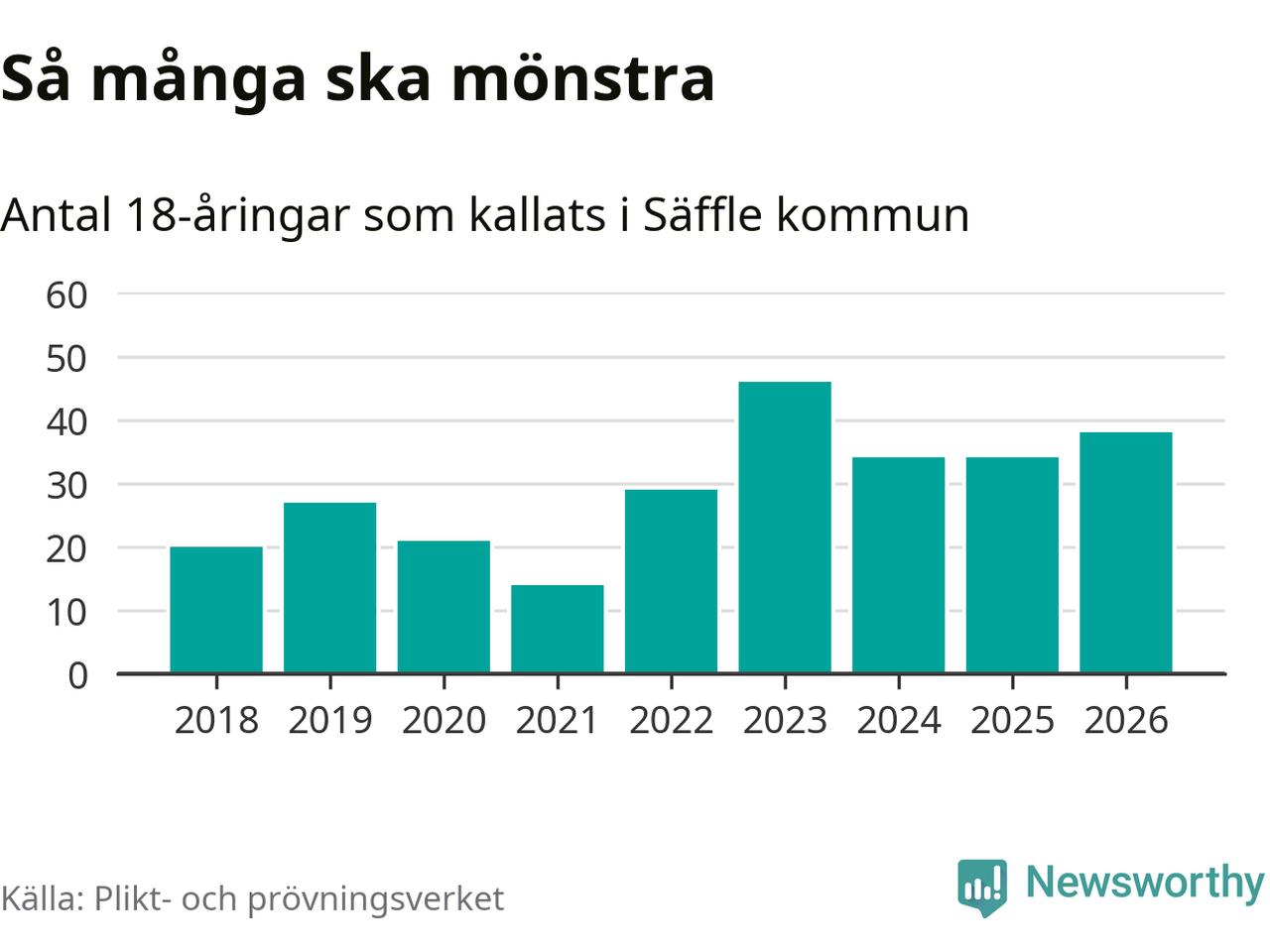 38 personer är fyra fler än 2025. Som mest har 46 personer från en årskull kommunen mönstrat (2023). Totalt från Värmlands län kallas 730 personer i år.