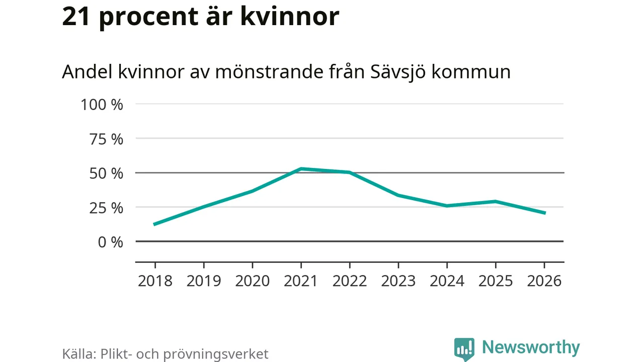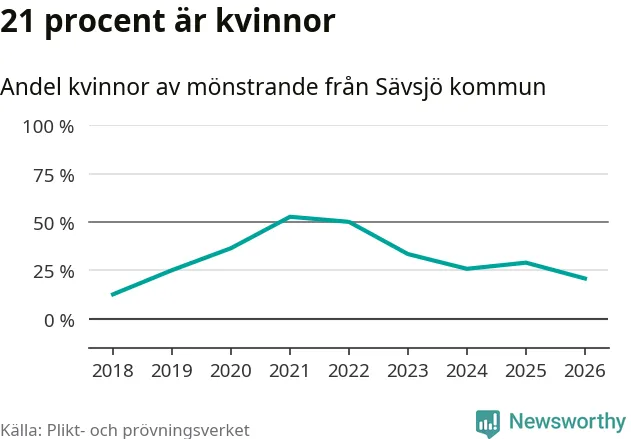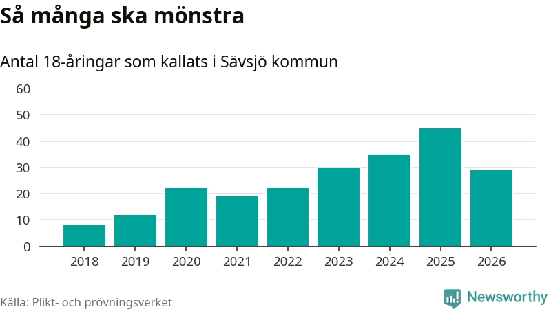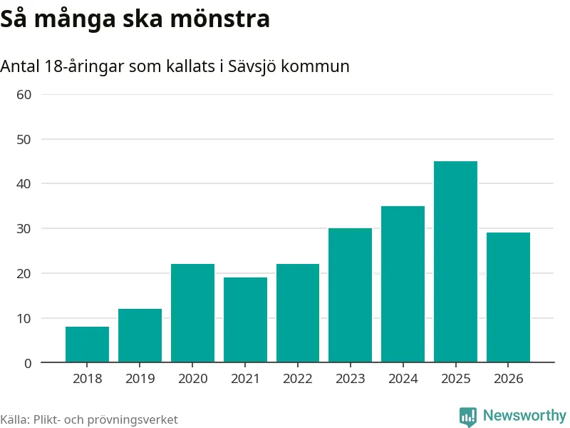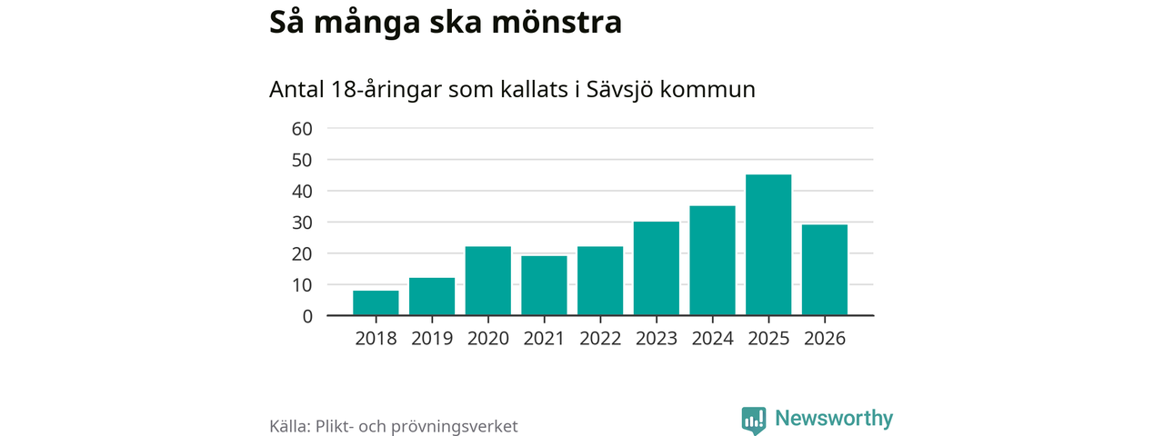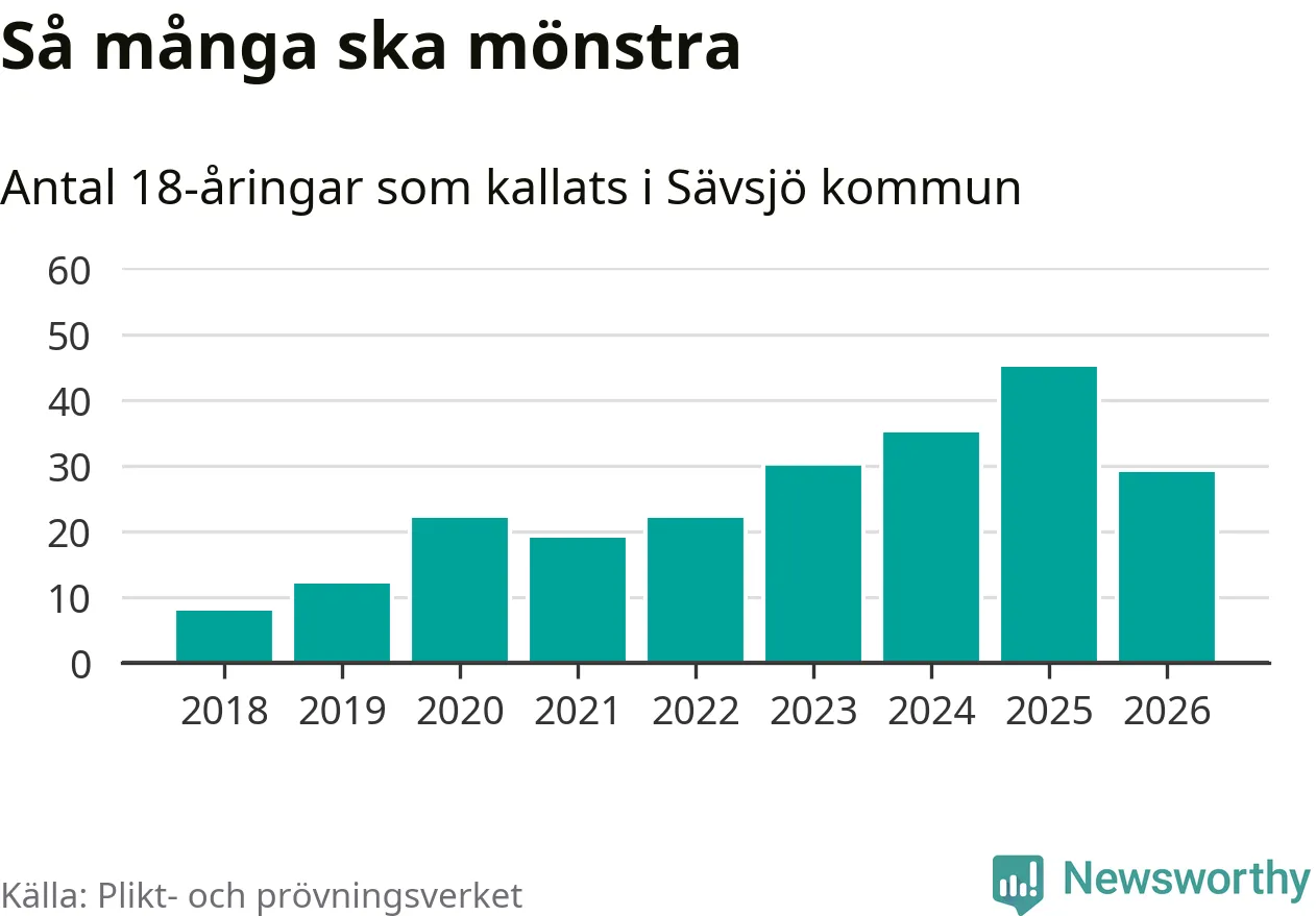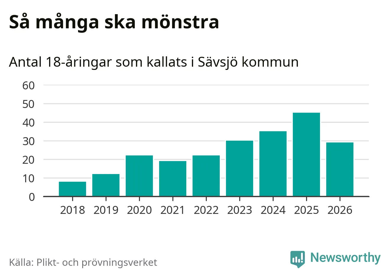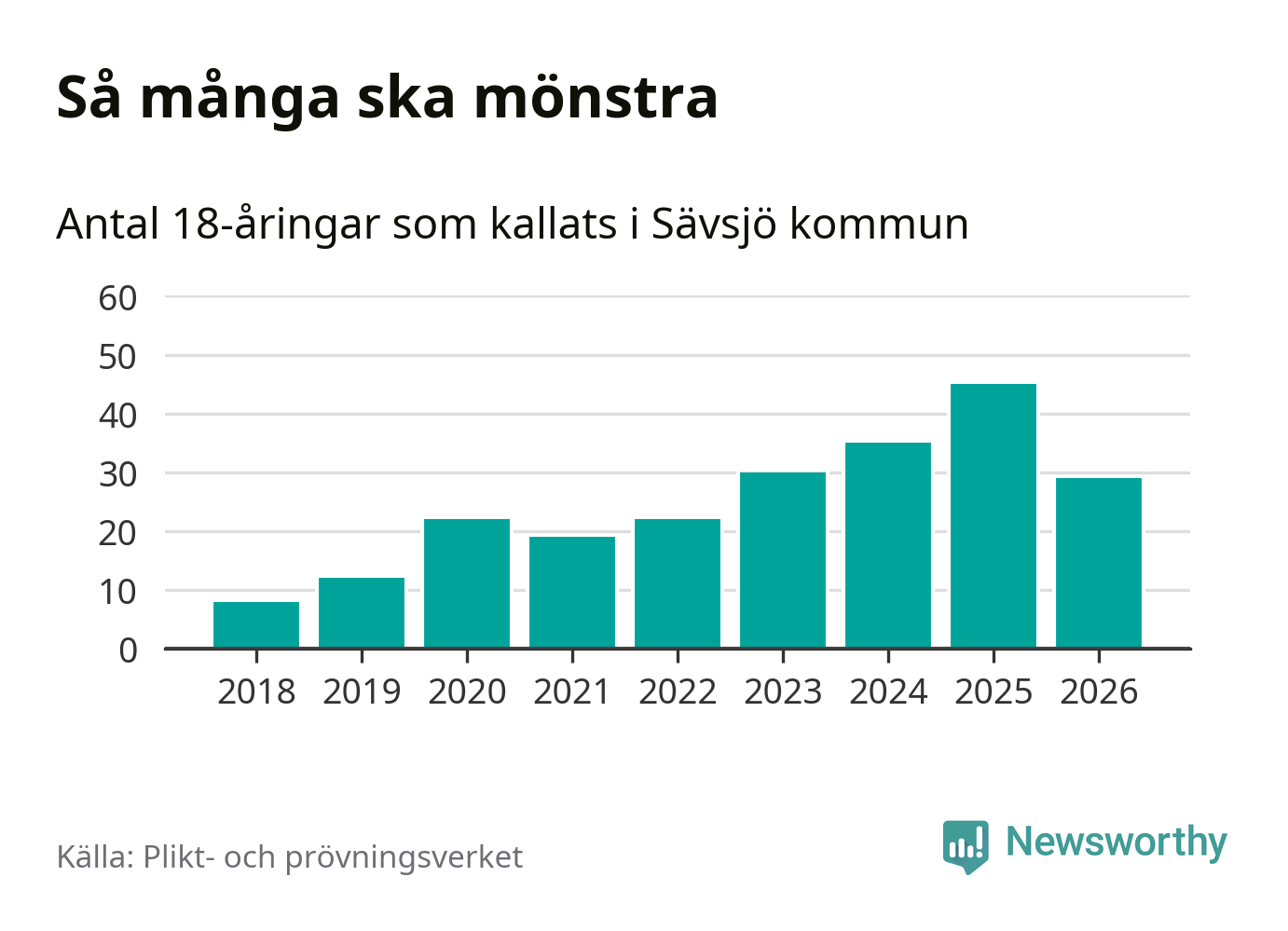 Nu kallas omkring 30 000 svenskar födda 2008 till mönstring. Och 29 av dem kommer från Sävsjö, enligt ny statistik från Plikt- och prövningsverket. Det innebär att var femte invånare i åldersgruppen i kommunen kallas till mönstring. Det är en lägre andel än i Jönköpings län totalt. I riket som helhet kallas nästan var fjärde person i årskullen.