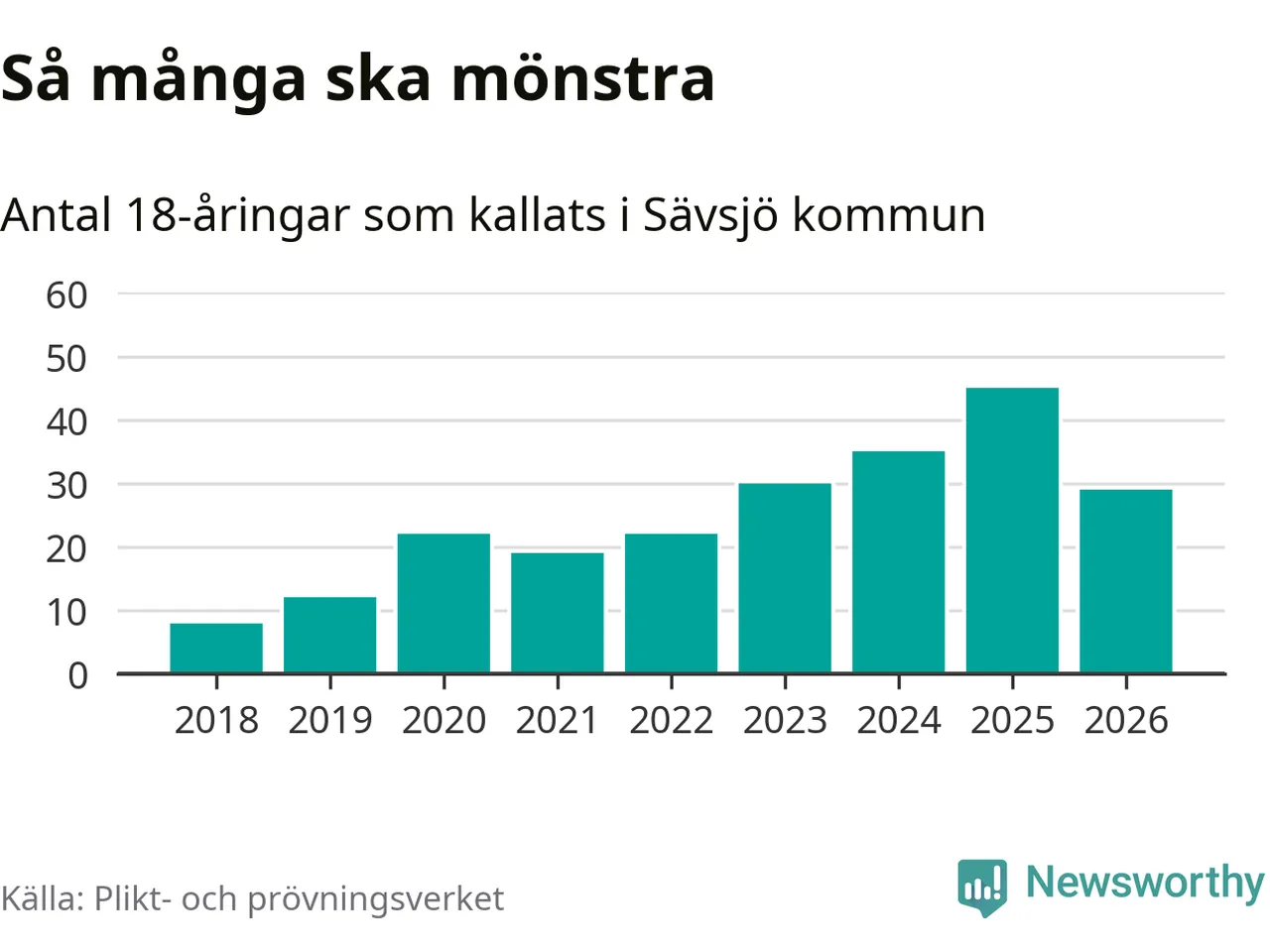 Av de som skrivits in till någon av Försvarmaktens grundutbildningar förra året, 2025, kommer elva (nio män och två kvinnor) från Sävsjö. Nio av dessa antogs efter att ha kallats till mönstring.