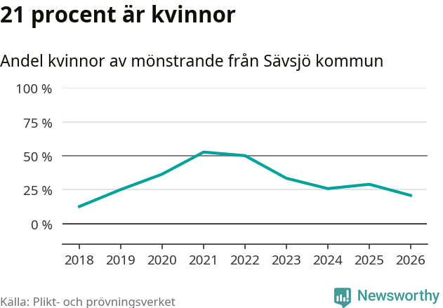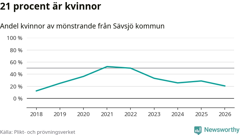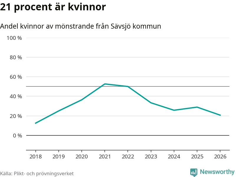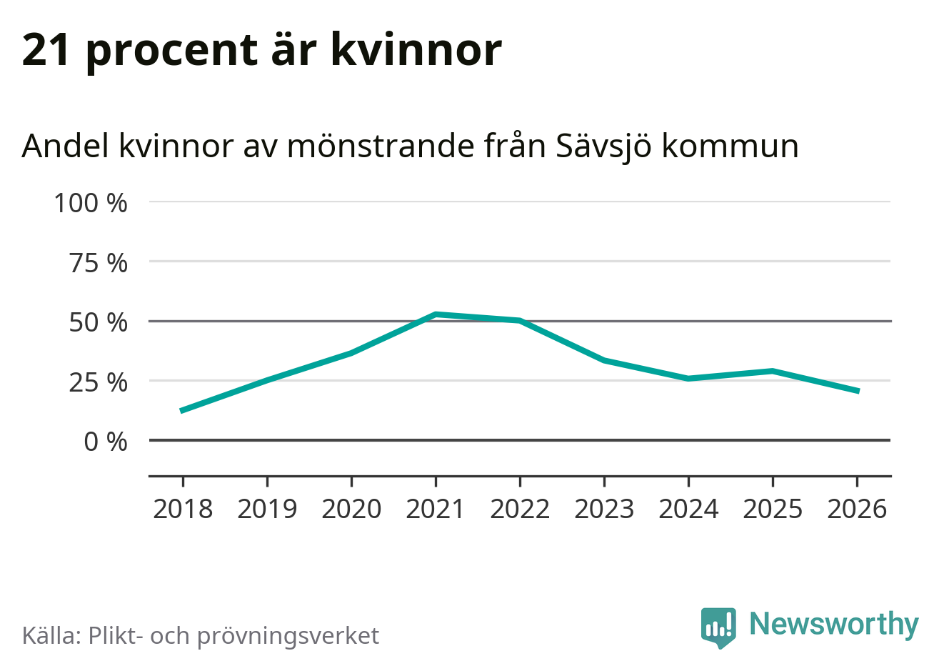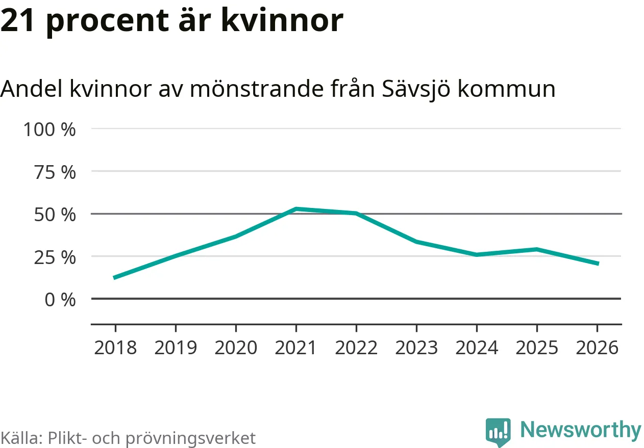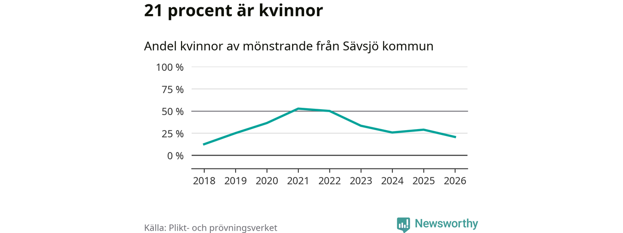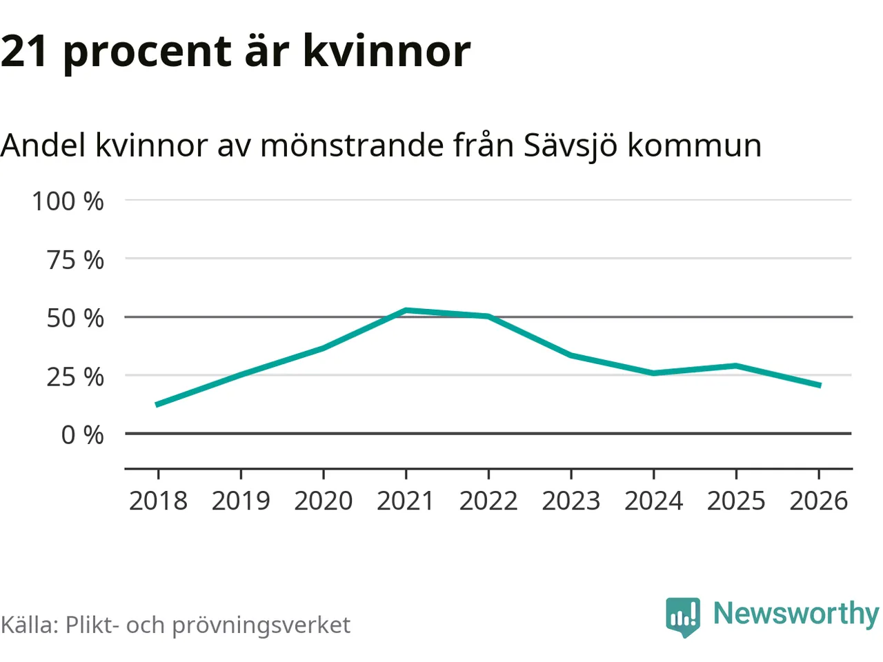 Sex av de som kallats till mönstring från Sävsjö är kvinnor, vilket motsvarar 21 procent av de mönstrande. Som mest har 13 kvinnor kallats från kommunen (2025). I riket som helhet är 28 procent av de mönstrande tjejer.