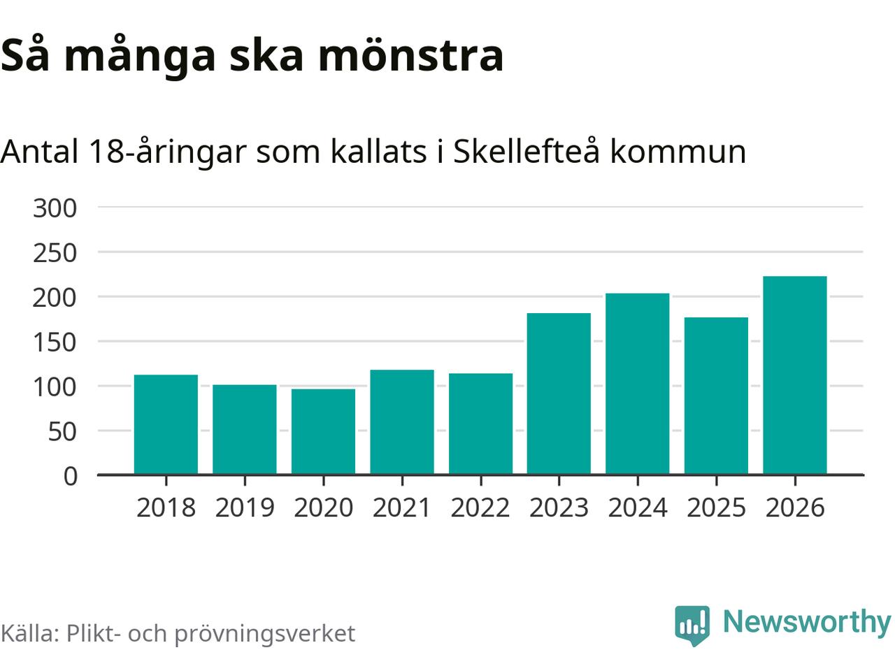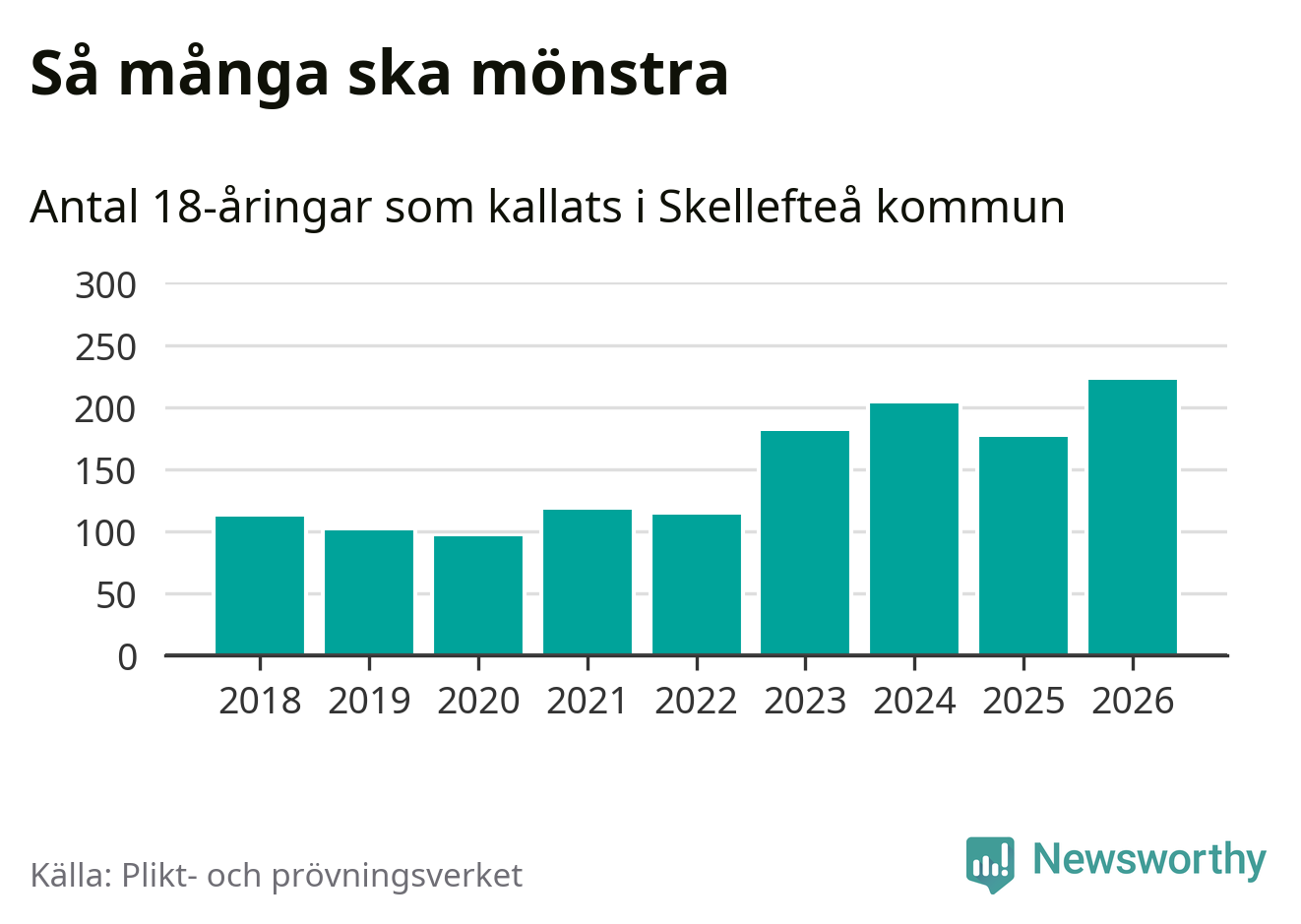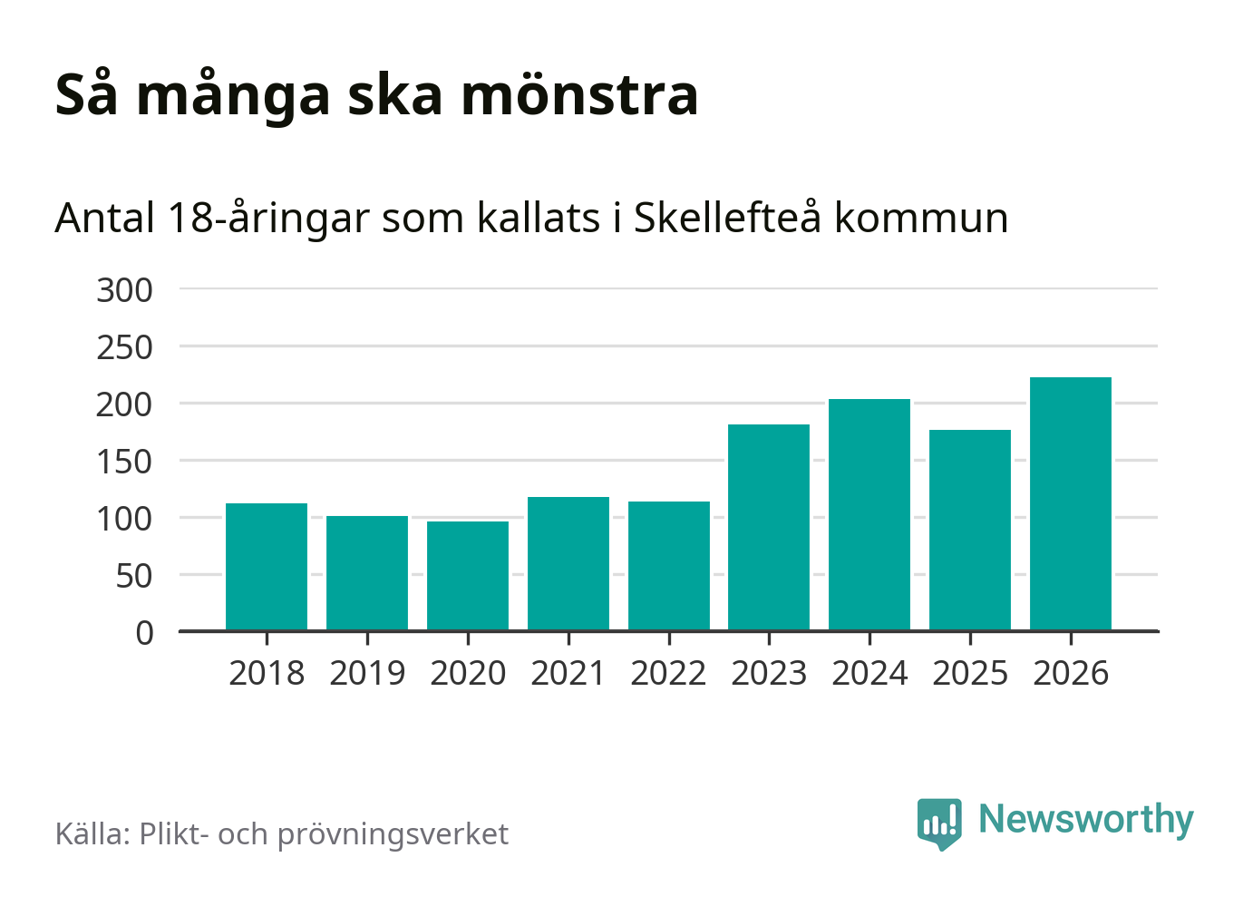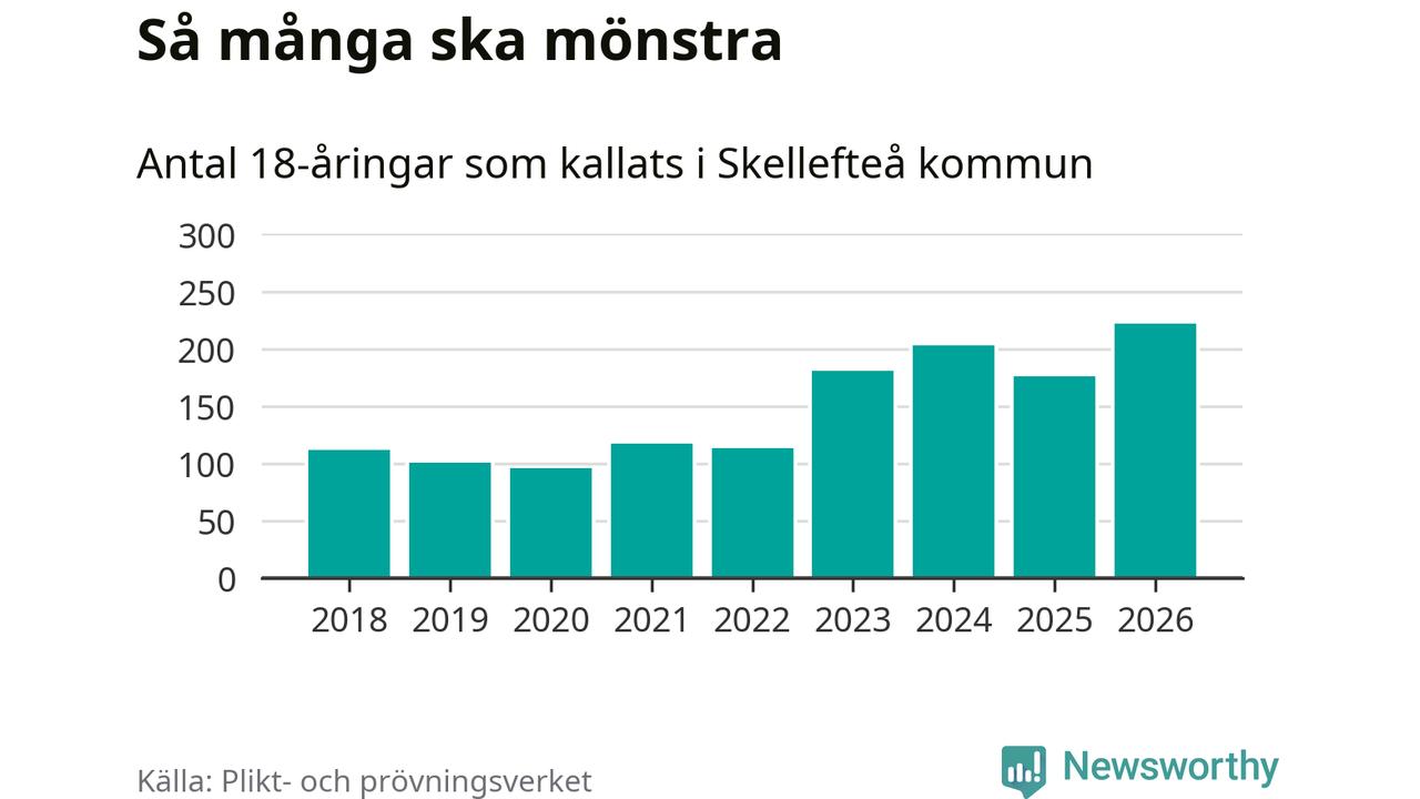 222 personer är det högsta antalet kallade i Skellefteå sedan 2018, som är första året med statistik på kommunnivå (värnplikten återinfördes 2017), och 46 mönstrande fler än 2025. Totalt från Västerbottens län kallas 878 personer i år.