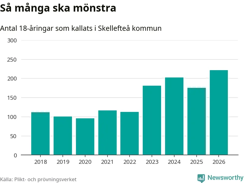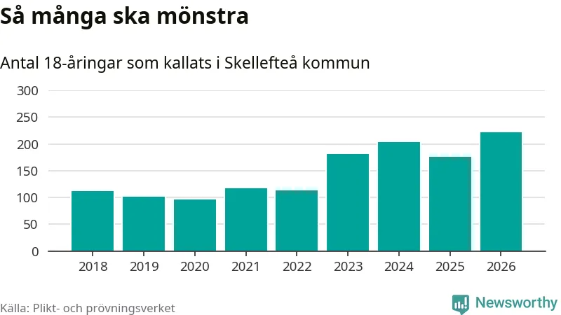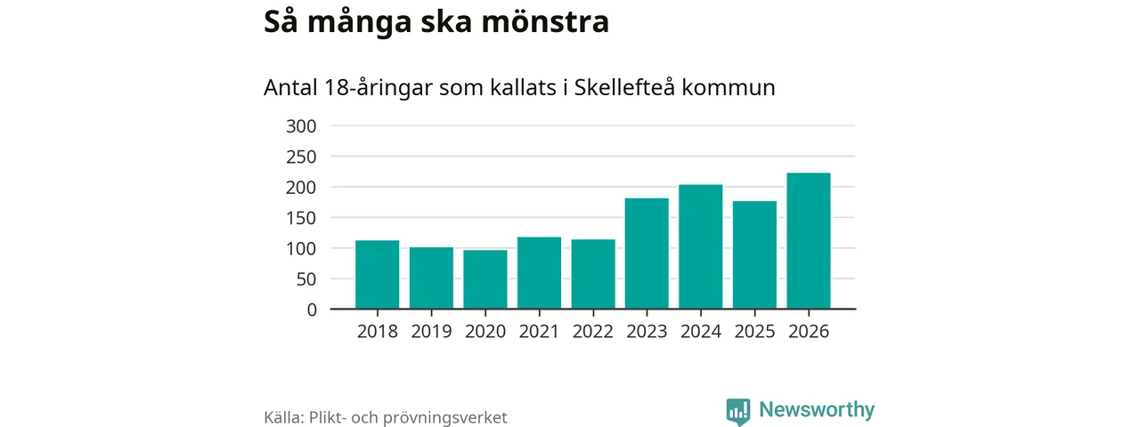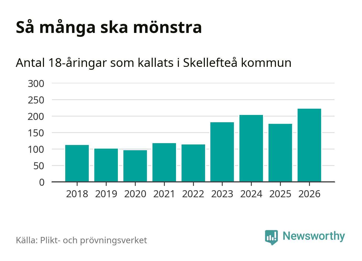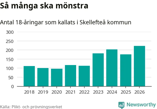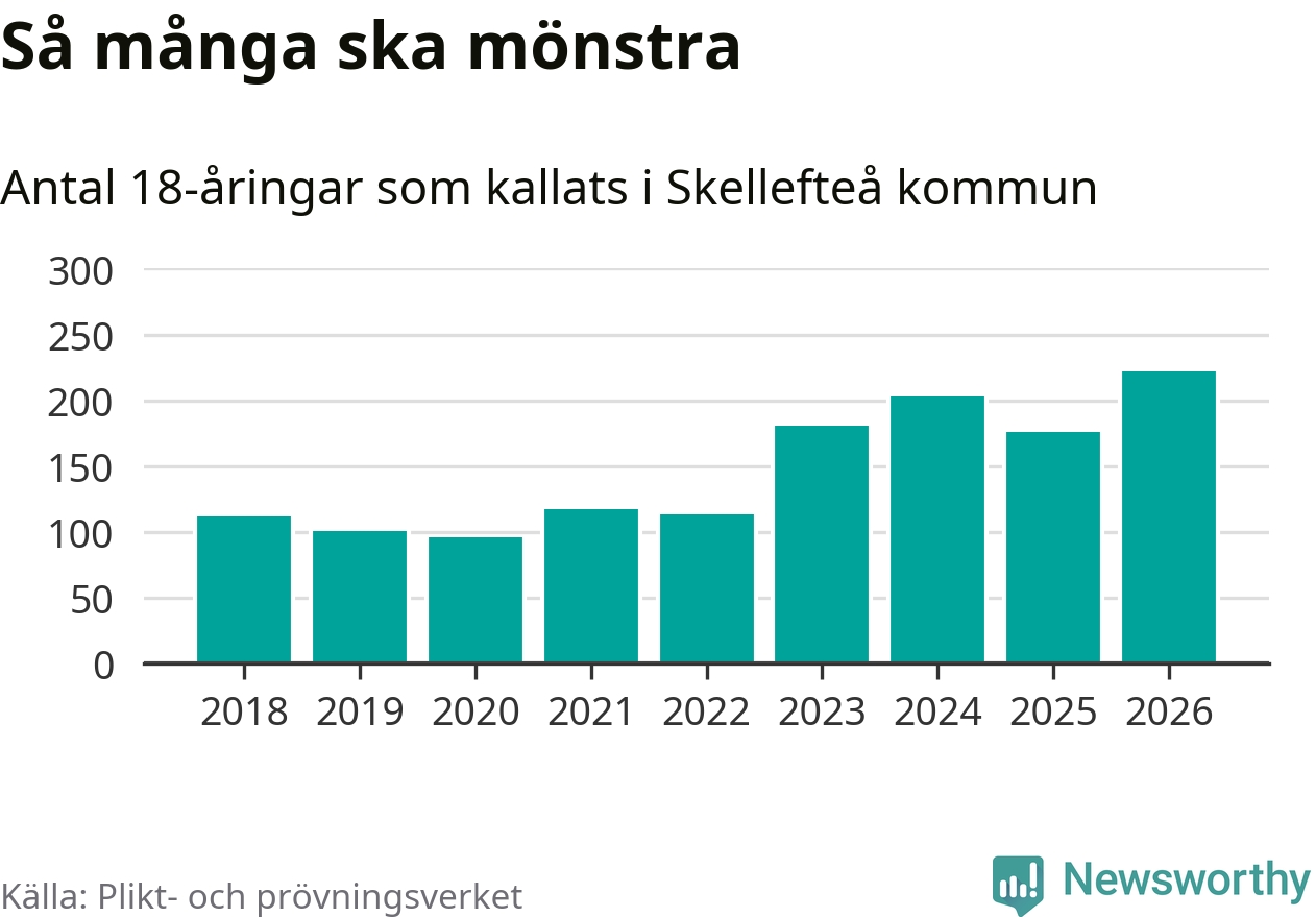 222 personer är det högsta antalet kallade i Skellefteå sedan 2018, som är första året med statistik på kommunnivå (värnplikten återinfördes 2017), och 46 mönstrande fler än 2025. Totalt från Västerbottens län kallas 878 personer i år.