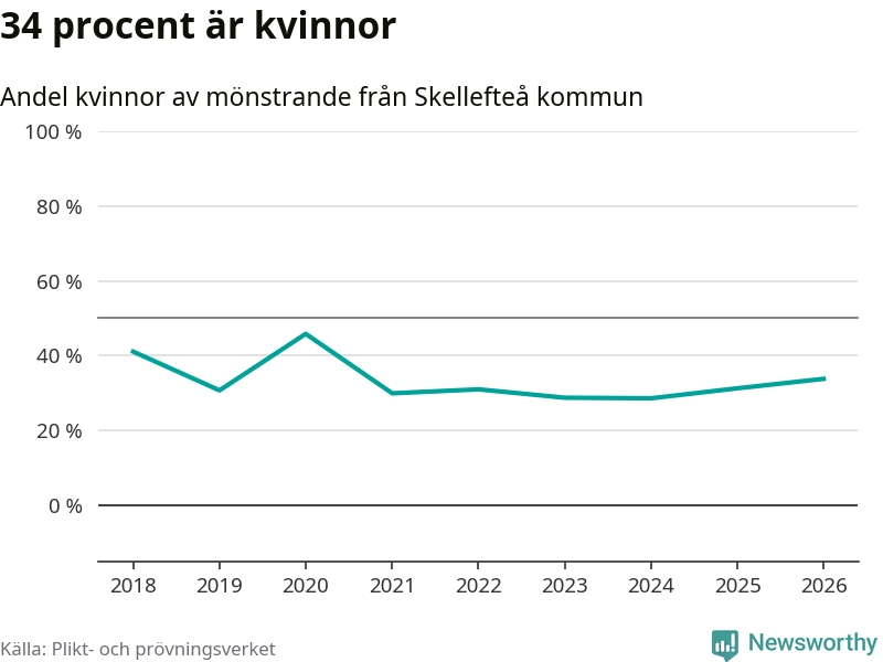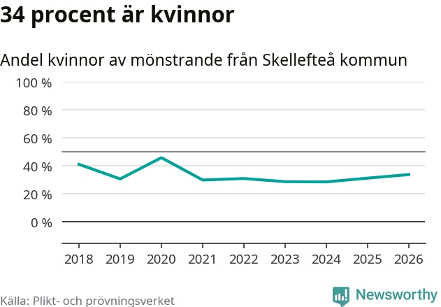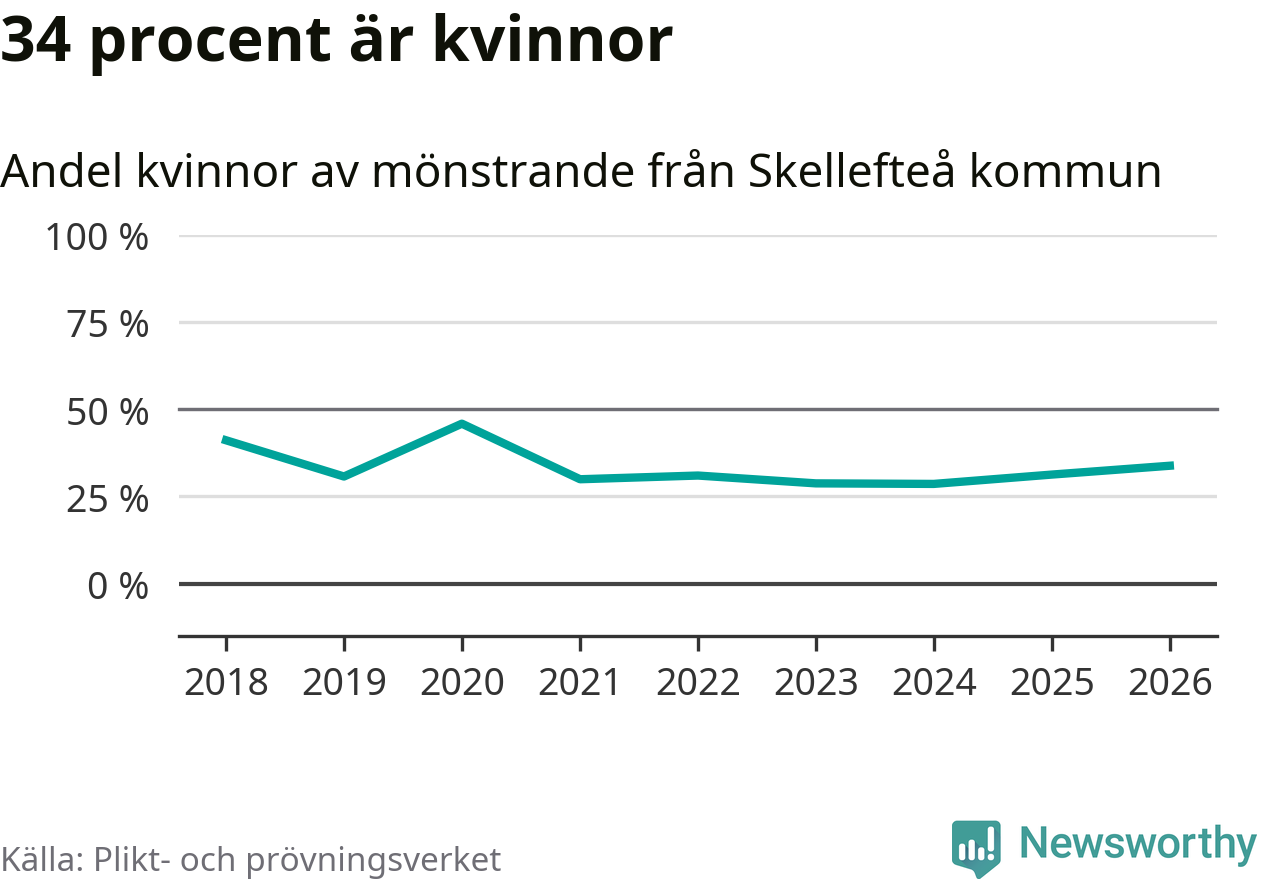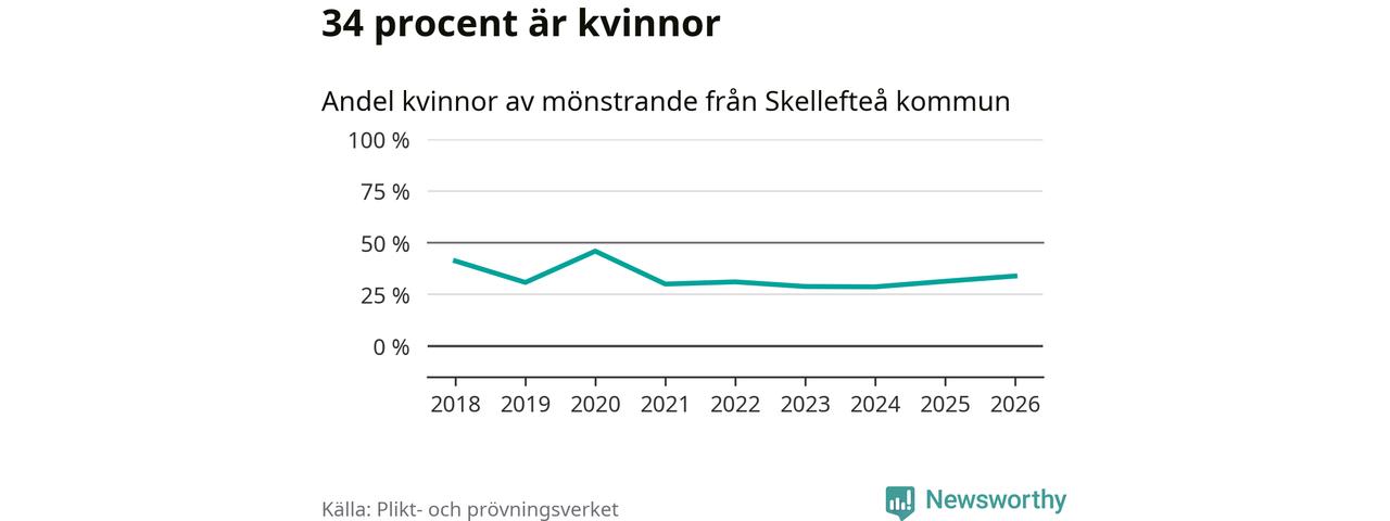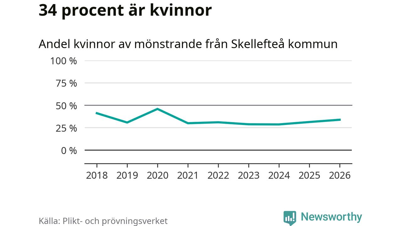 75 av de som kallats till mönstring från Skellefteå är kvinnor, vilket motsvarar 34 procent av de mönstrande. I absoluta tal är det fler kvinnor än något år sedan värnplikten återinfördes, men 2020 var en större andel av de mönstrande från kommunen kvinnor (46 procent). I riket som helhet är 28 procent av de mönstrande tjejer.