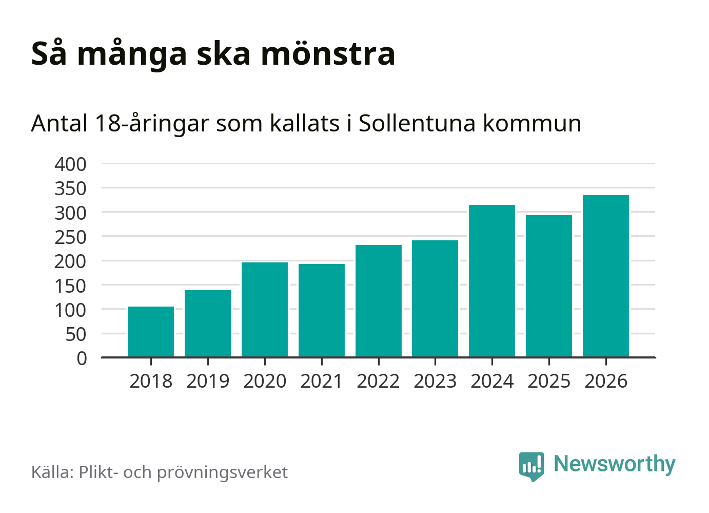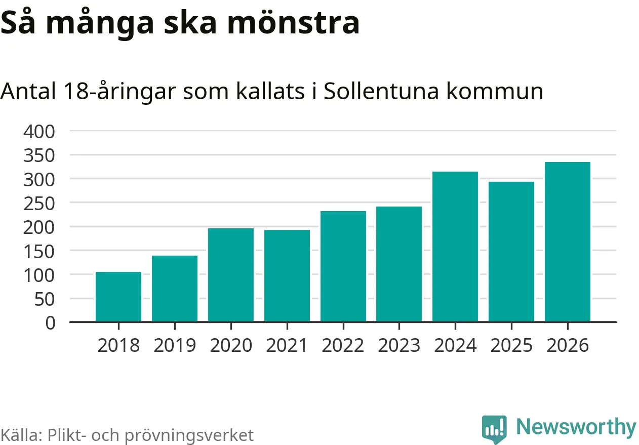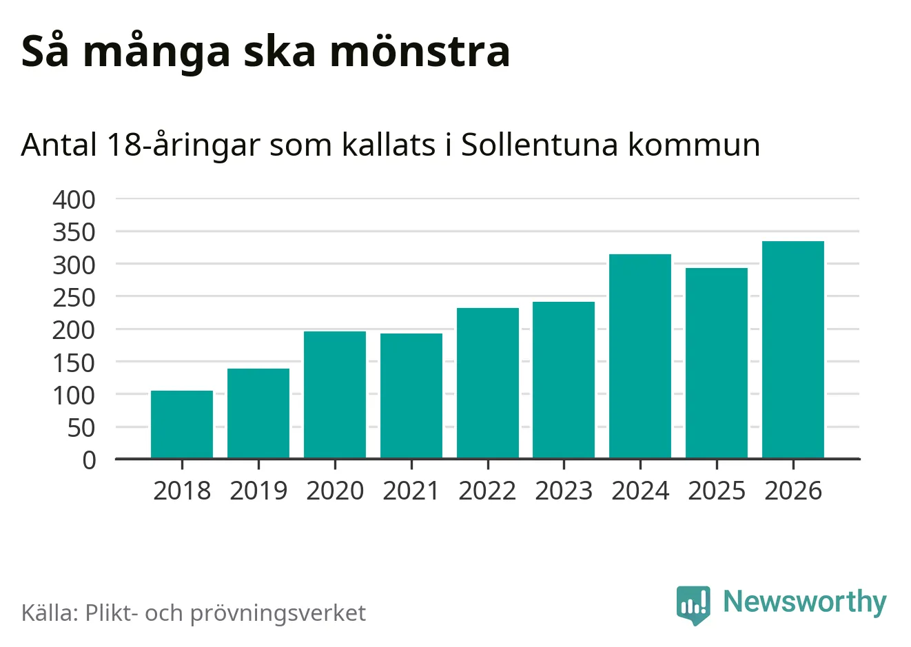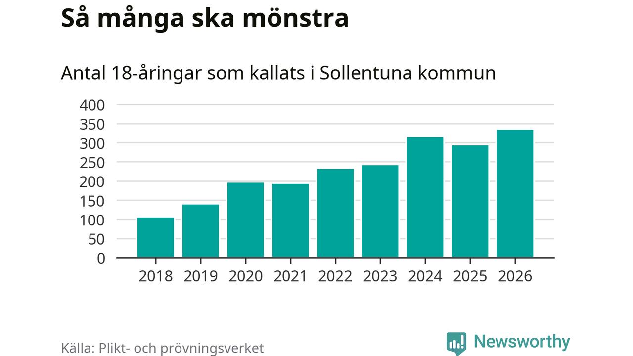 334 personer är det högsta antalet kallade i Sollentuna sedan 2018, som är första året med statistik på kommunnivå (värnplikten återinfördes 2017), och 41 mönstrande fler än 2025. Totalt från Stockholms län kallas 7 137 personer i år.