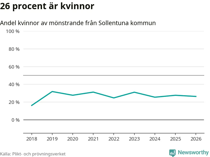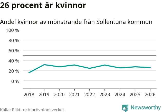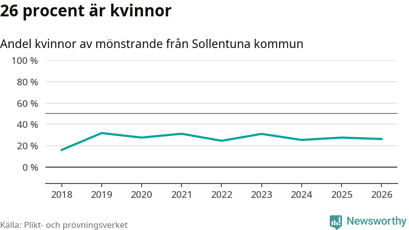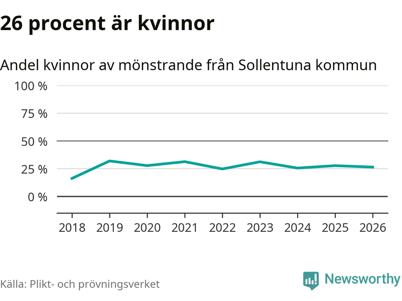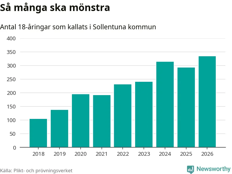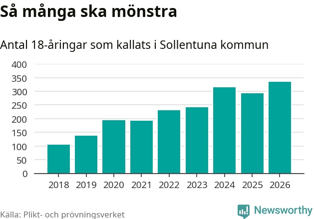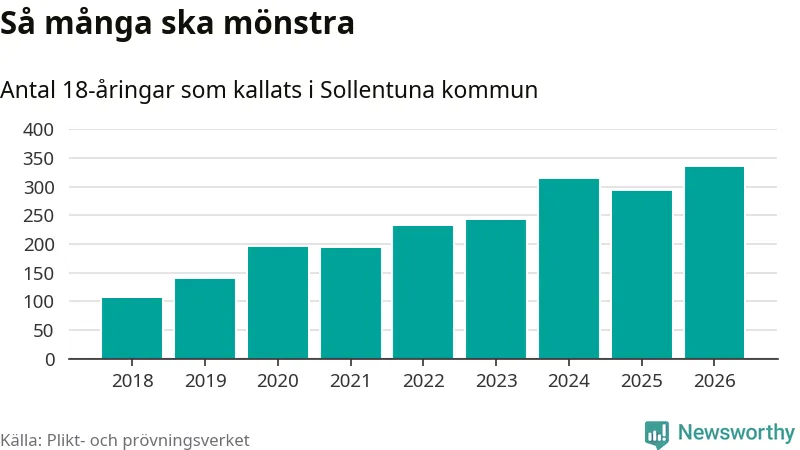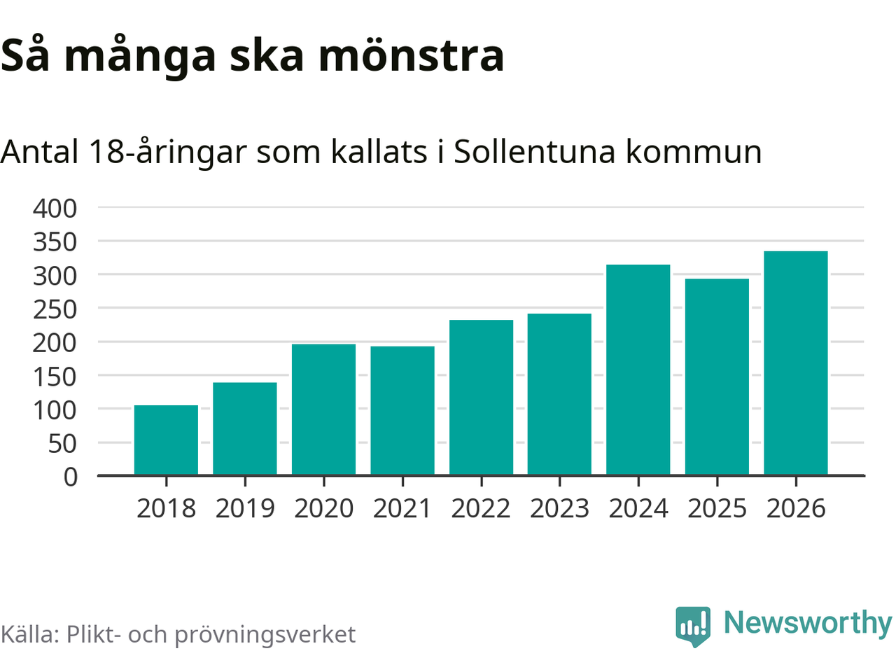 334 personer är det högsta antalet kallade i Sollentuna sedan 2018, som är första året med statistik på kommunnivå (värnplikten återinfördes 2017), och 41 mönstrande fler än 2025. Totalt från Stockholms län kallas 7 137 personer i år.