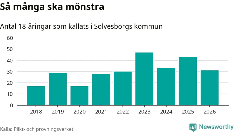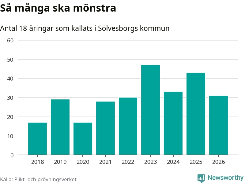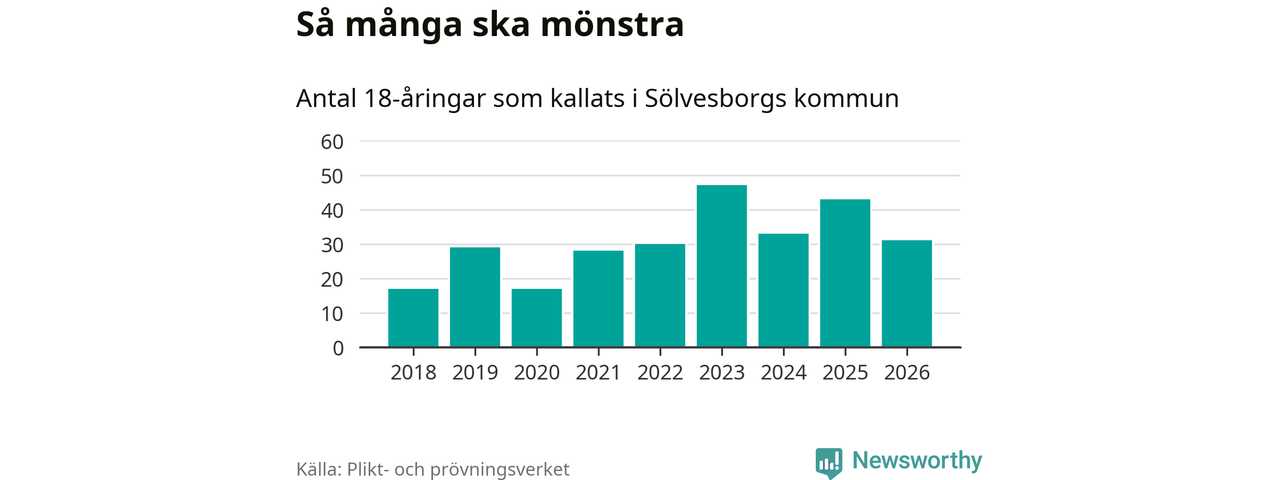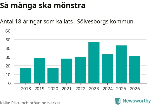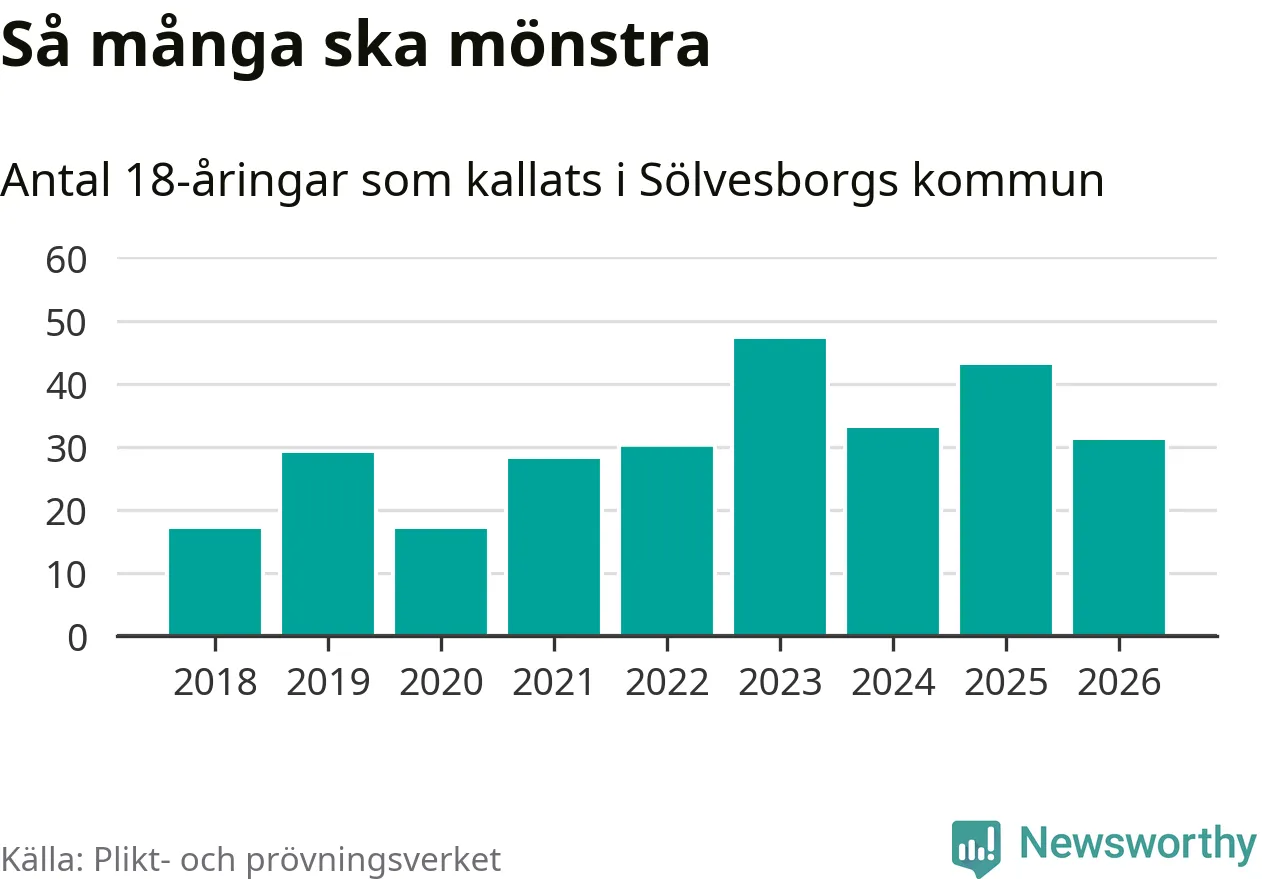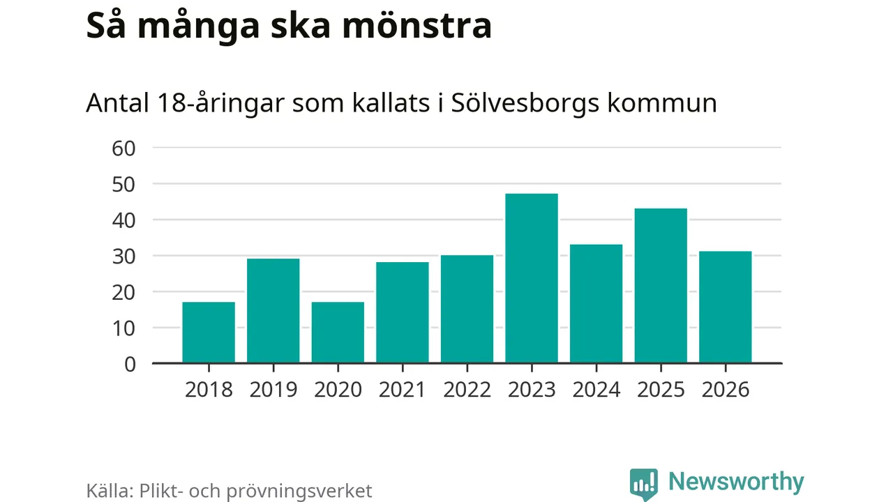 Nu kallas omkring 30 000 svenskar födda 2008 till mönstring. Och 31 av dem kommer från Sölvesborg, enligt ny statistik från Plikt- och prövningsverket. Det innebär att var sjätte invånare i åldersgruppen i kommunen kallas till mönstring. Det är en lägre andel än i Blekinge totalt. I riket som helhet kallas nästan var fjärde person i årskullen.