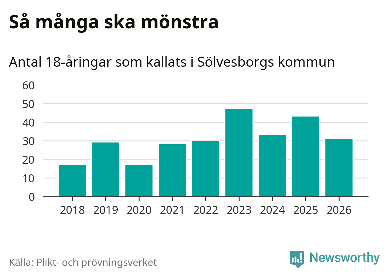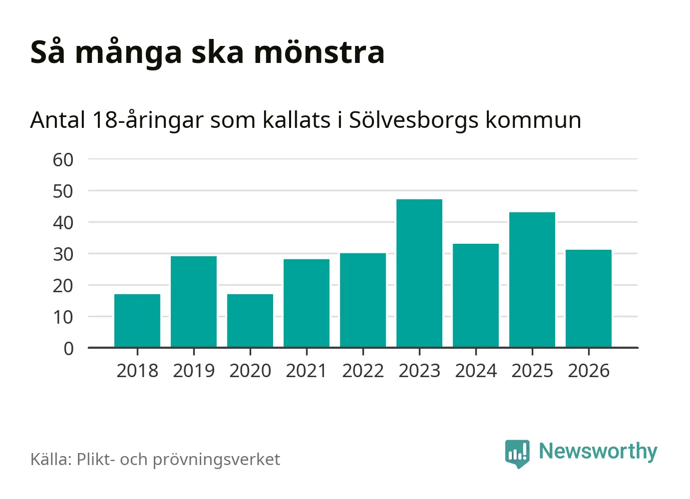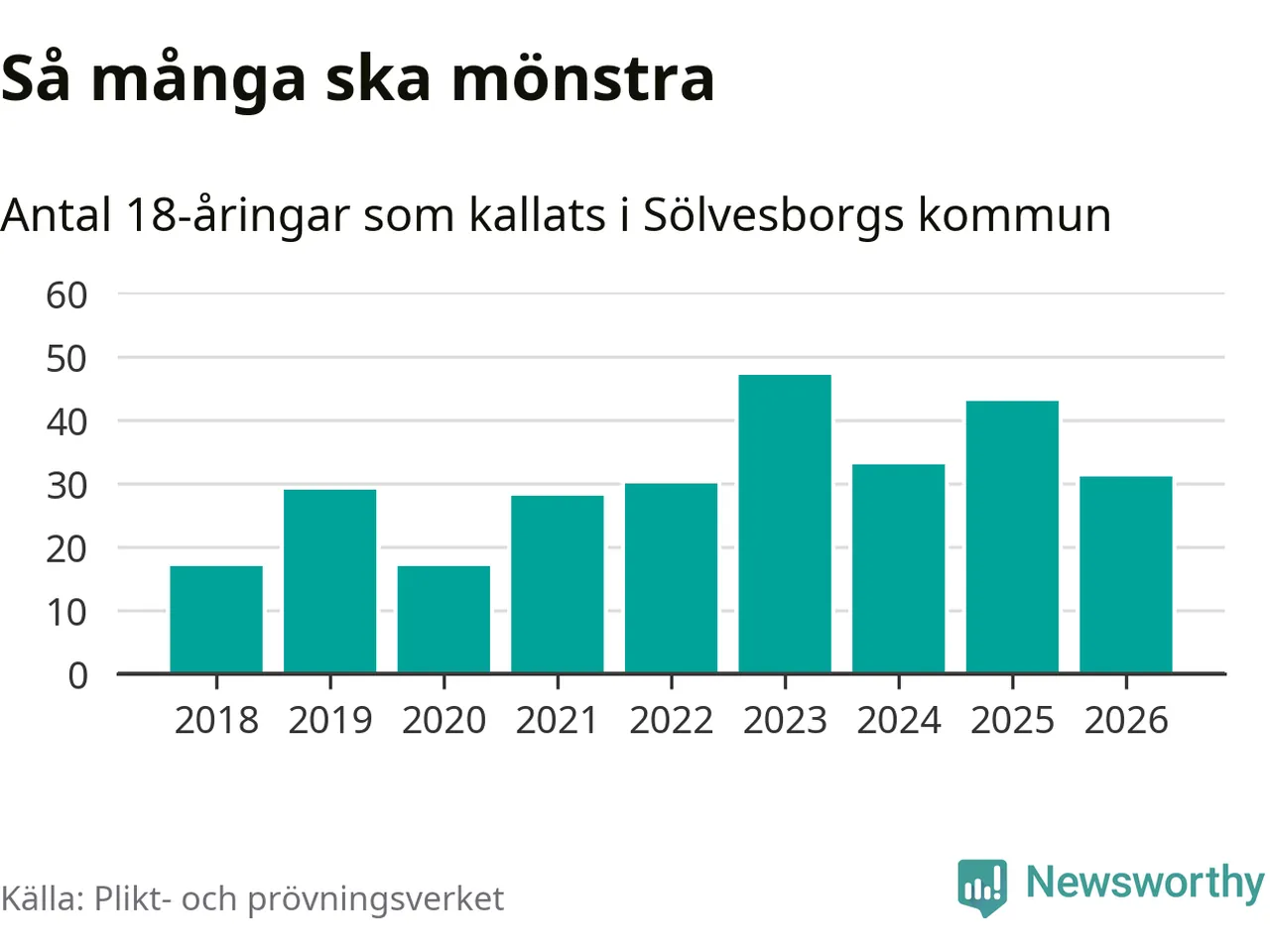 Nu kallas omkring 30 000 svenskar födda 2008 till mönstring. Och 31 av dem kommer från Sölvesborg, enligt ny statistik från Plikt- och prövningsverket. Det innebär att var sjätte invånare i åldersgruppen i kommunen kallas till mönstring. Det är en lägre andel än i Blekinge totalt. I riket som helhet kallas nästan var fjärde person i årskullen.