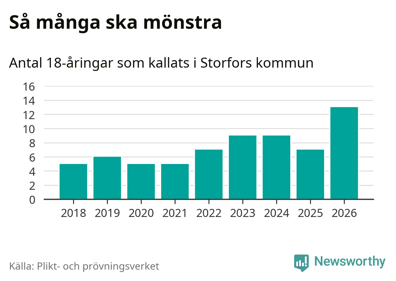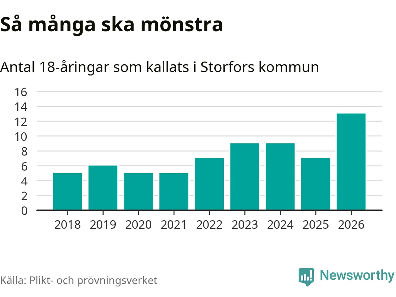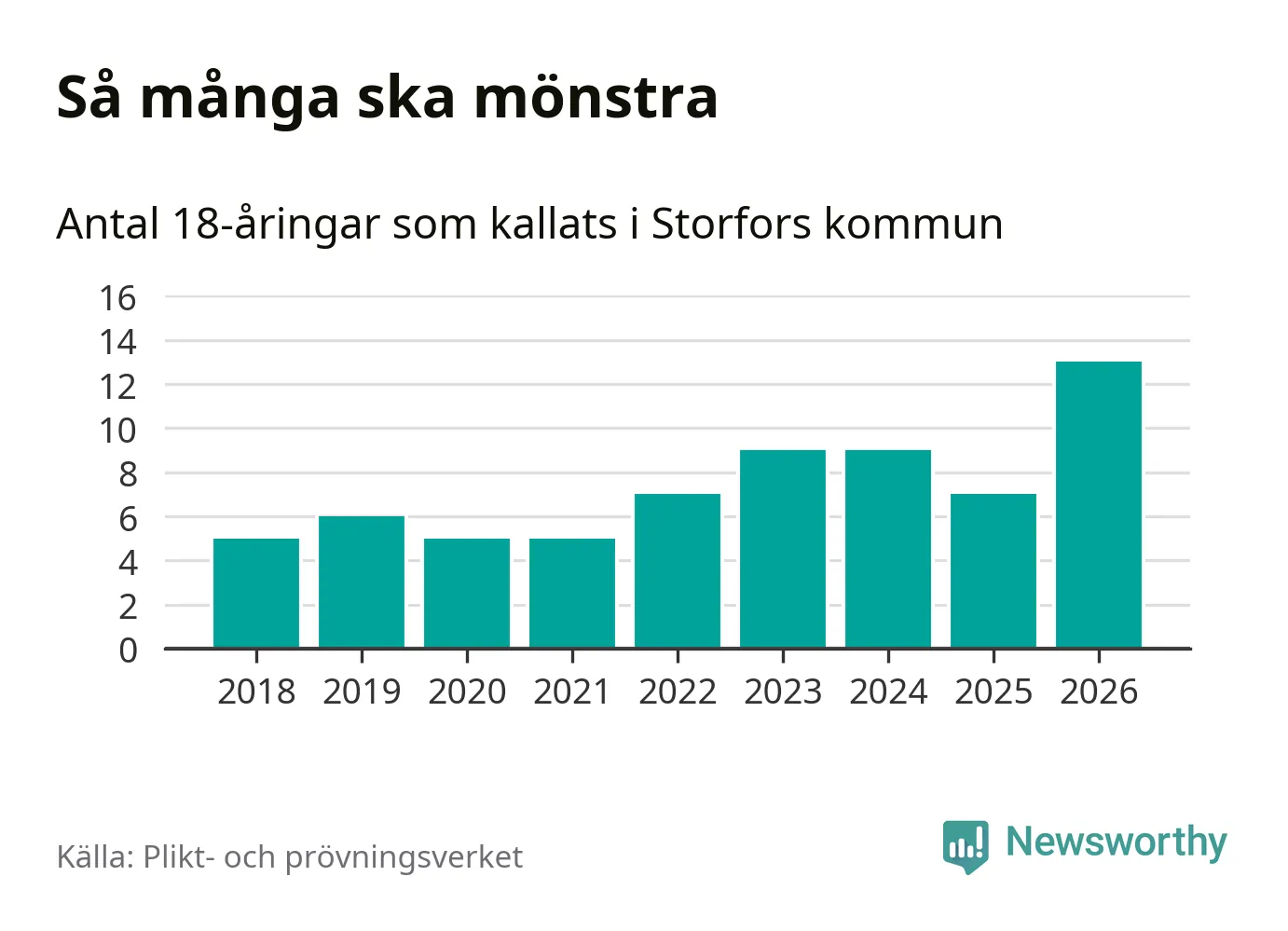 13 personer är det högsta antalet kallade i Storfors sedan 2018, som är första året med statistik på kommunnivå (värnplikten återinfördes 2017), och sex mönstrande fler än 2025. Totalt från Värmlands län kallas 730 personer i år.