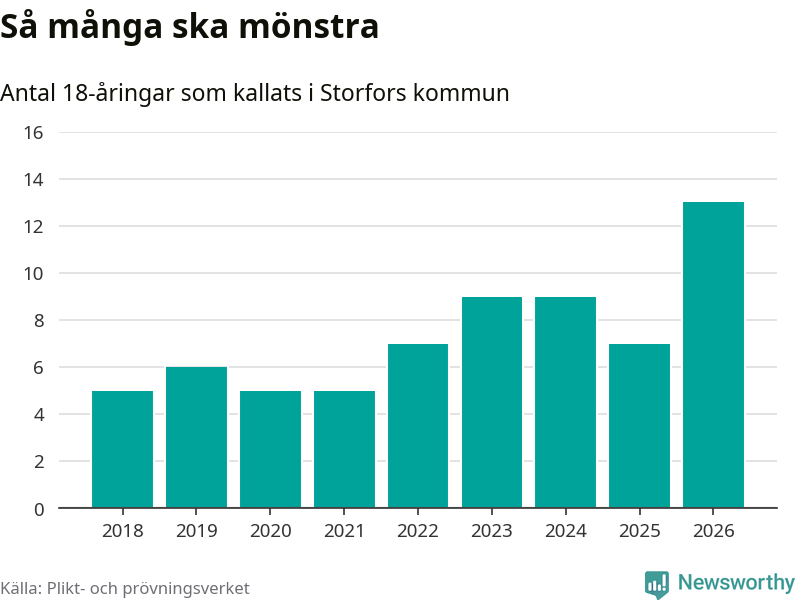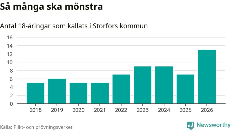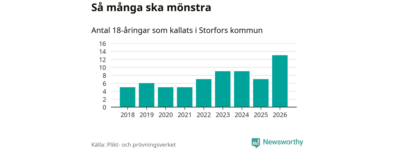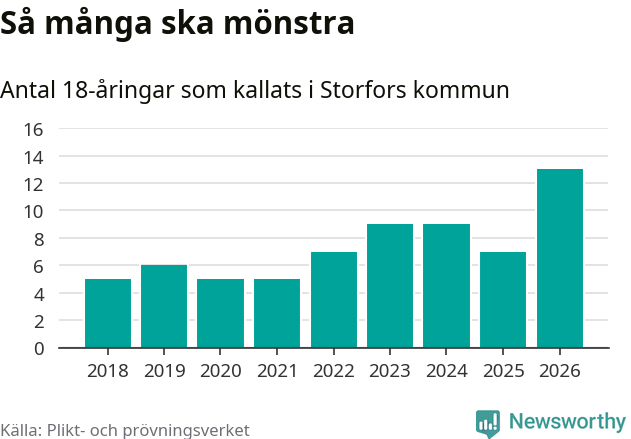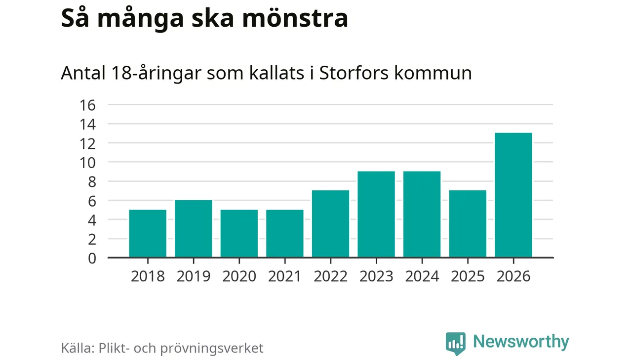 13 personer är det högsta antalet kallade i Storfors sedan 2018, som är första året med statistik på kommunnivå (värnplikten återinfördes 2017), och sex mönstrande fler än 2025. Totalt från Värmlands län kallas 730 personer i år.