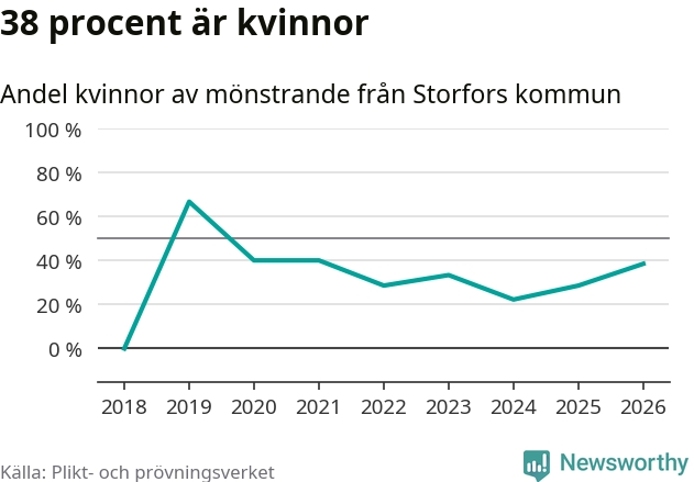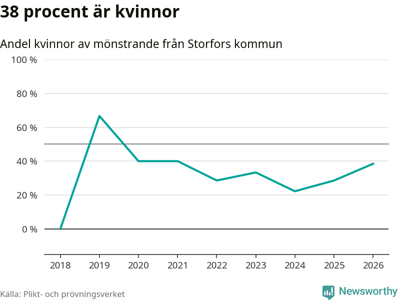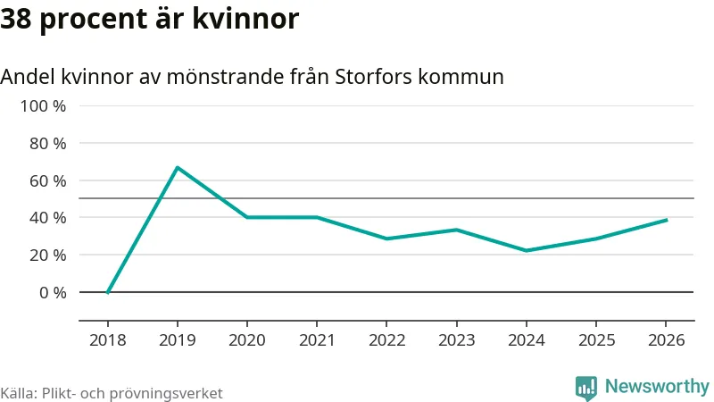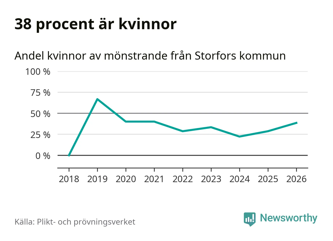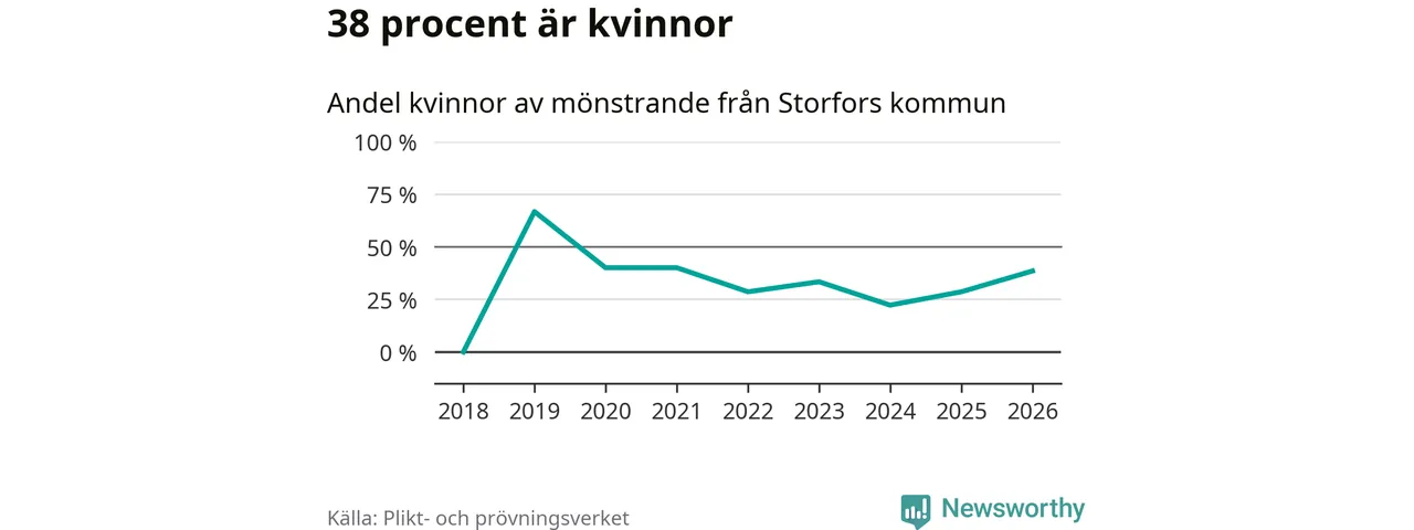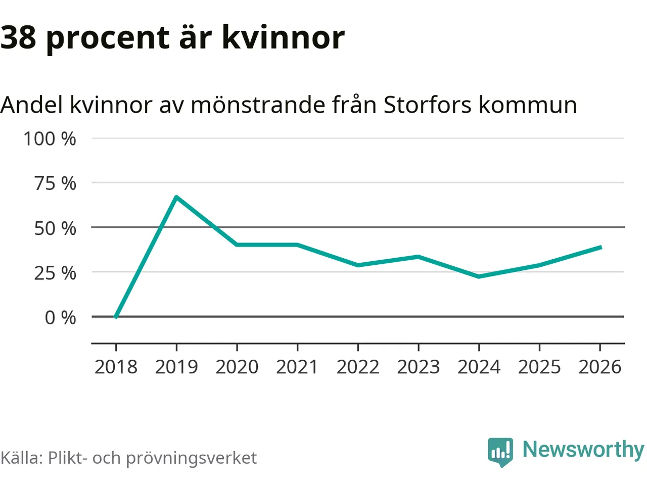 Fem av de som kallats till mönstring från Storfors är kvinnor, vilket motsvarar 38 procent av de mönstrande. I absoluta tal är det fler kvinnor än något år sedan värnplikten återinfördes, men 2019 var en större andel av de mönstrande från kommunen kvinnor (67 procent). I riket som helhet är 28 procent av de mönstrande tjejer.