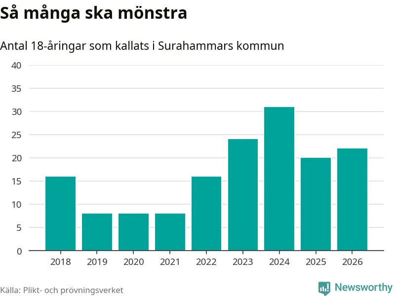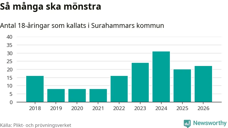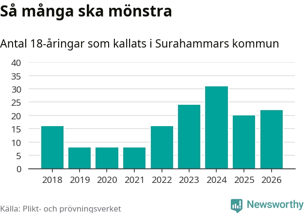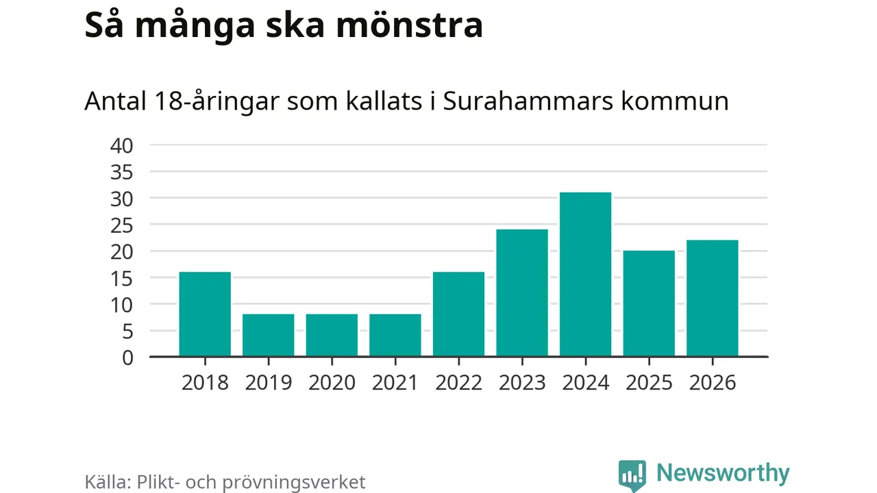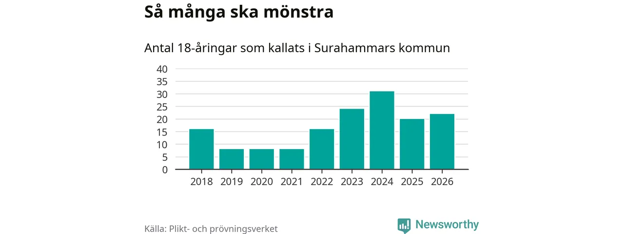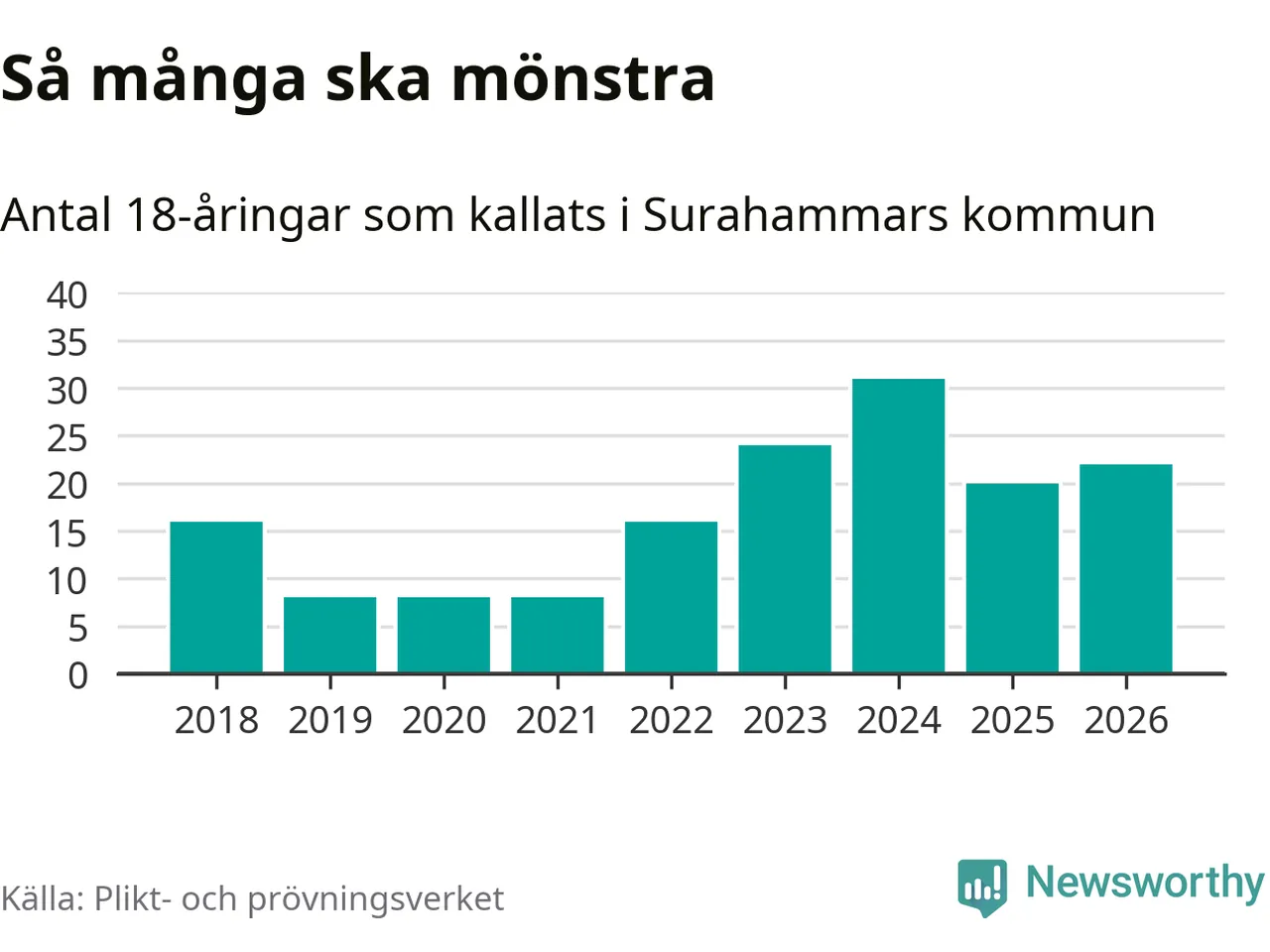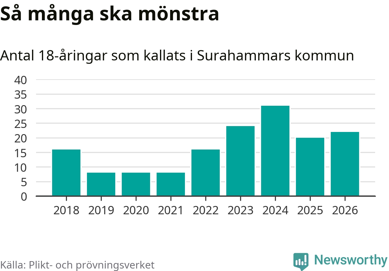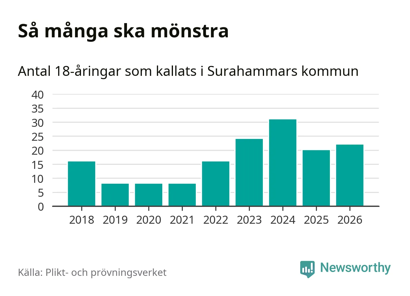 Nu kallas omkring 30 000 svenskar födda 2008 till mönstring. Och 22 av dem kommer från Surahammar, enligt ny statistik från Plikt- och prövningsverket. Det innebär att var femte invånare i åldersgruppen i kommunen kallas till mönstring. Det är en lägre andel än i Västmanland totalt. I riket som helhet kallas nästan var fjärde person i årskullen.