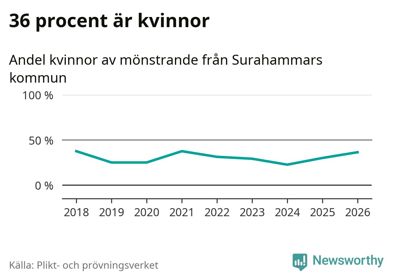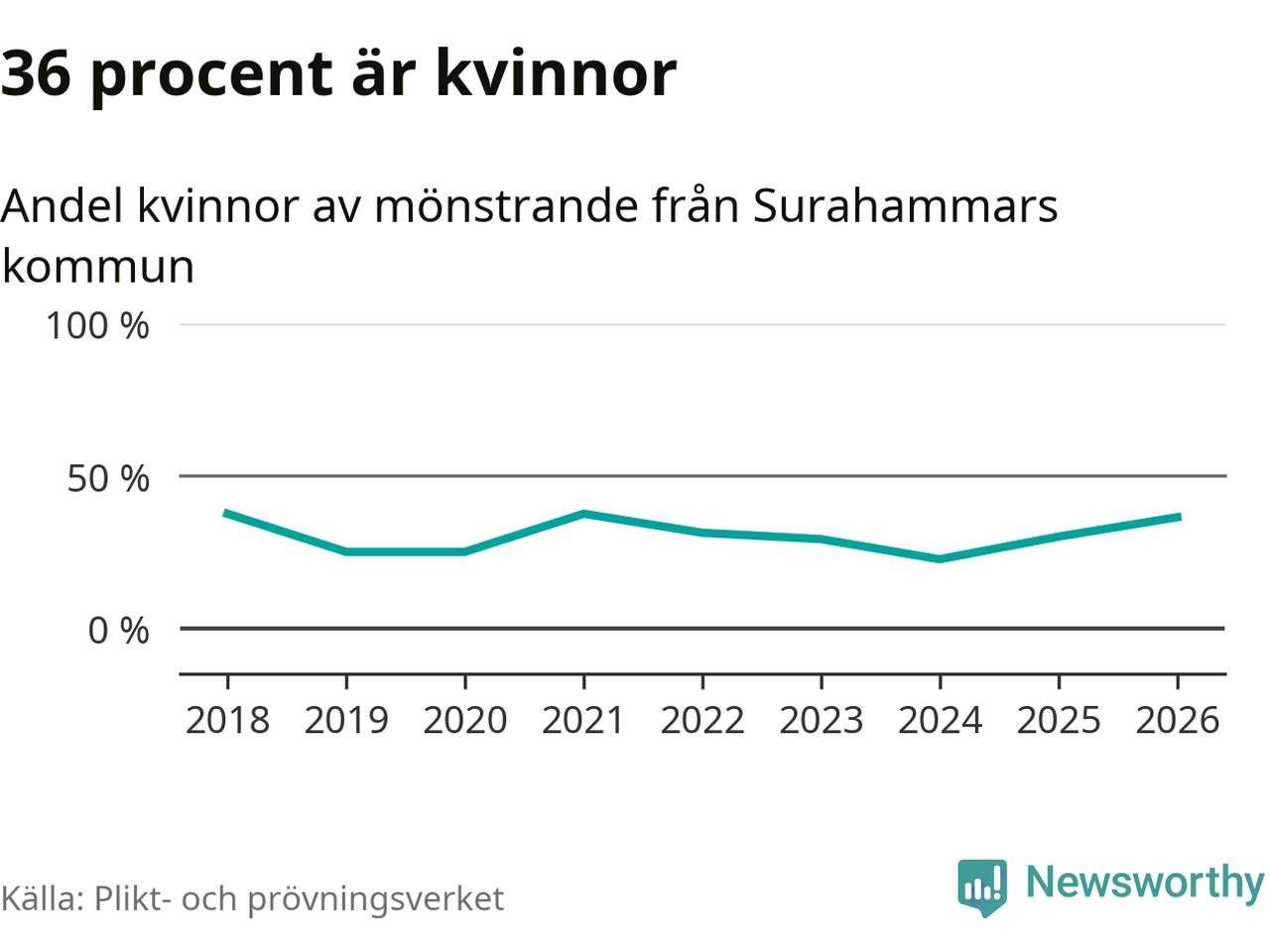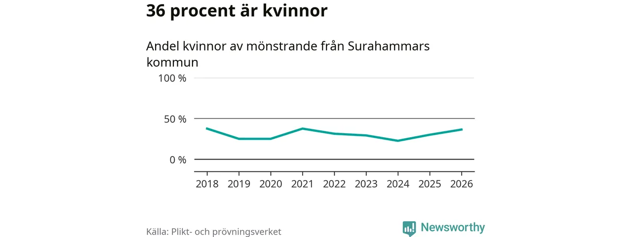 Åtta av de som kallats till mönstring från Surahammar är kvinnor, vilket motsvarar 36 procent av de mönstrande. I absoluta tal är det fler kvinnor än något år sedan värnplikten återinfördes, men 2021 och 2018 var en större andel av de mönstrande från kommunen kvinnor (38 procent). I riket som helhet är 28 procent av de mönstrande tjejer.