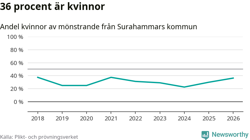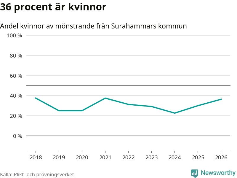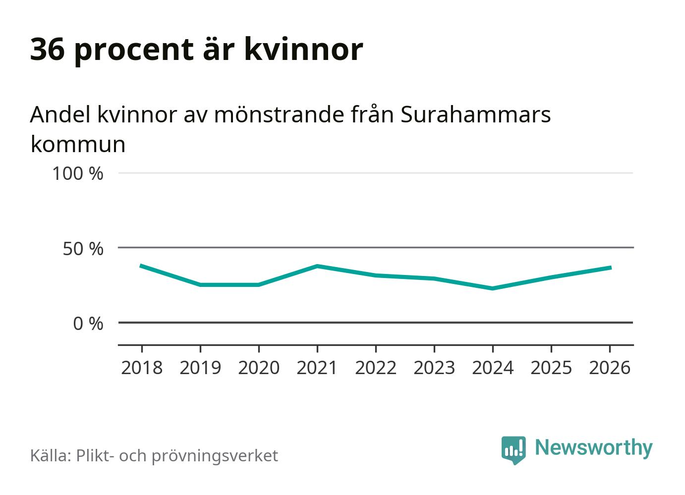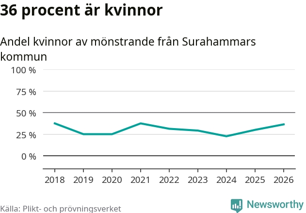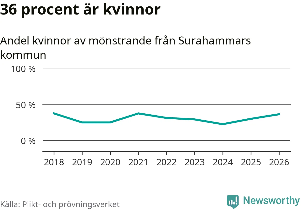 Åtta av de som kallats till mönstring från Surahammar är kvinnor, vilket motsvarar 36 procent av de mönstrande. I absoluta tal är det fler kvinnor än något år sedan värnplikten återinfördes, men 2021 och 2018 var en större andel av de mönstrande från kommunen kvinnor (38 procent). I riket som helhet är 28 procent av de mönstrande tjejer.