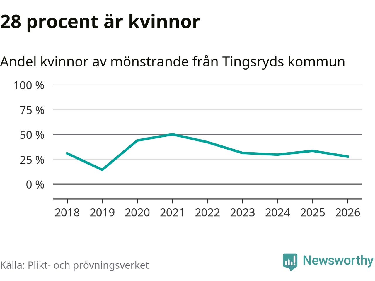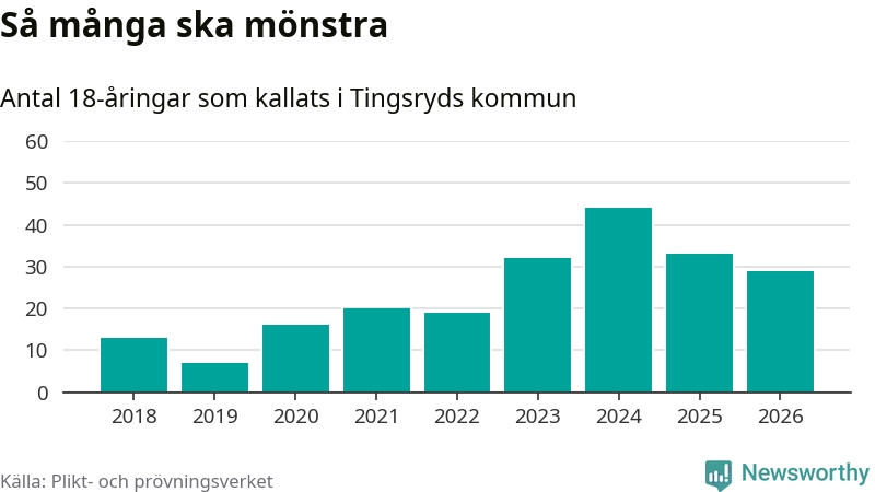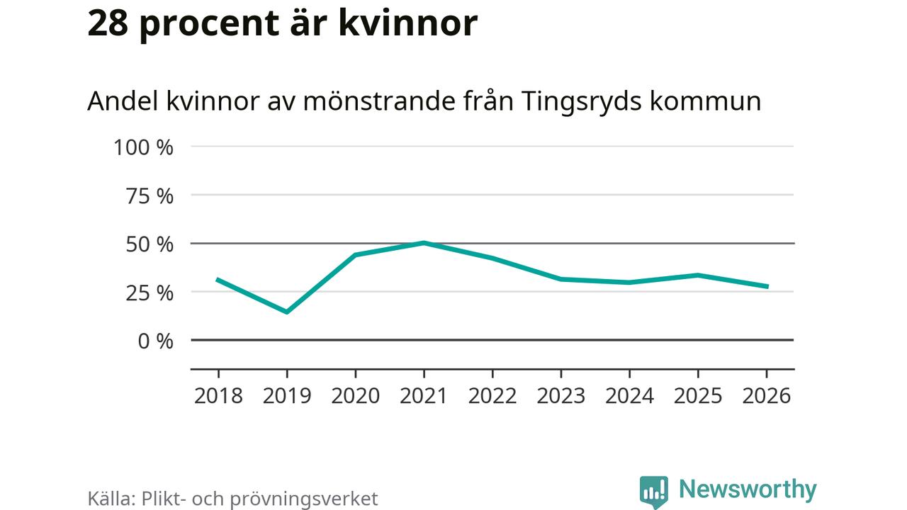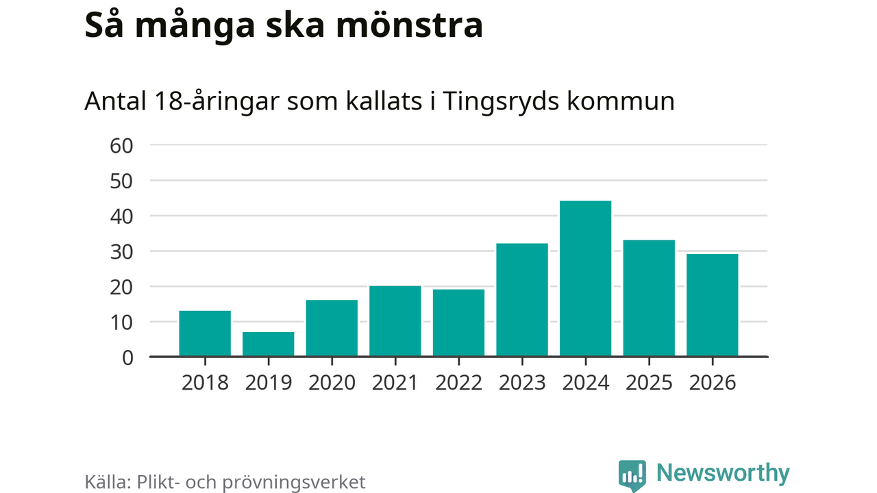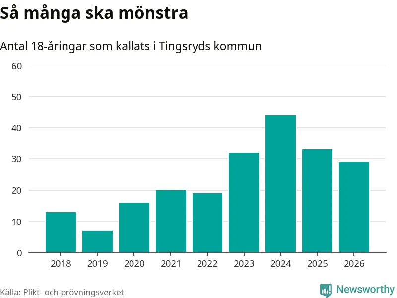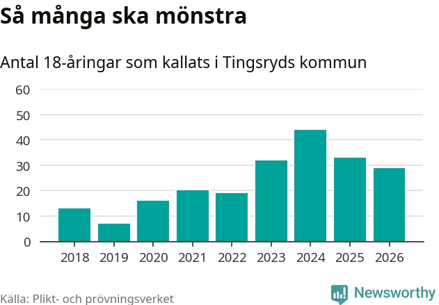 Nu kallas omkring 30 000 svenskar födda 2008 till mönstring. Och 29 av dem kommer från Tingsryd, enligt ny statistik från Plikt- och prövningsverket. Det innebär att var femte invånare i åldersgruppen i kommunen kallas till mönstring. Det är ungefär lika stor andel som i Kronoberg totalt. I riket som helhet kallas nästan var fjärde person i årskullen.
