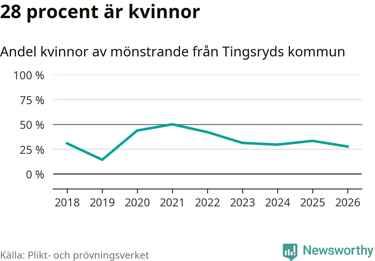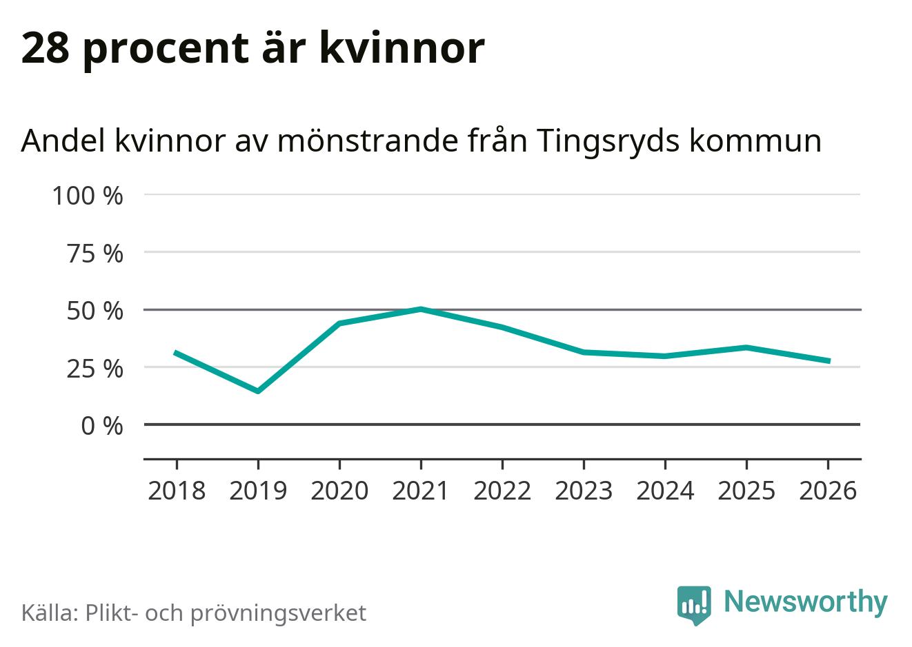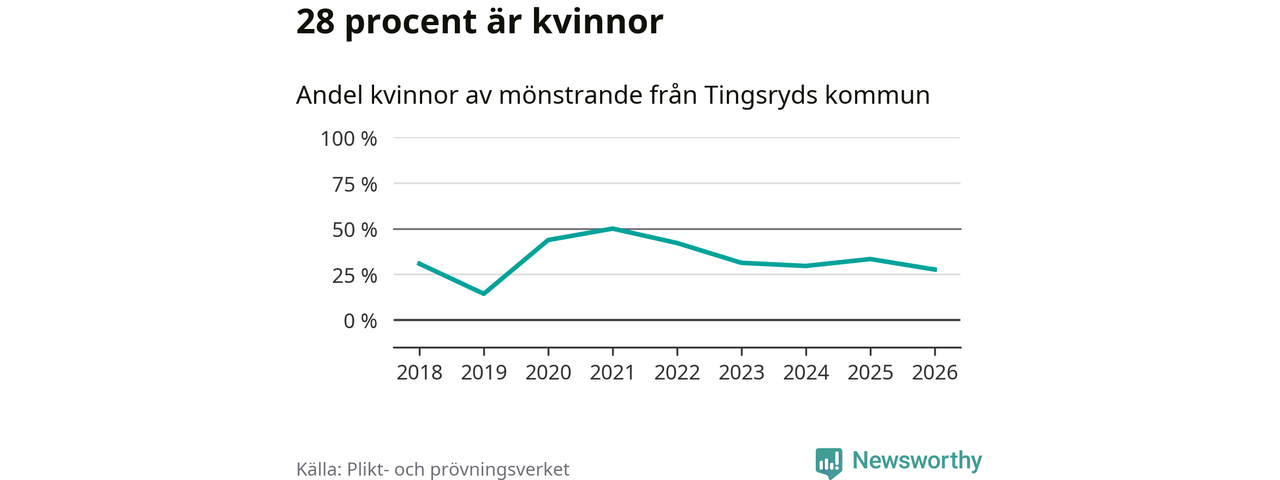 Åtta av de som kallats till mönstring från Tingsryd är kvinnor, vilket motsvarar 28 procent av de mönstrande. Som mest har 13 kvinnor kallats från kommunen (2024). I riket som helhet är 28 procent av de mönstrande tjejer.