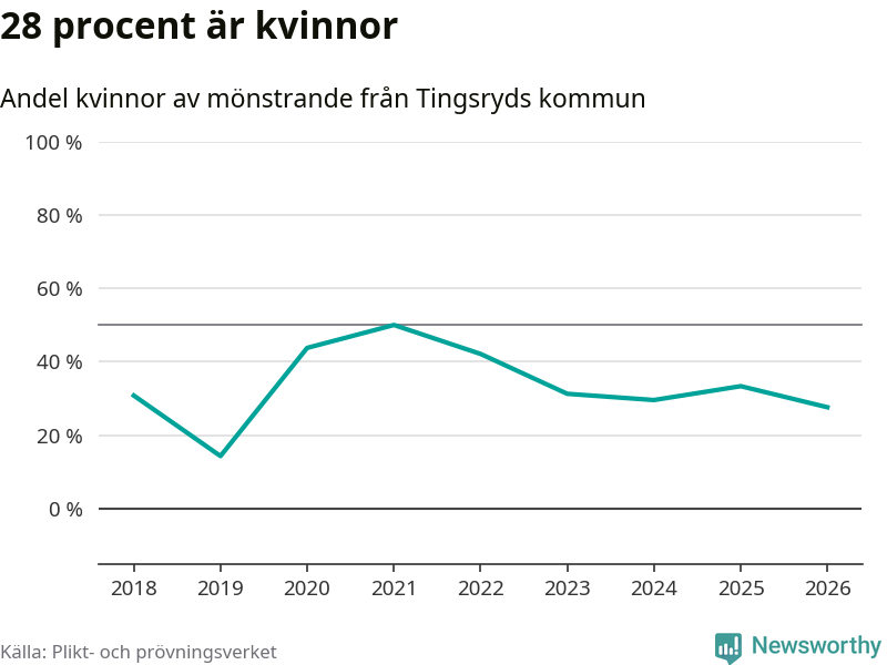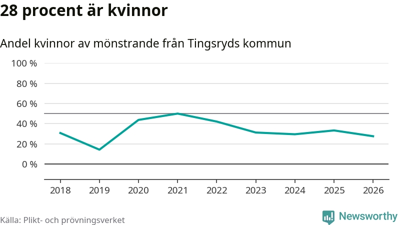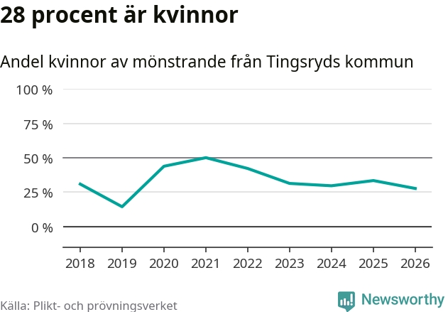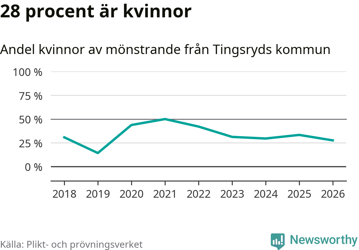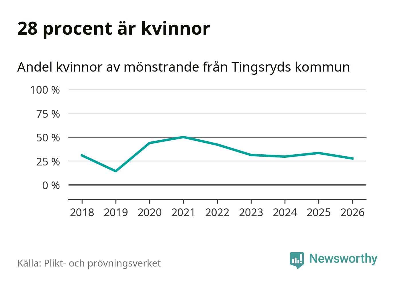 Åtta av de som kallats till mönstring från Tingsryd är kvinnor, vilket motsvarar 28 procent av de mönstrande. Som mest har 13 kvinnor kallats från kommunen (2024). I riket som helhet är 28 procent av de mönstrande tjejer.