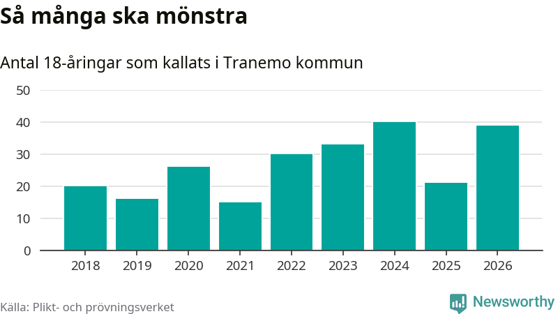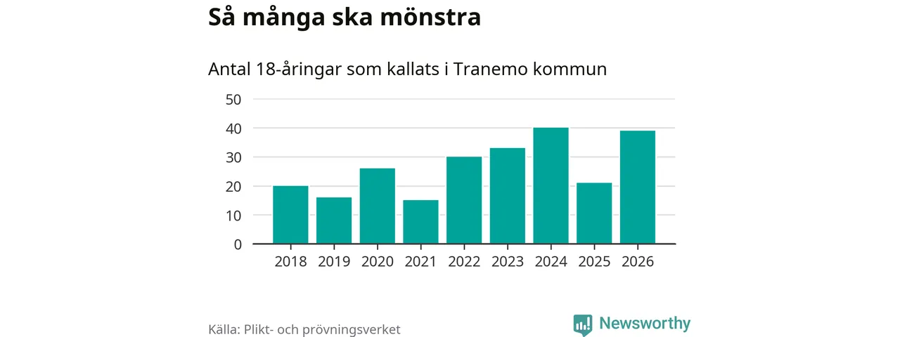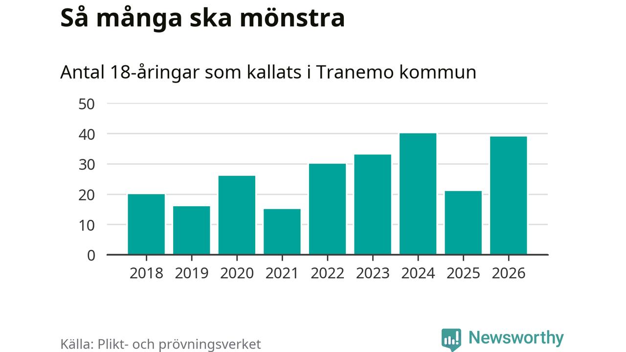 Nu kallas omkring 30 000 svenskar födda 2008 till mönstring. Och 39 av dem kommer från Tranemo, enligt ny statistik från Plikt- och prövningsverket. Det innebär att mer än var fjärde invånare i åldersgruppen i kommunen kallas till mönstring. Det är en högre andel än i Västra Götaland totalt. I riket som helhet kallas nästan var fjärde person i årskullen.