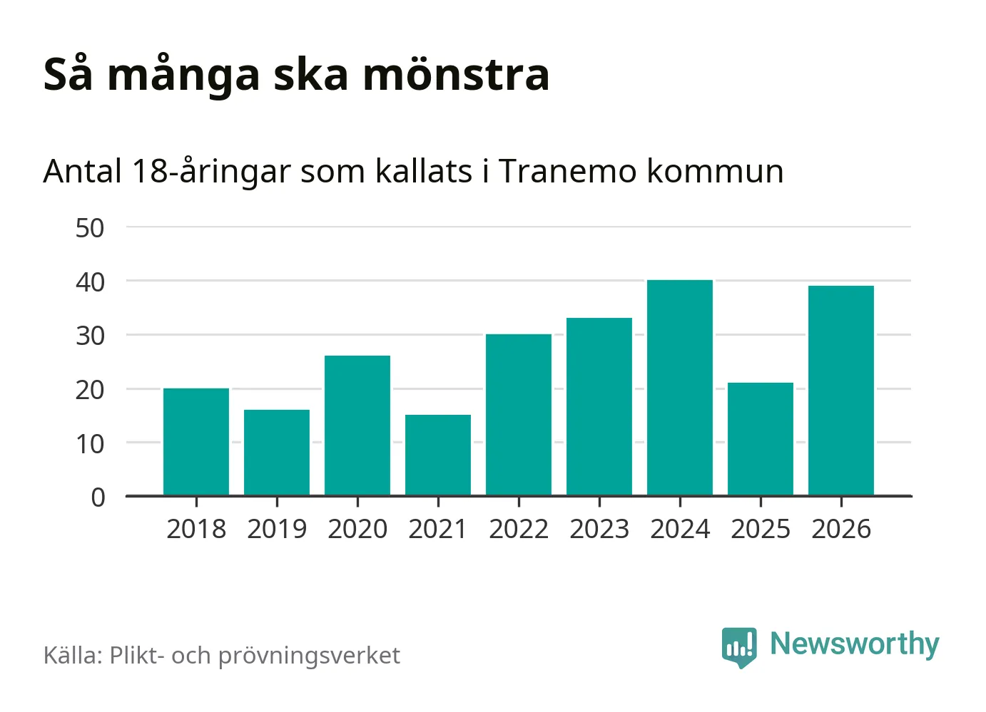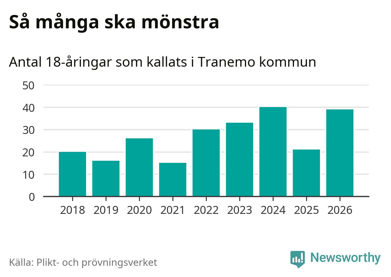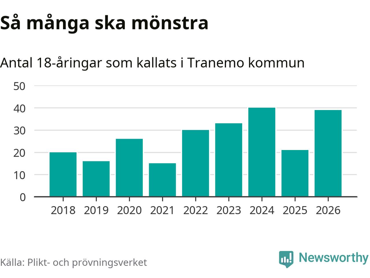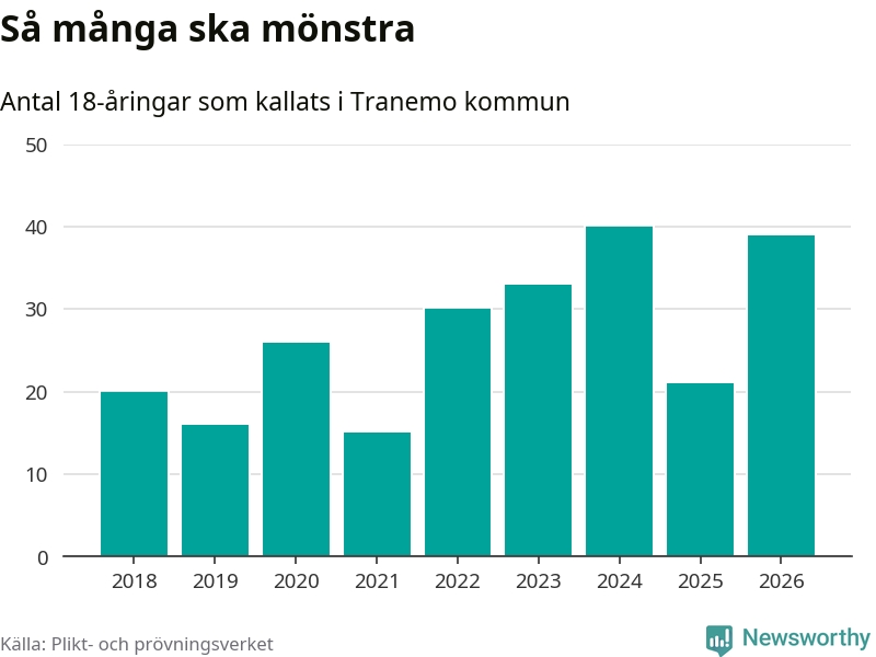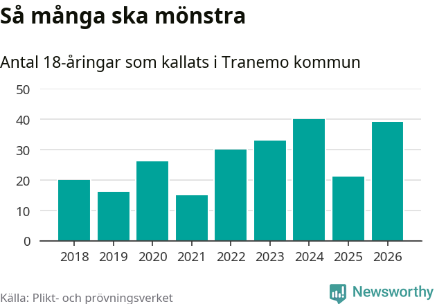 39 personer är 18 fler än 2025. Som mest har 40 personer från en årskull kommunen mönstrat (2024). Totalt från Västra Götalands län kallas 4 609 personer i år.