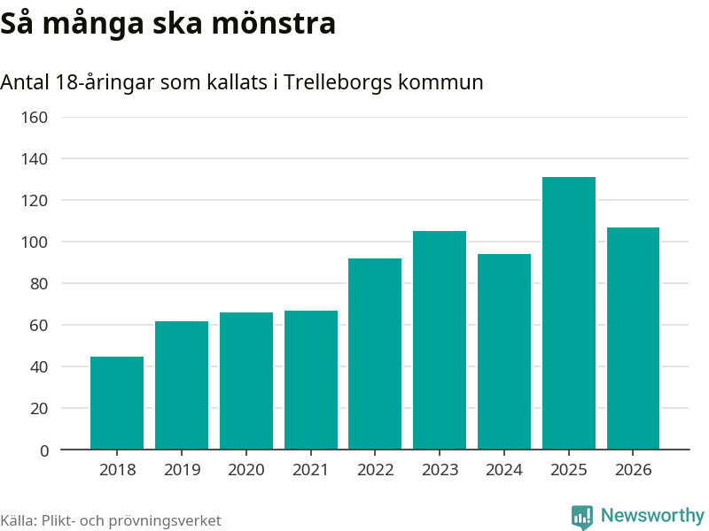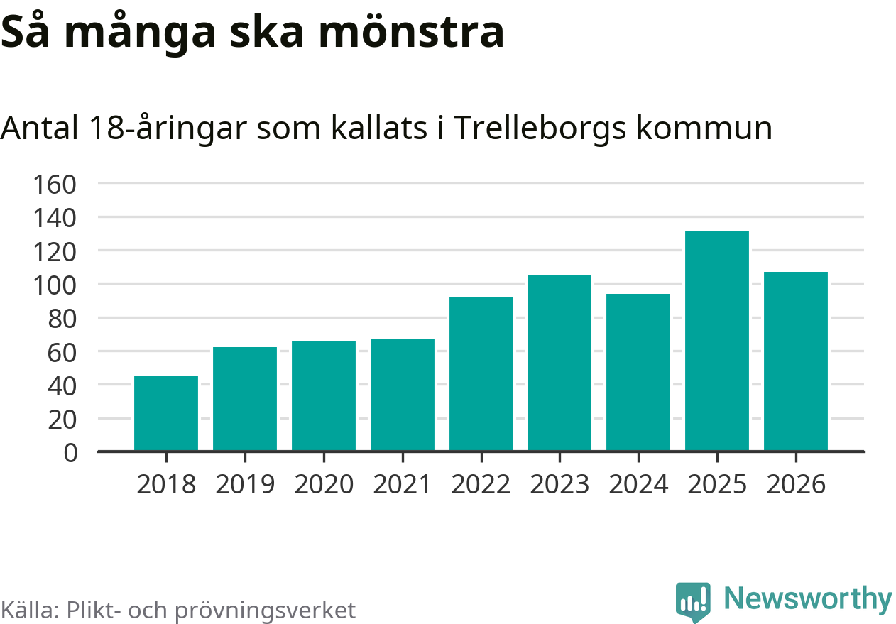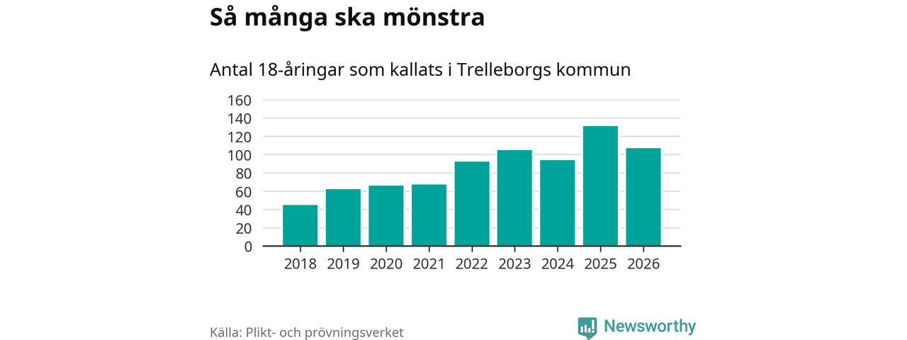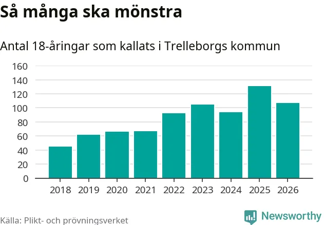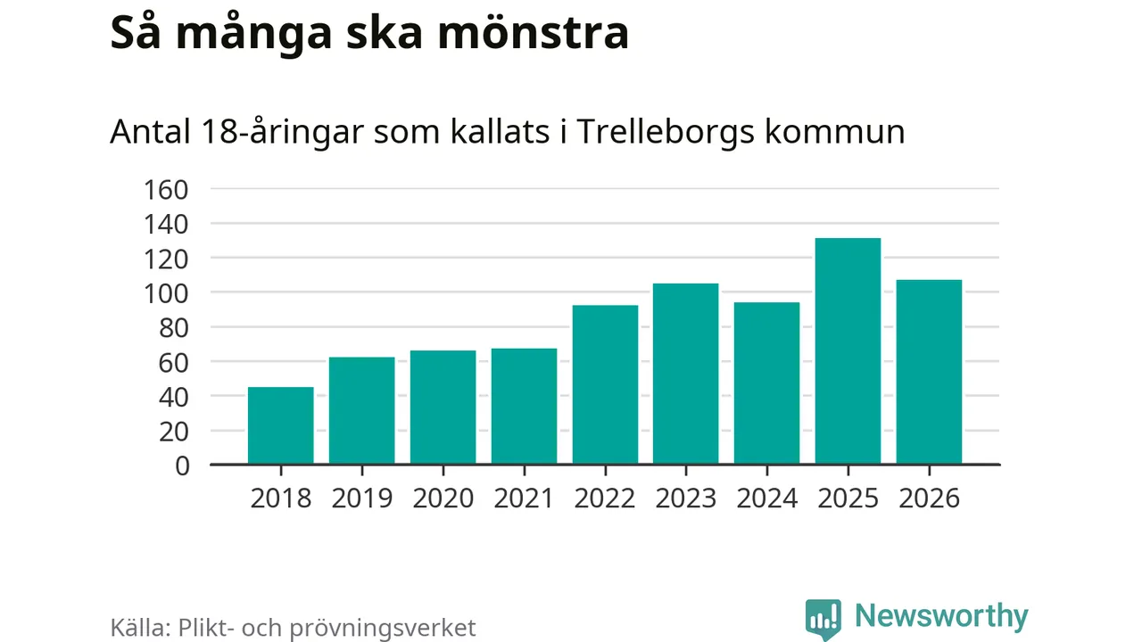 Nu kallas omkring 30 000 svenskar födda 2008 till mönstring. Och 107 av dem kommer från Trelleborg, enligt ny statistik från Plikt- och prövningsverket. Det innebär att var femte invånare i åldersgruppen i kommunen kallas till mönstring. Det är en lägre andel än i Skåne totalt. I riket som helhet kallas nästan var fjärde person i årskullen.