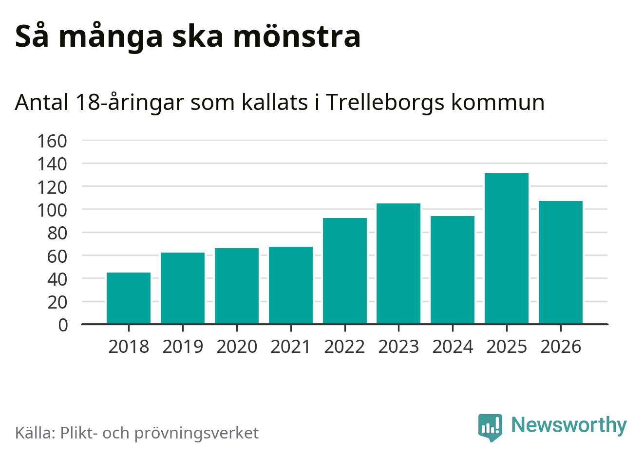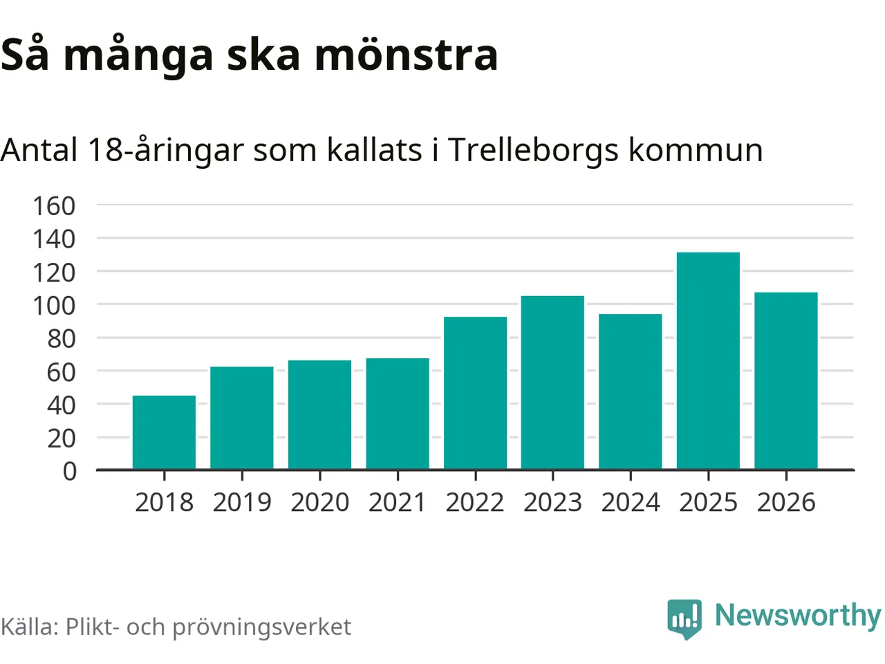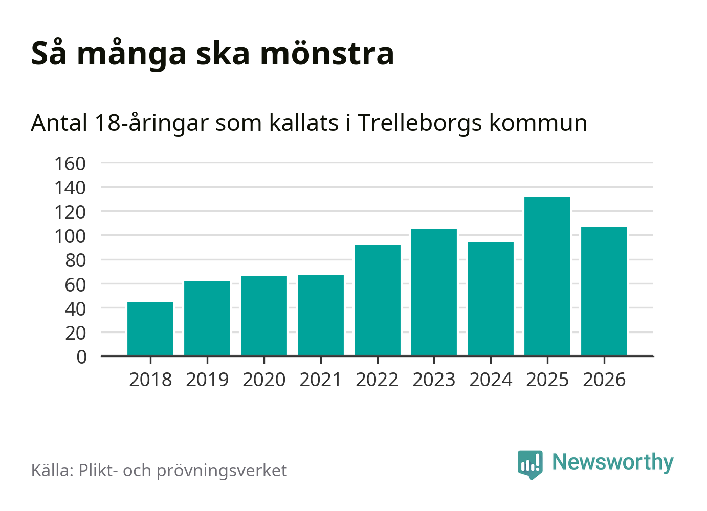 Nu kallas omkring 30 000 svenskar födda 2008 till mönstring. Och 107 av dem kommer från Trelleborg, enligt ny statistik från Plikt- och prövningsverket. Det innebär att var femte invånare i åldersgruppen i kommunen kallas till mönstring. Det är en lägre andel än i Skåne totalt. I riket som helhet kallas nästan var fjärde person i årskullen.
