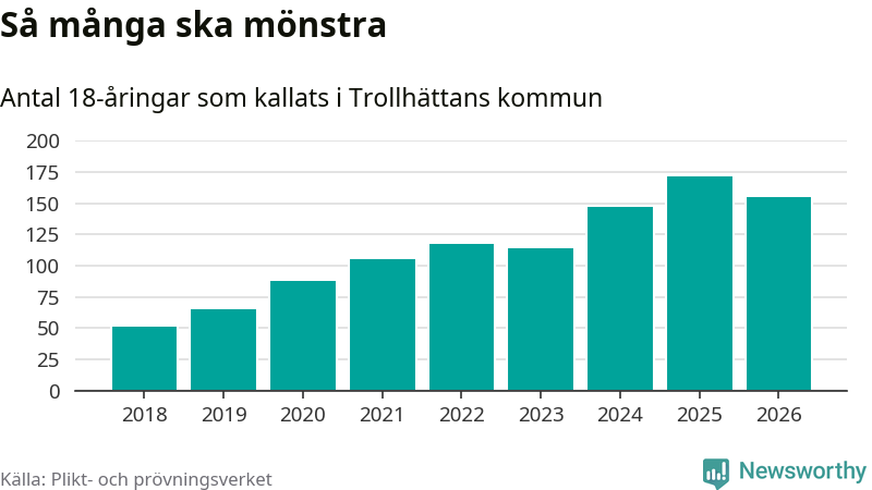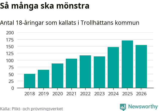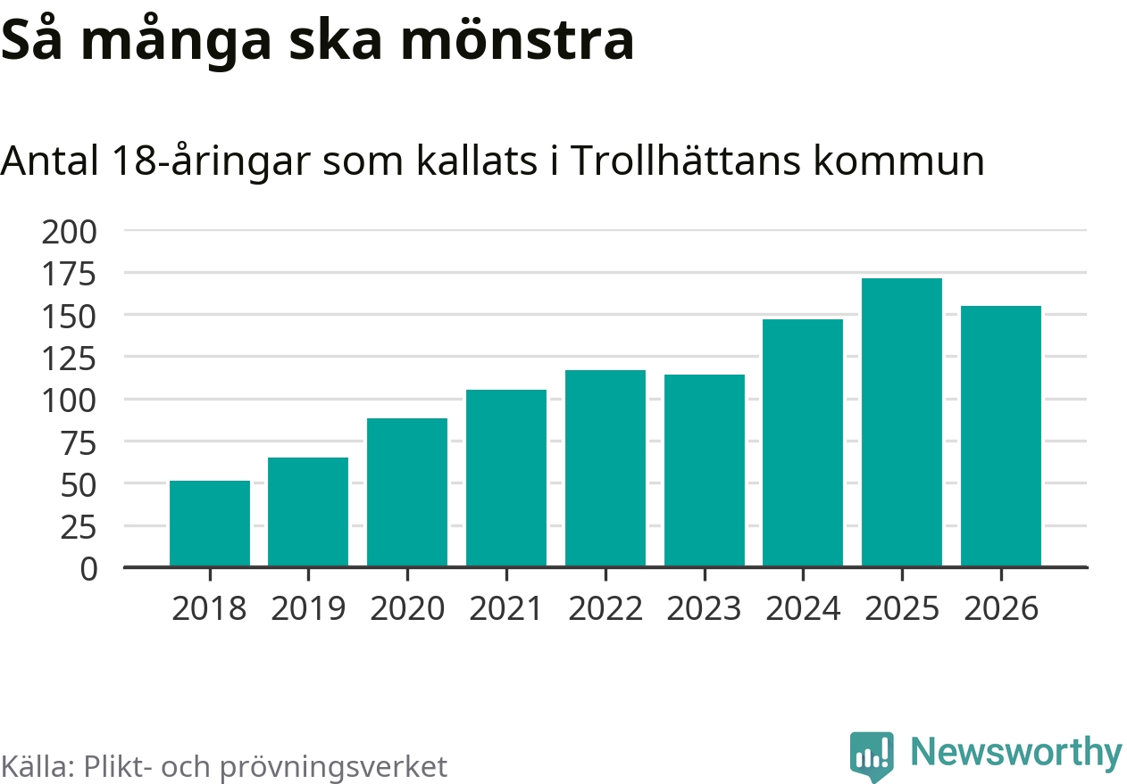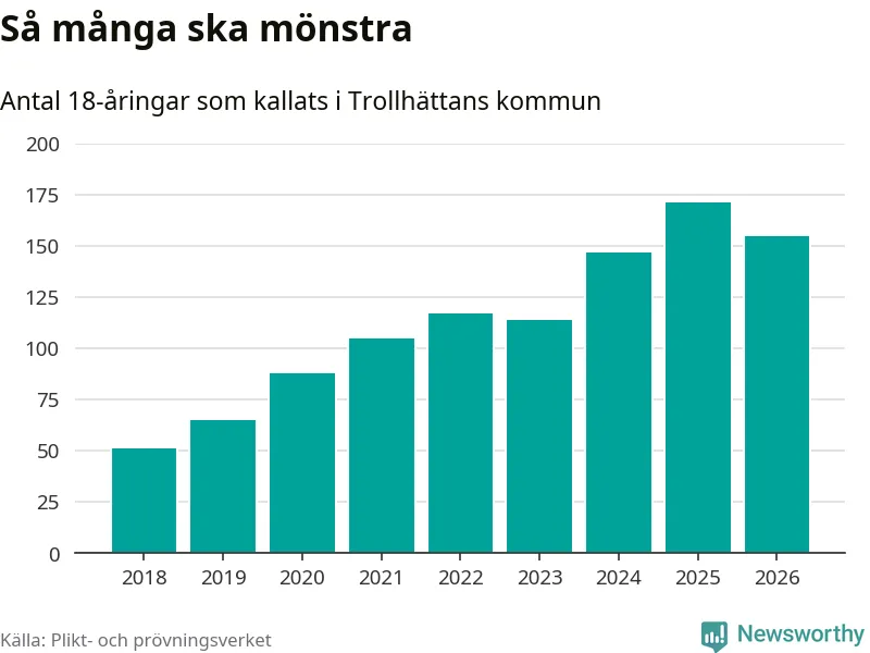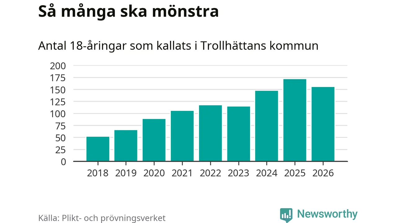 Nu kallas omkring 30 000 svenskar födda 2008 till mönstring. Och 155 av dem kommer från Trollhättan, enligt ny statistik från Plikt- och prövningsverket. Det innebär att var femte invånare i åldersgruppen i kommunen kallas till mönstring. Det är ungefär lika stor andel som i Västra Götaland totalt. I riket som helhet kallas nästan var fjärde person i årskullen.