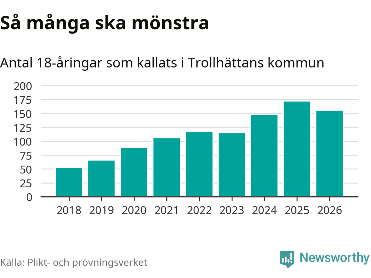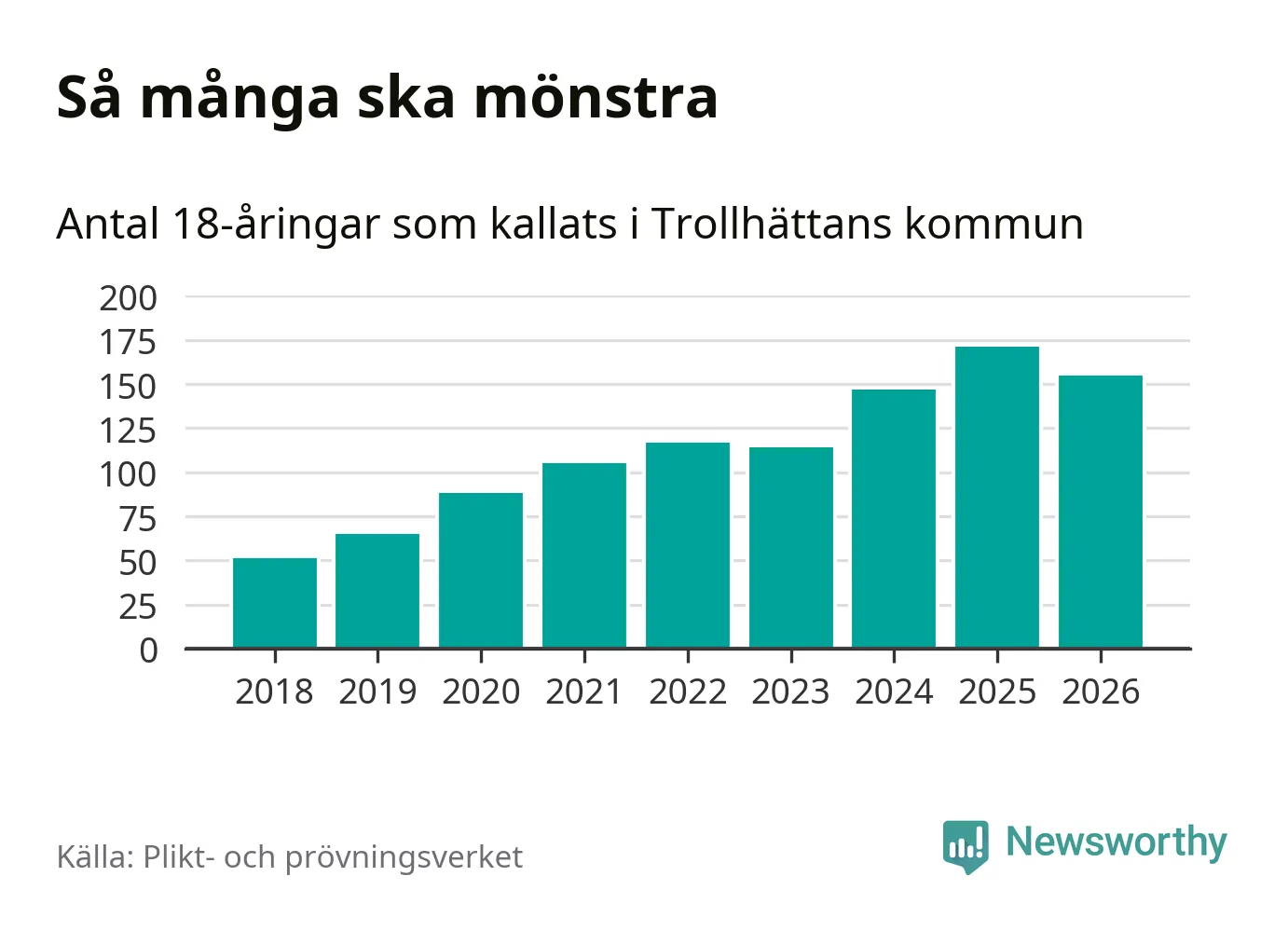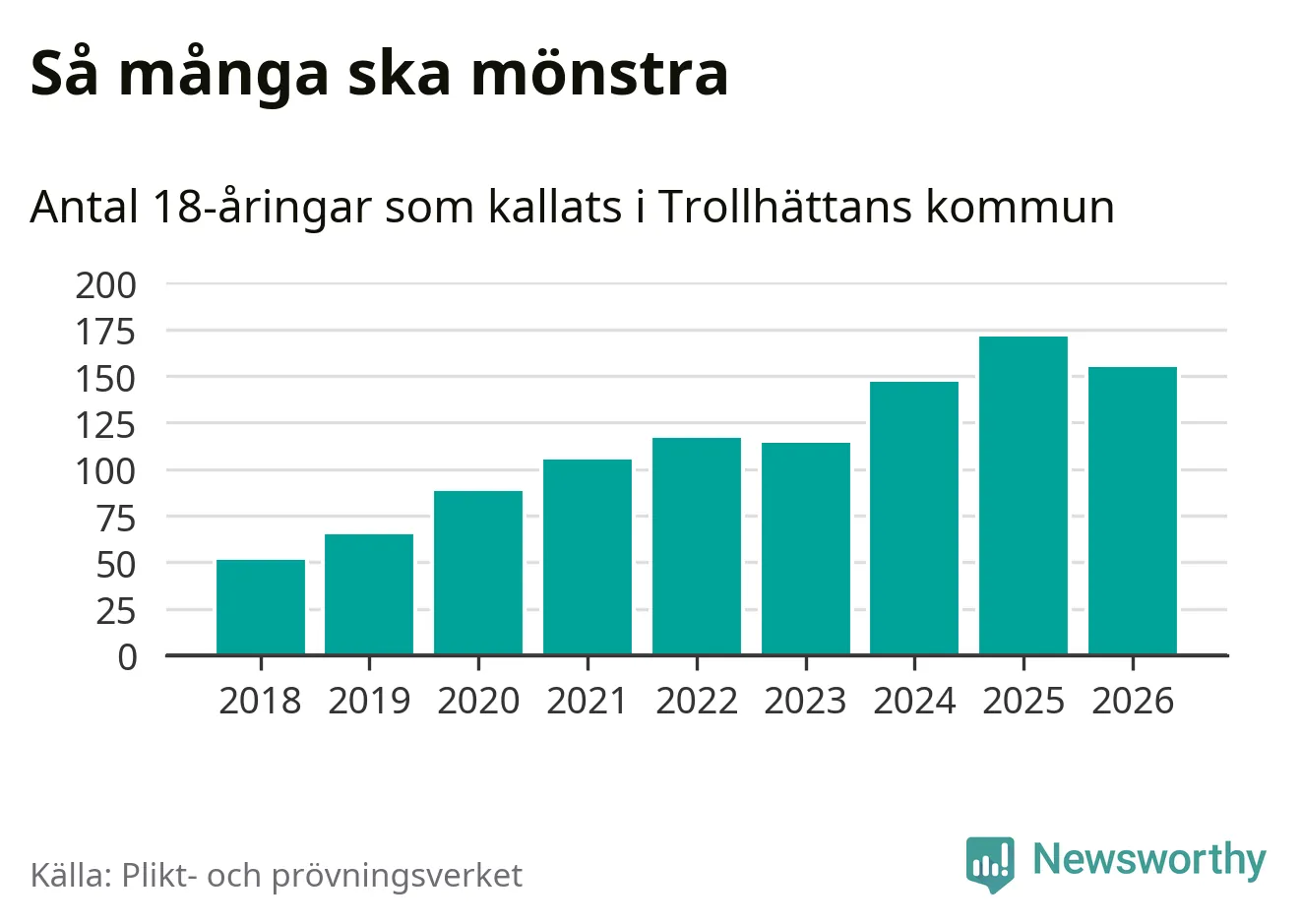 Nu kallas omkring 30 000 svenskar födda 2008 till mönstring. Och 155 av dem kommer från Trollhättan, enligt ny statistik från Plikt- och prövningsverket. Det innebär att var femte invånare i åldersgruppen i kommunen kallas till mönstring. Det är ungefär lika stor andel som i Västra Götaland totalt. I riket som helhet kallas nästan var fjärde person i årskullen.