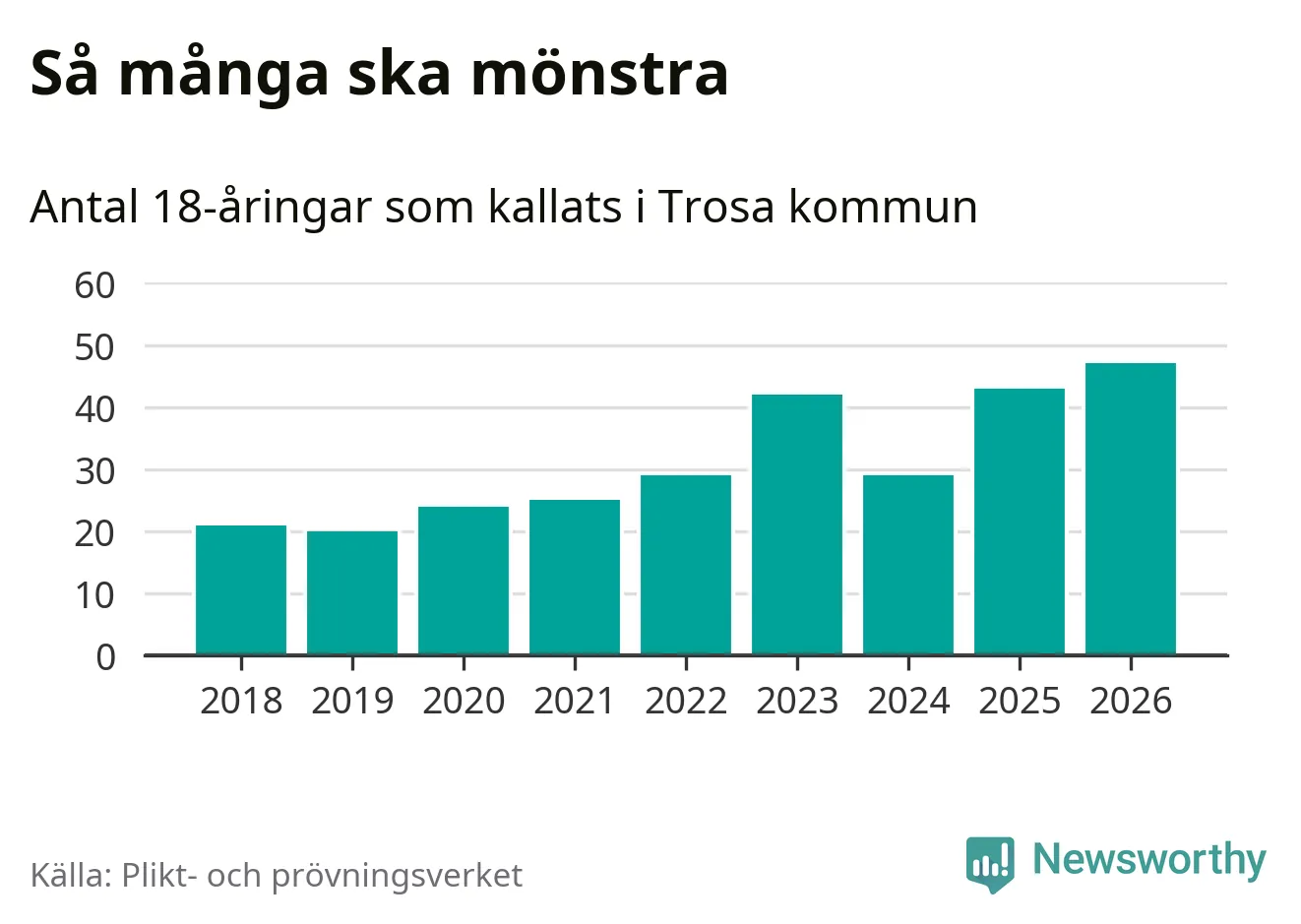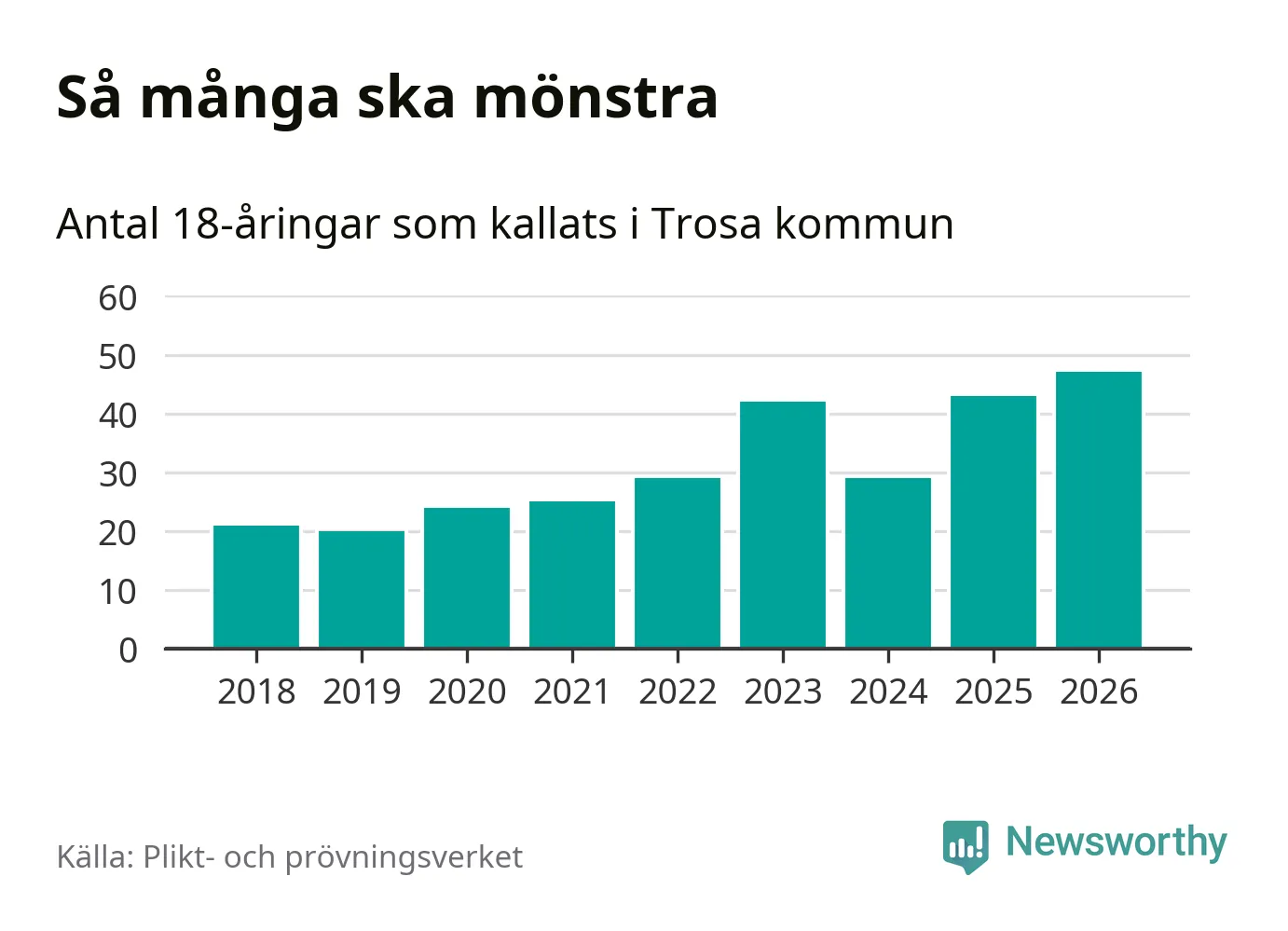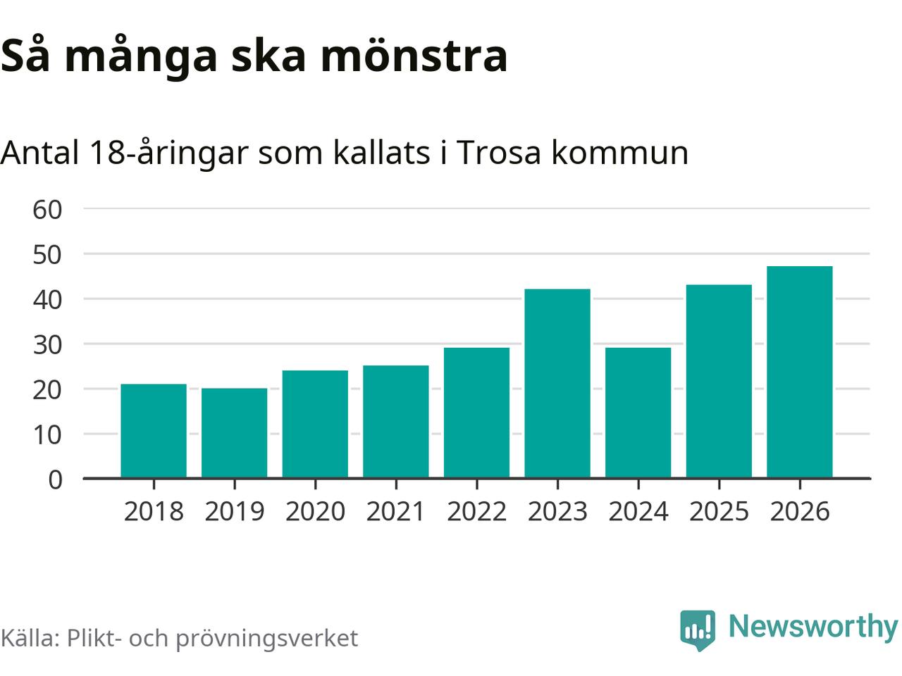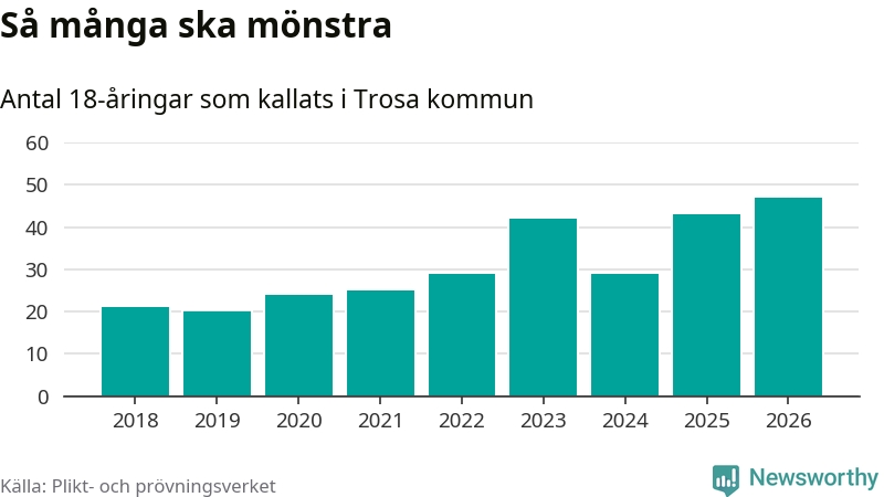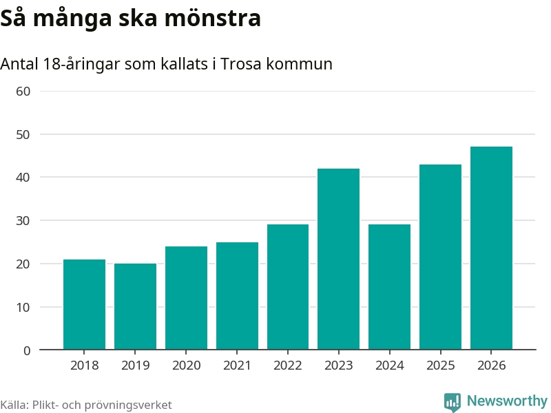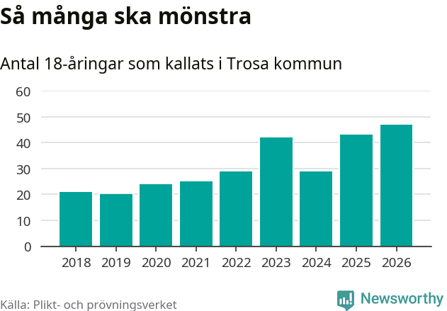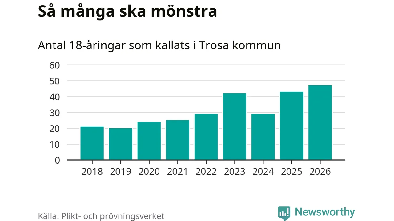47 personer är det högsta antalet kallade i Trosa sedan 2018, som är första året med statistik på kommunnivå (värnplikten återinfördes 2017), och fyra mönstrande fler än 2025. Totalt från Södermanlands län kallas 826 personer i år.