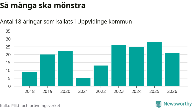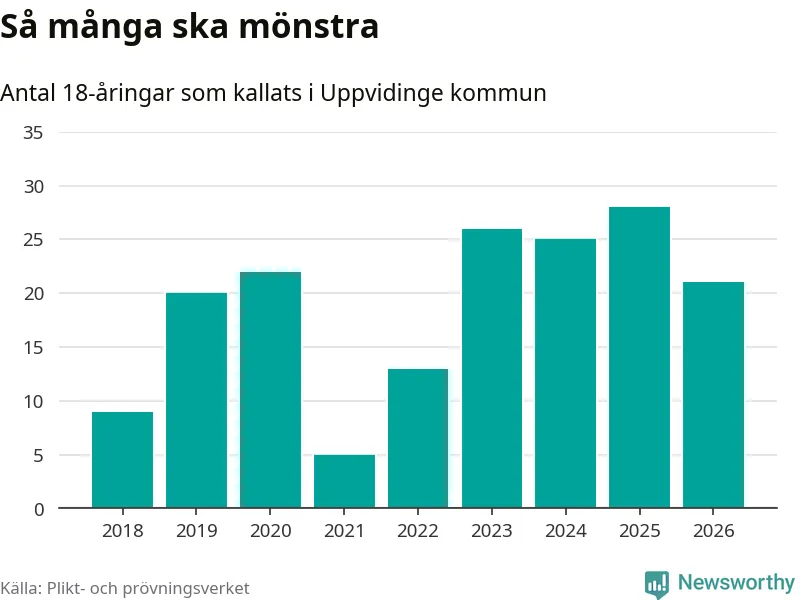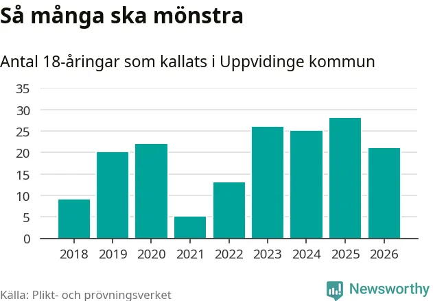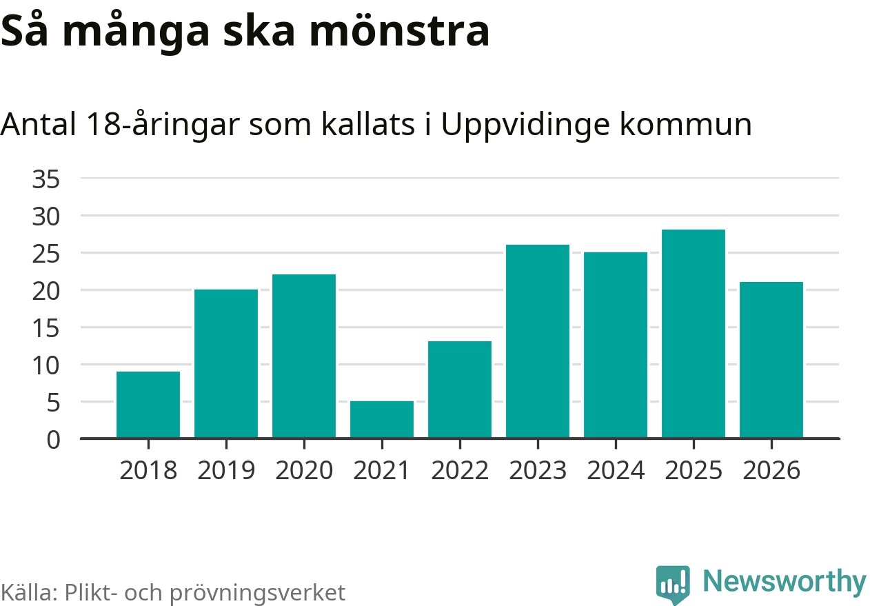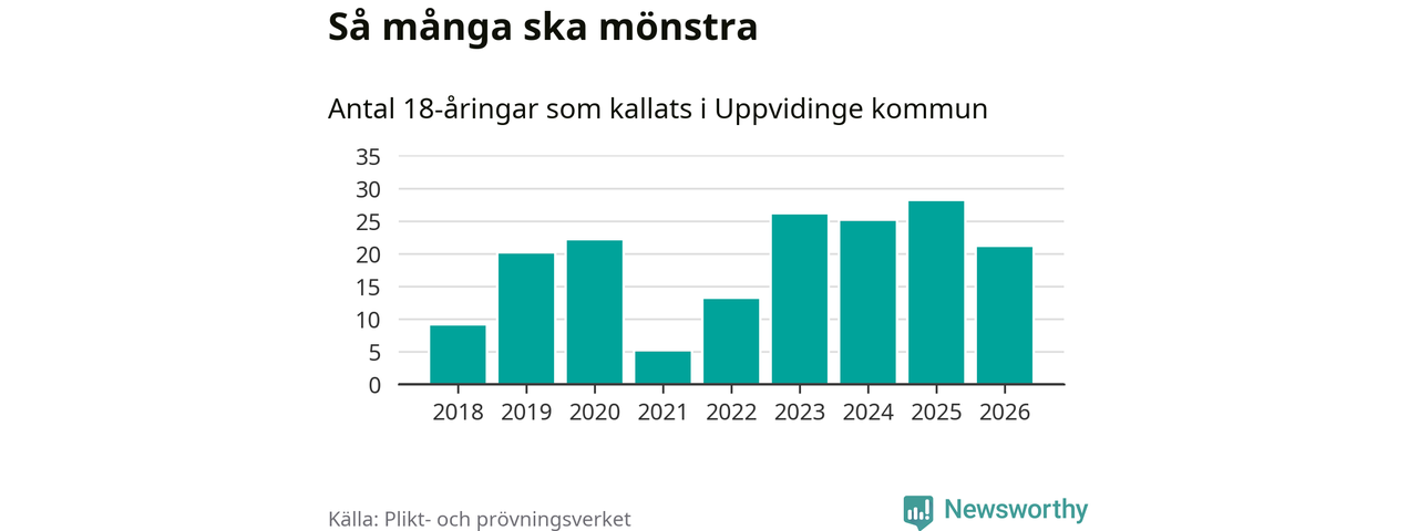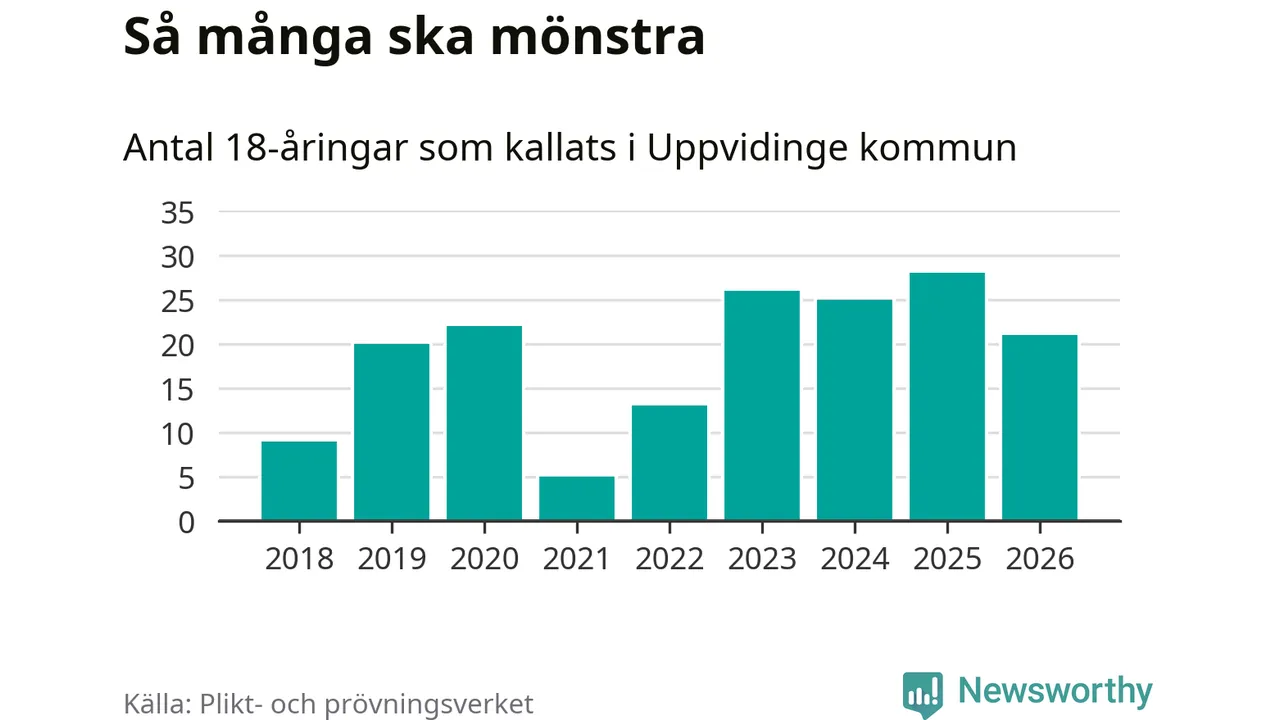 Nu kallas omkring 30 000 svenskar födda 2008 till mönstring. Och 21 av dem kommer från Uppvidinge, enligt ny statistik från Plikt- och prövningsverket. Det innebär att var femte invånare i åldersgruppen i kommunen kallas till mönstring. Det är ungefär lika stor andel som i Kronoberg totalt. I riket som helhet kallas nästan var fjärde person i årskullen.