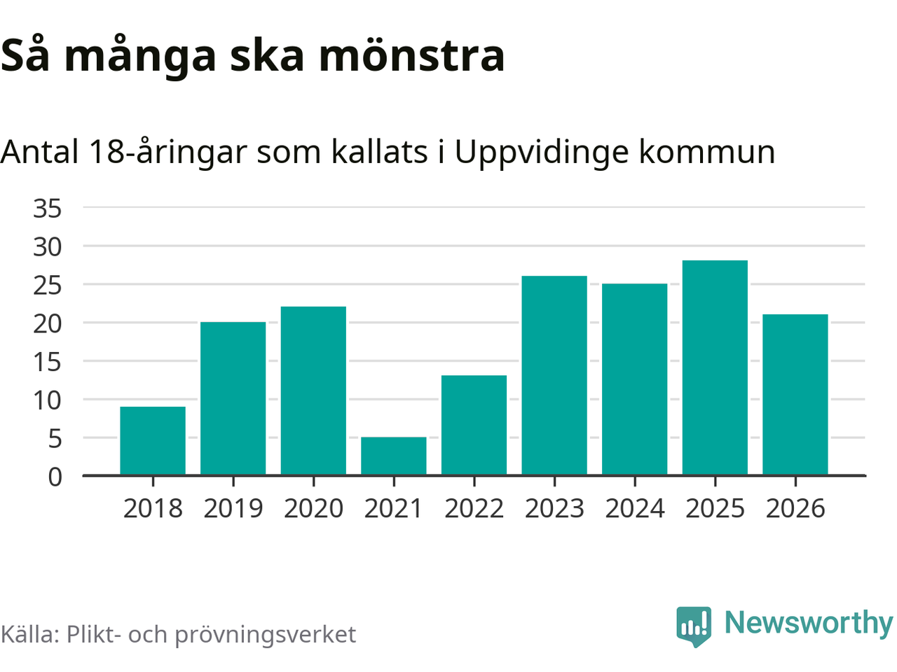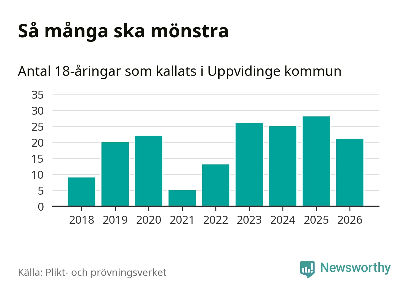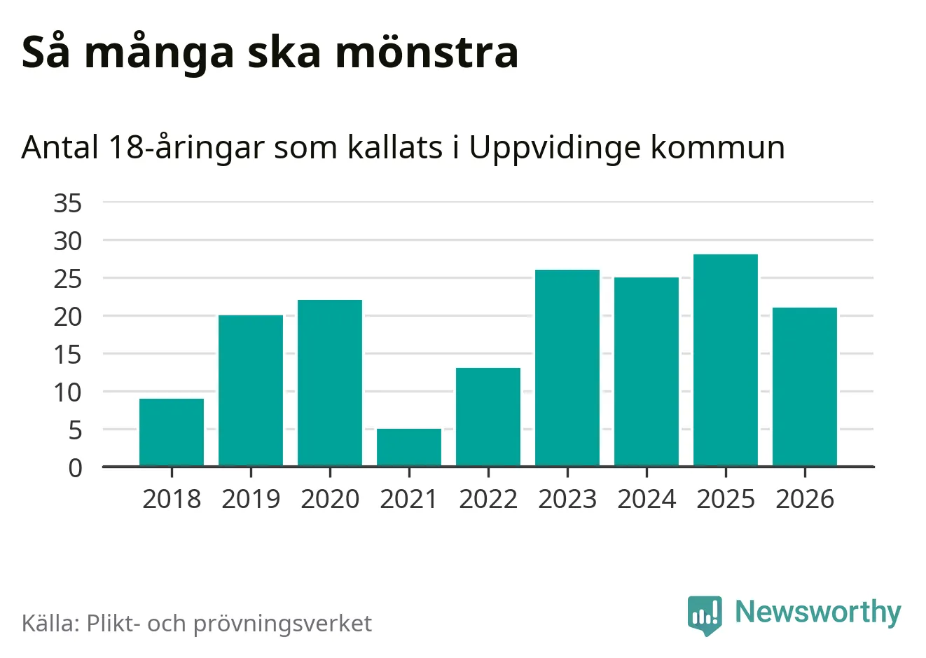 Nu kallas omkring 30 000 svenskar födda 2008 till mönstring. Och 21 av dem kommer från Uppvidinge, enligt ny statistik från Plikt- och prövningsverket. Det innebär att var femte invånare i åldersgruppen i kommunen kallas till mönstring. Det är ungefär lika stor andel som i Kronoberg totalt. I riket som helhet kallas nästan var fjärde person i årskullen.