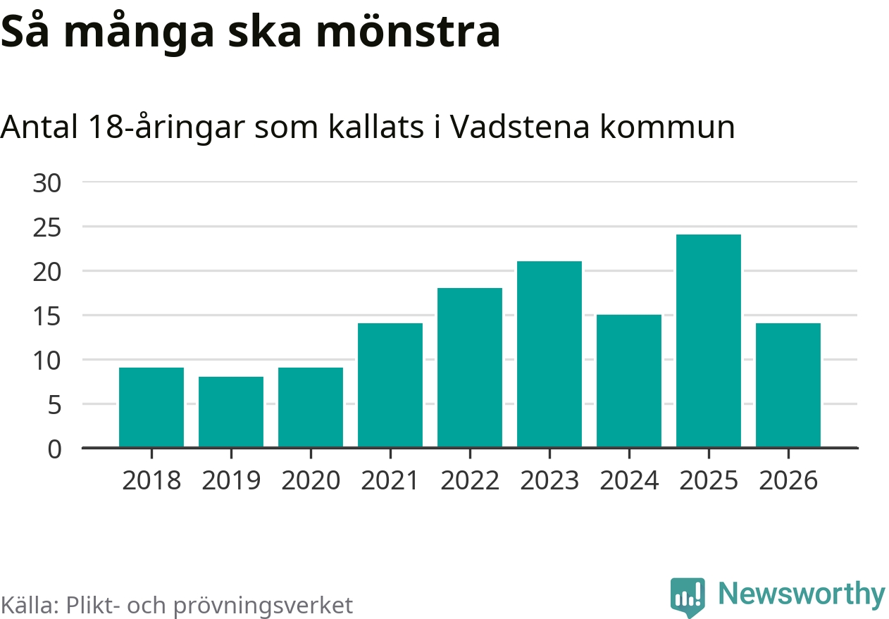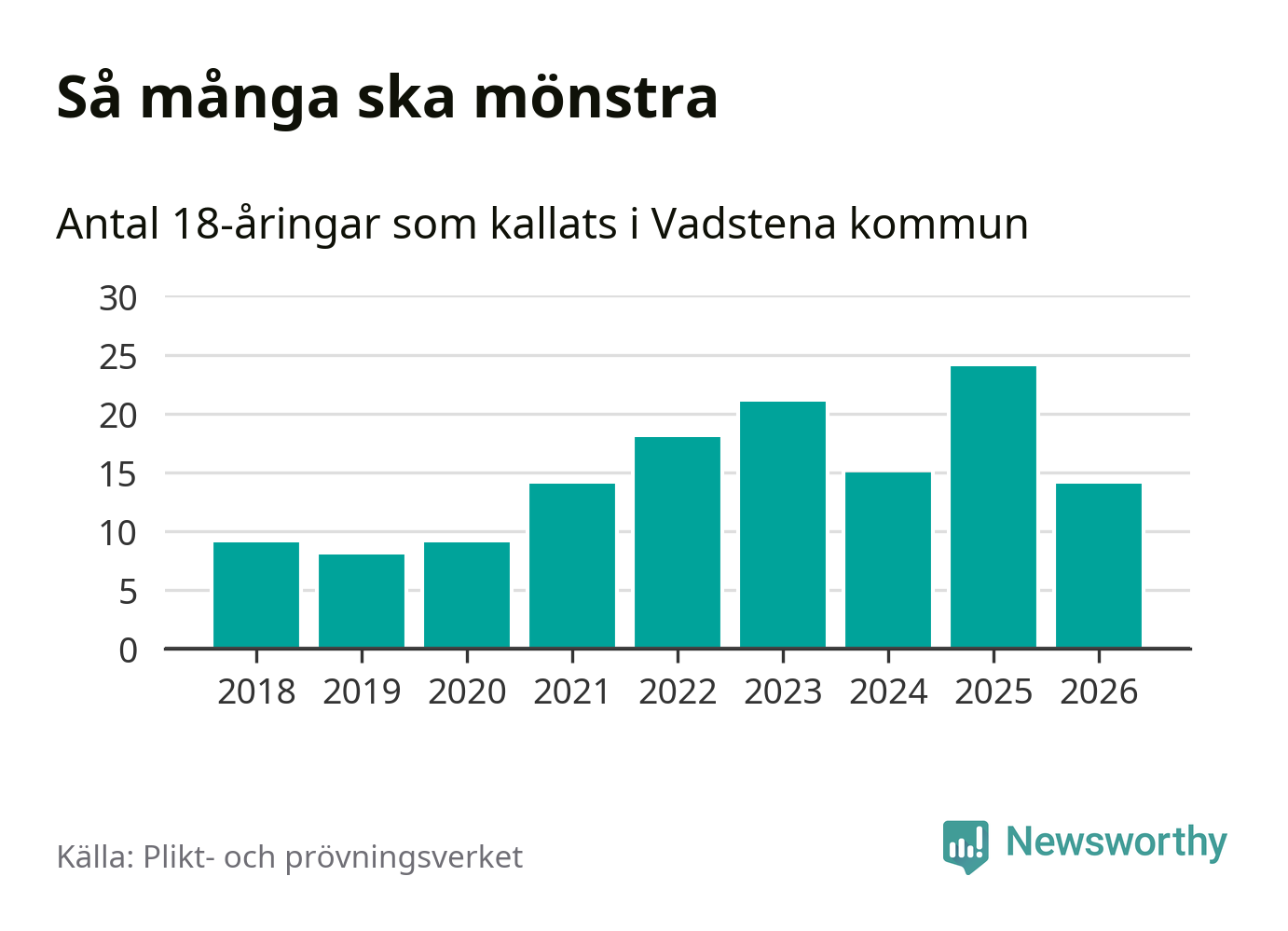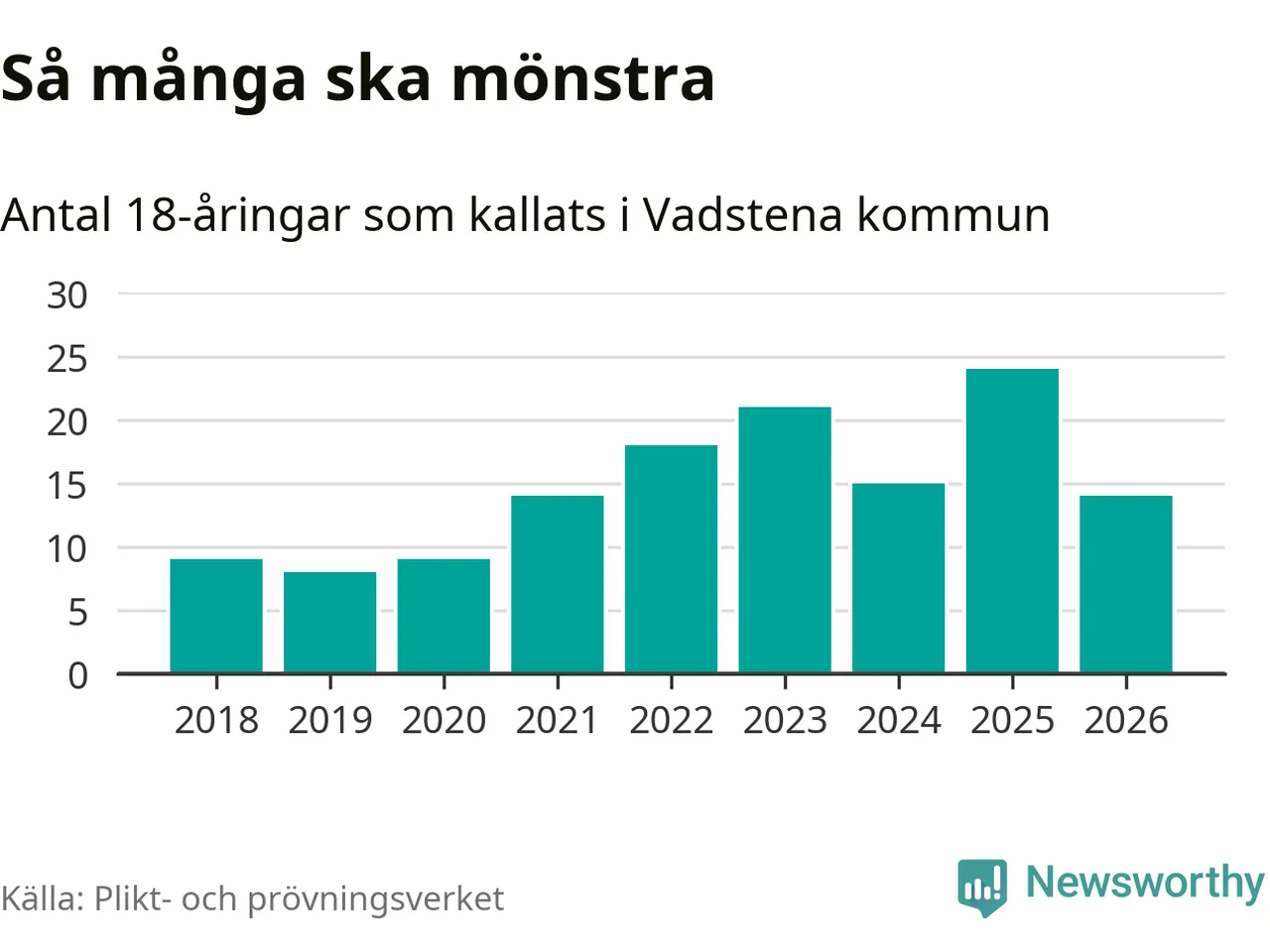 Nu kallas omkring 30 000 svenskar födda 2008 till mönstring. Och 14 av dem kommer från Vadstena, enligt ny statistik från Plikt- och prövningsverket. Det innebär att nästan var fjärde invånare i åldersgruppen i kommunen kallas till mönstring. Det är ungefär lika stor andel som i Östergötland totalt. Även i riket som helhet kallas nästan var fjärde person i årskullen.
