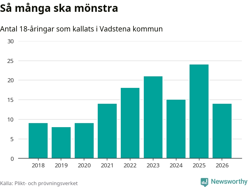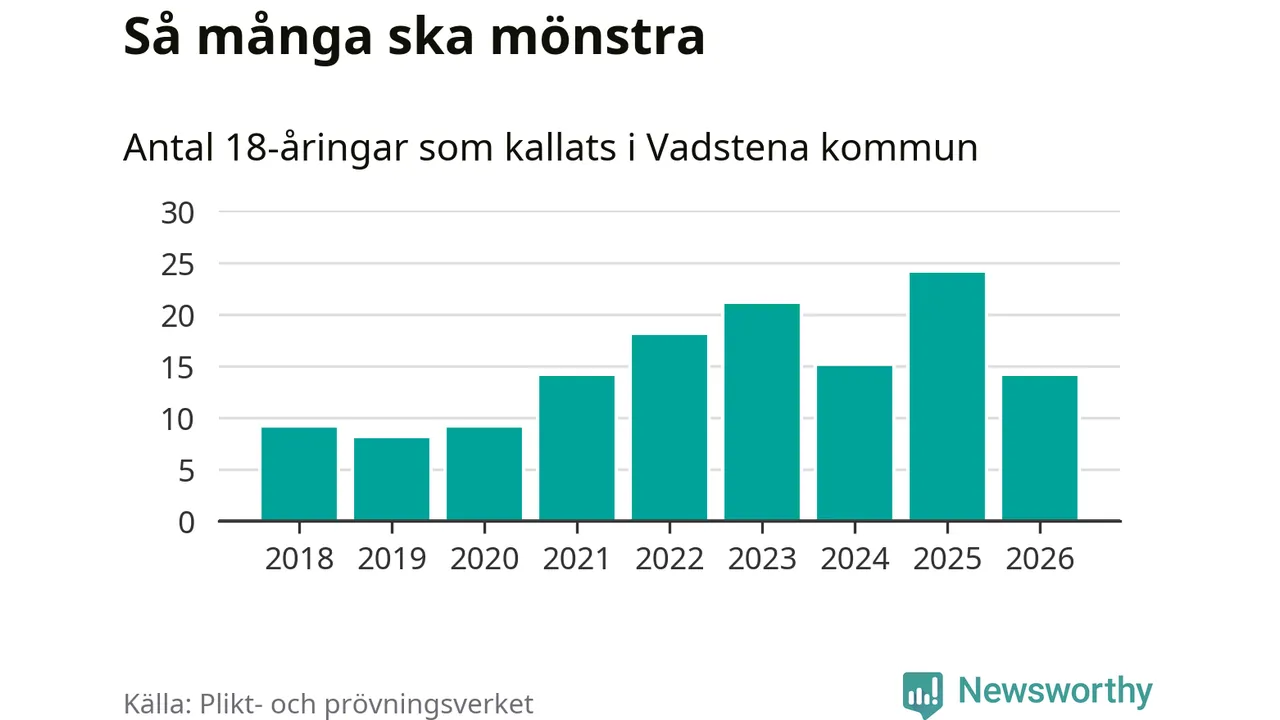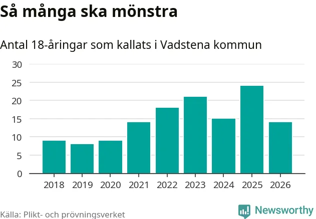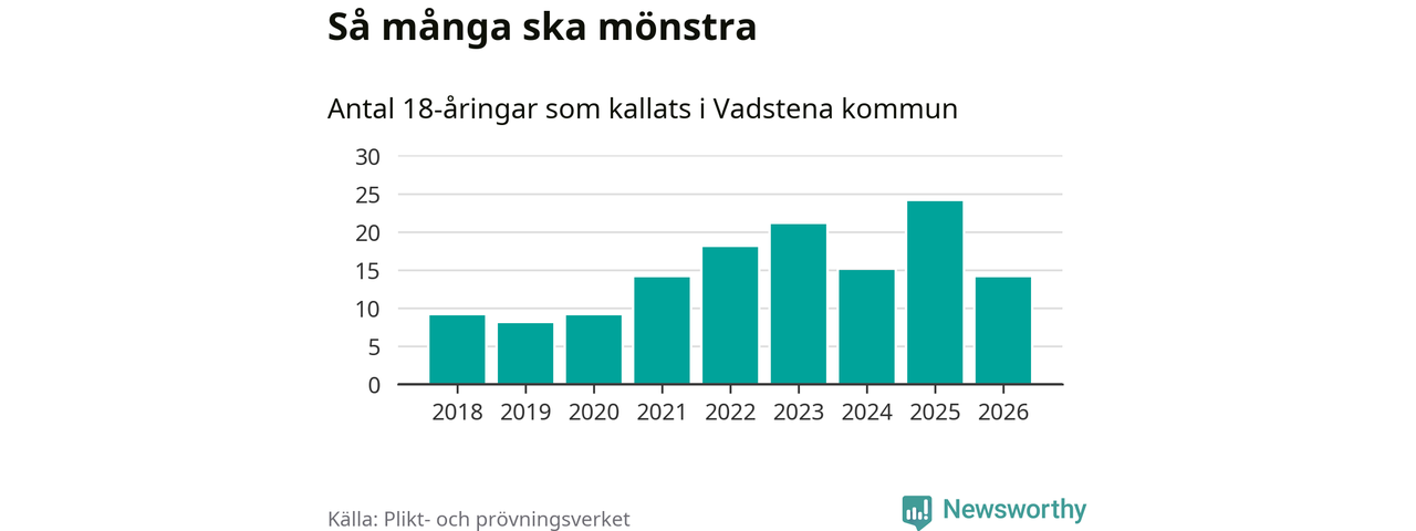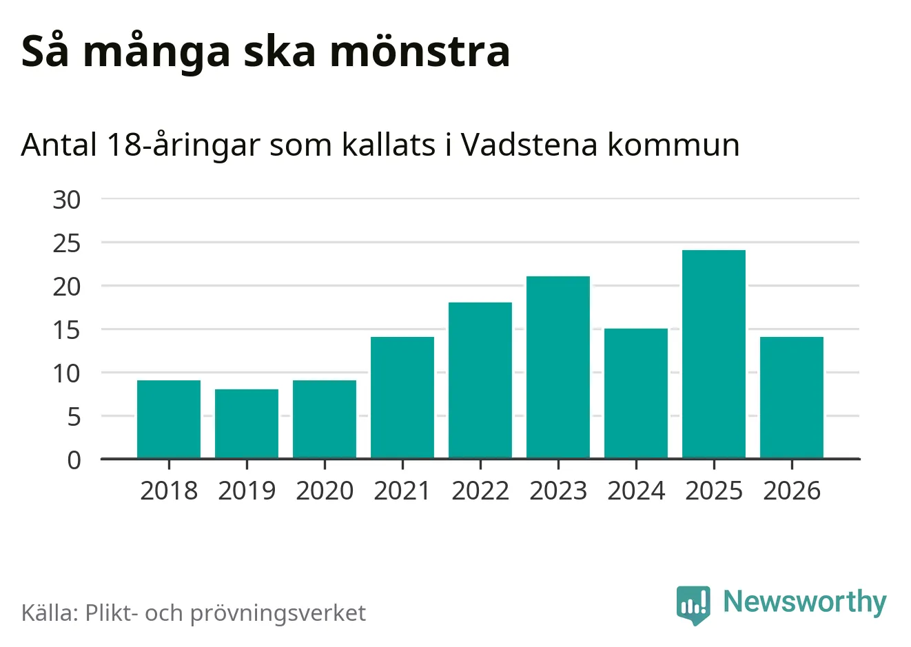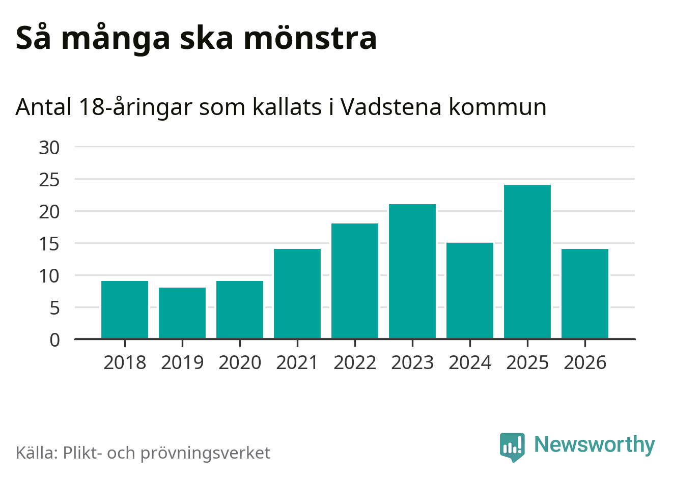 Nu kallas omkring 30 000 svenskar födda 2008 till mönstring. Och 14 av dem kommer från Vadstena, enligt ny statistik från Plikt- och prövningsverket. Det innebär att nästan var fjärde invånare i åldersgruppen i kommunen kallas till mönstring. Det är ungefär lika stor andel som i Östergötland totalt. Även i riket som helhet kallas nästan var fjärde person i årskullen.