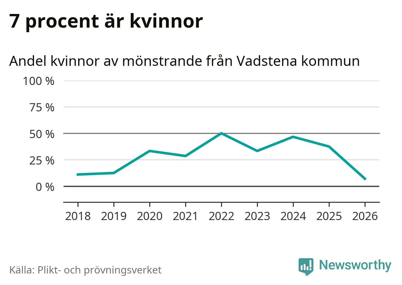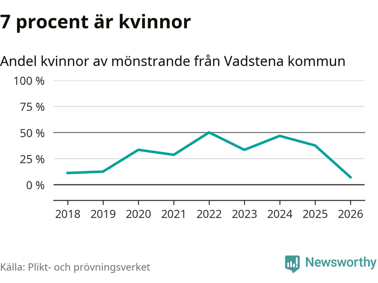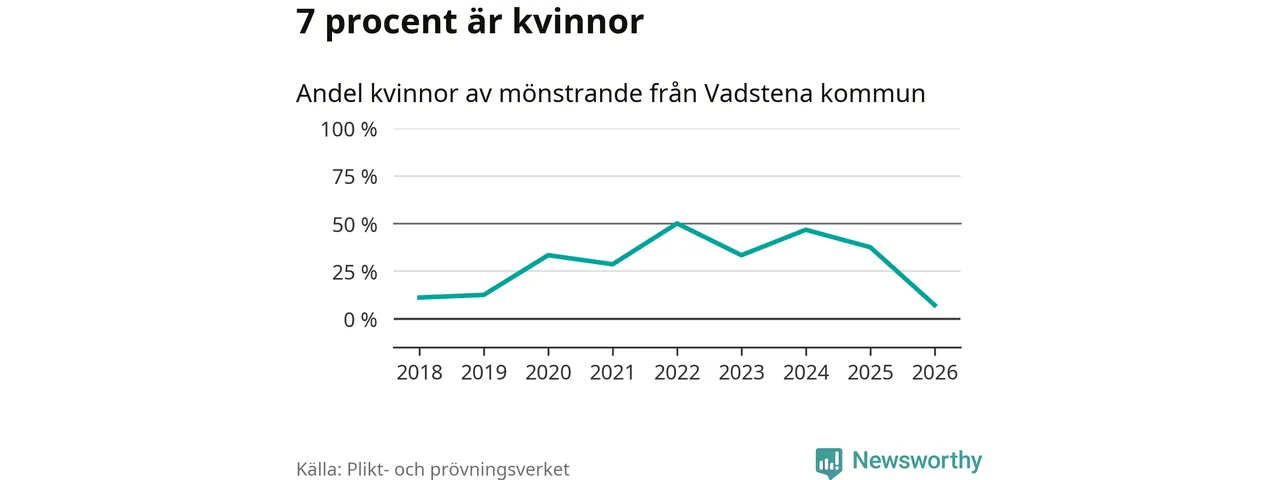 En av de som kallats till mönstring från Vadstena är kvinna. Som mest har nio kvinnor kallats från kommunen (2025 och 2022). I riket som helhet är 28 procent av de mönstrande tjejer.