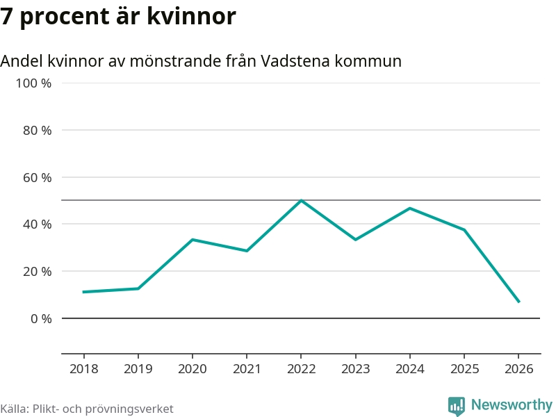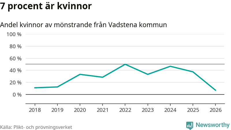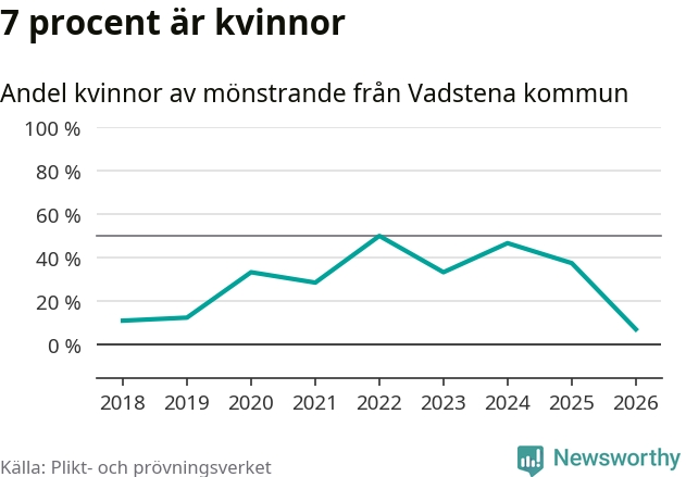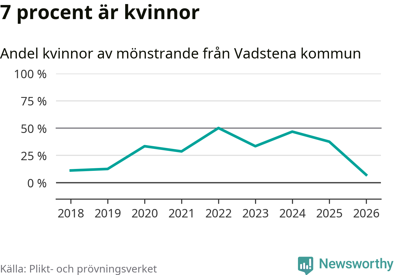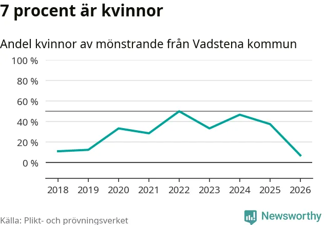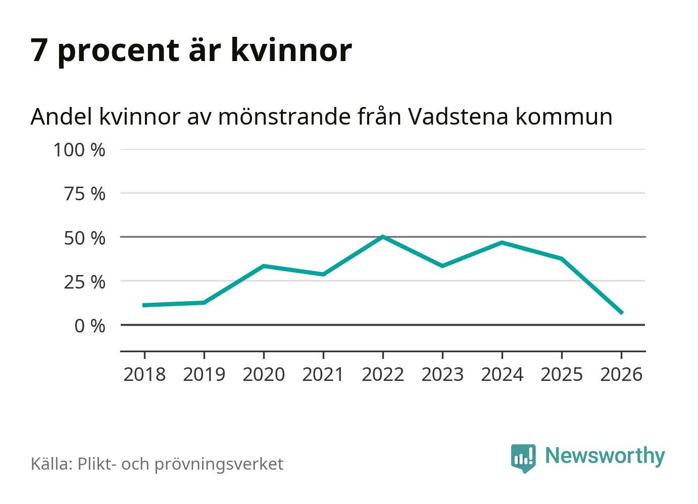 En av de som kallats till mönstring från Vadstena är kvinna. Som mest har nio kvinnor kallats från kommunen (2025 och 2022). I riket som helhet är 28 procent av de mönstrande tjejer.