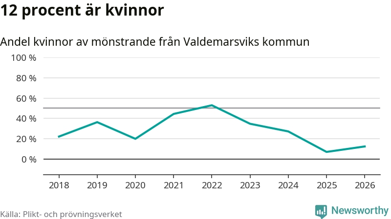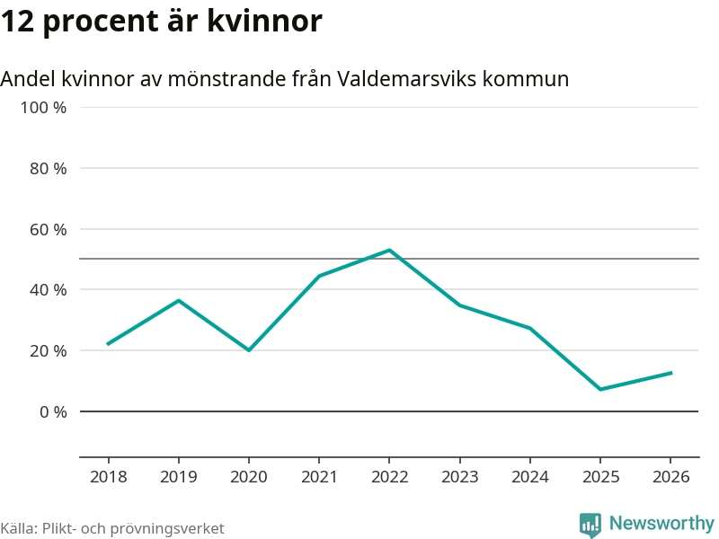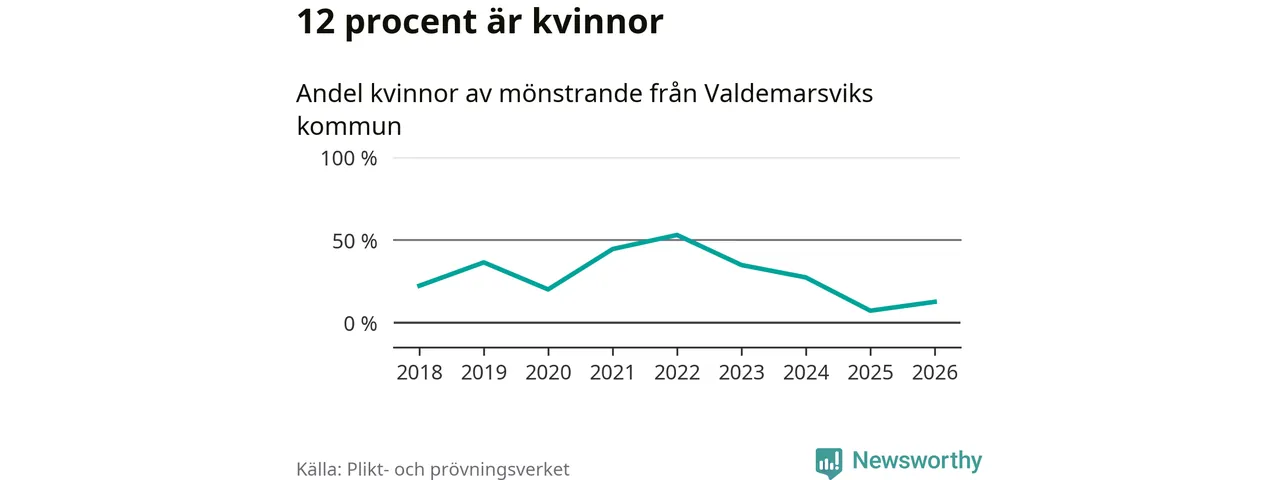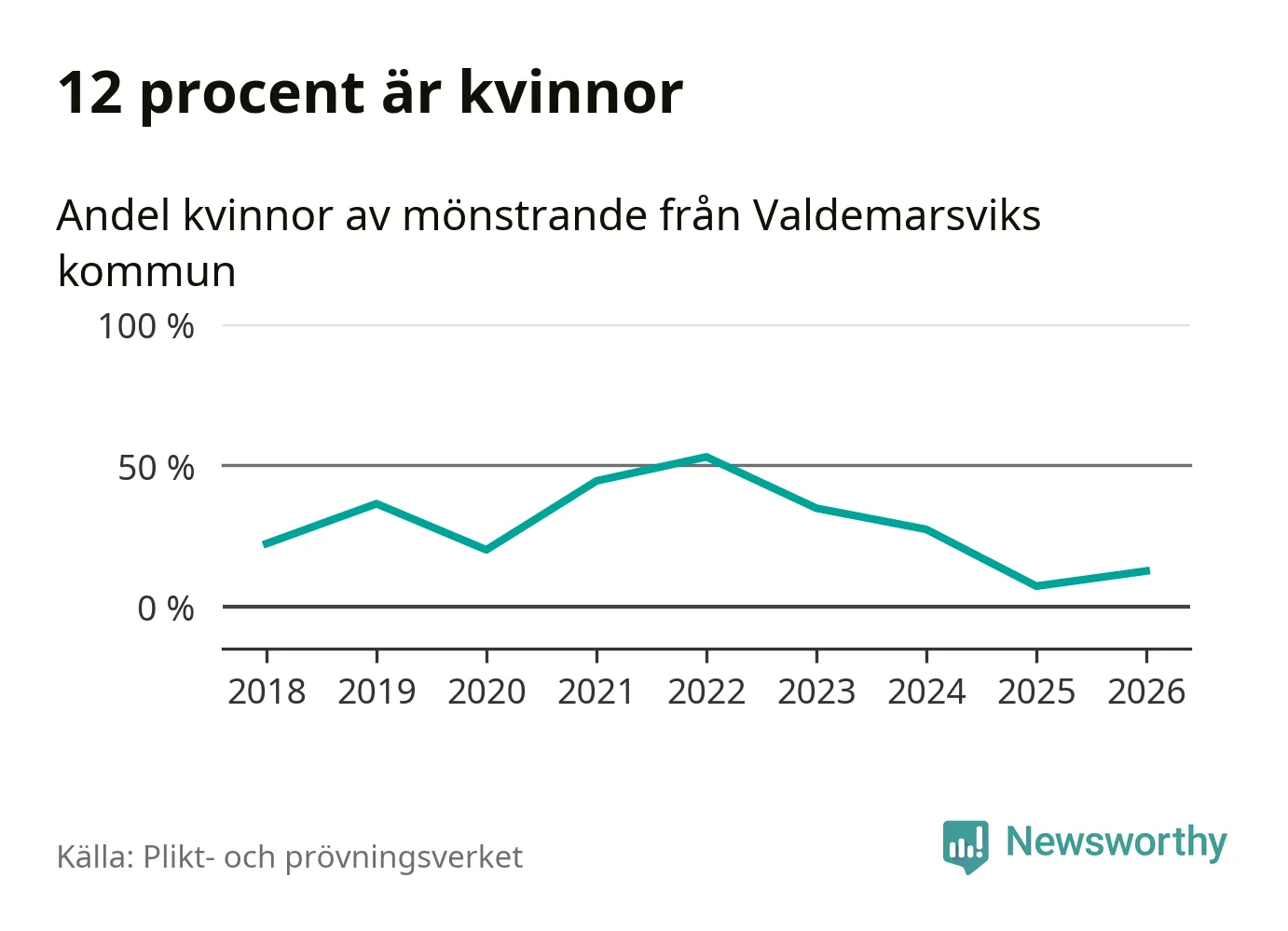 Två av de som kallats till mönstring från Valdemarsvik är kvinnor, vilket motsvarar 13 procent av de mönstrande. Som mest har nio kvinnor kallats från kommunen (2022). I riket som helhet är 28 procent av de mönstrande tjejer.