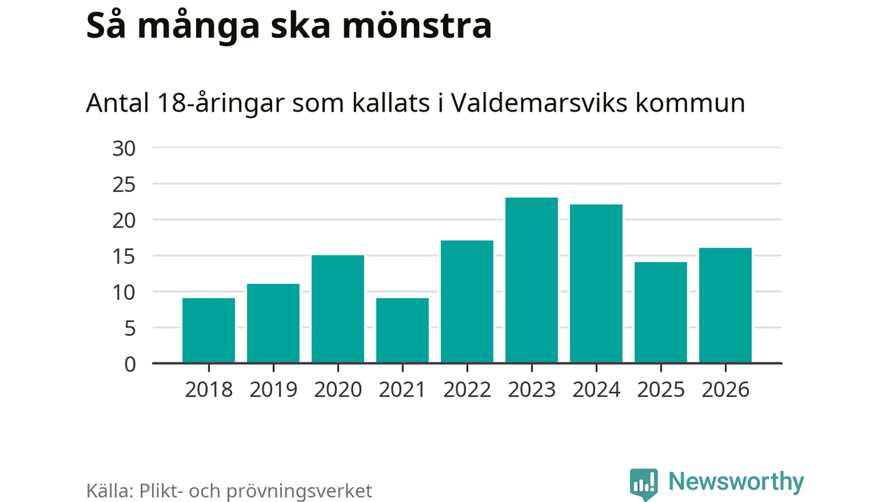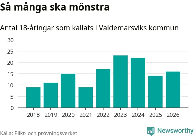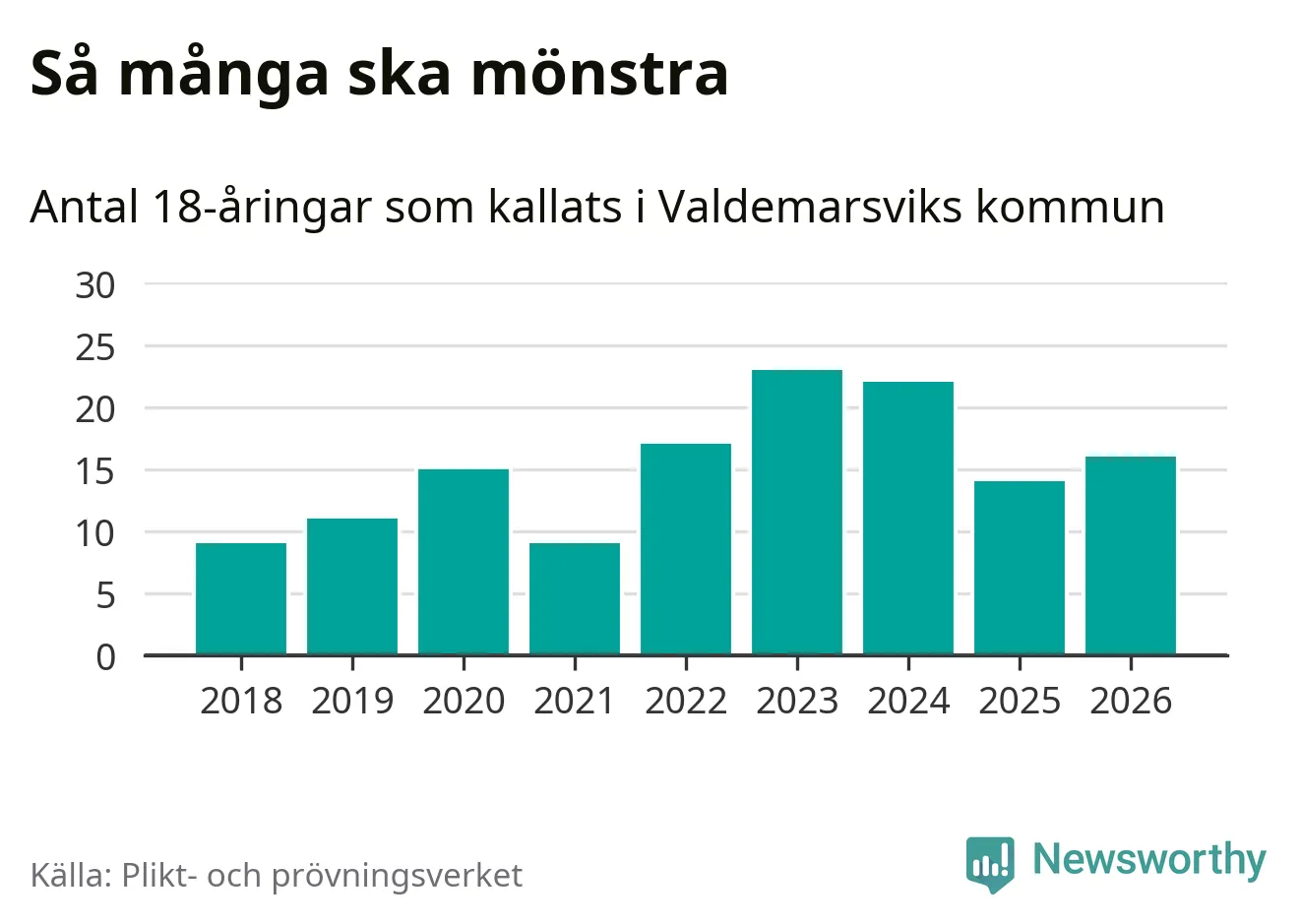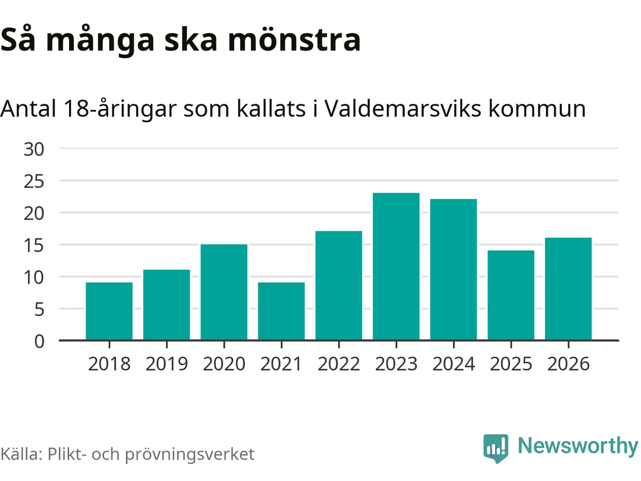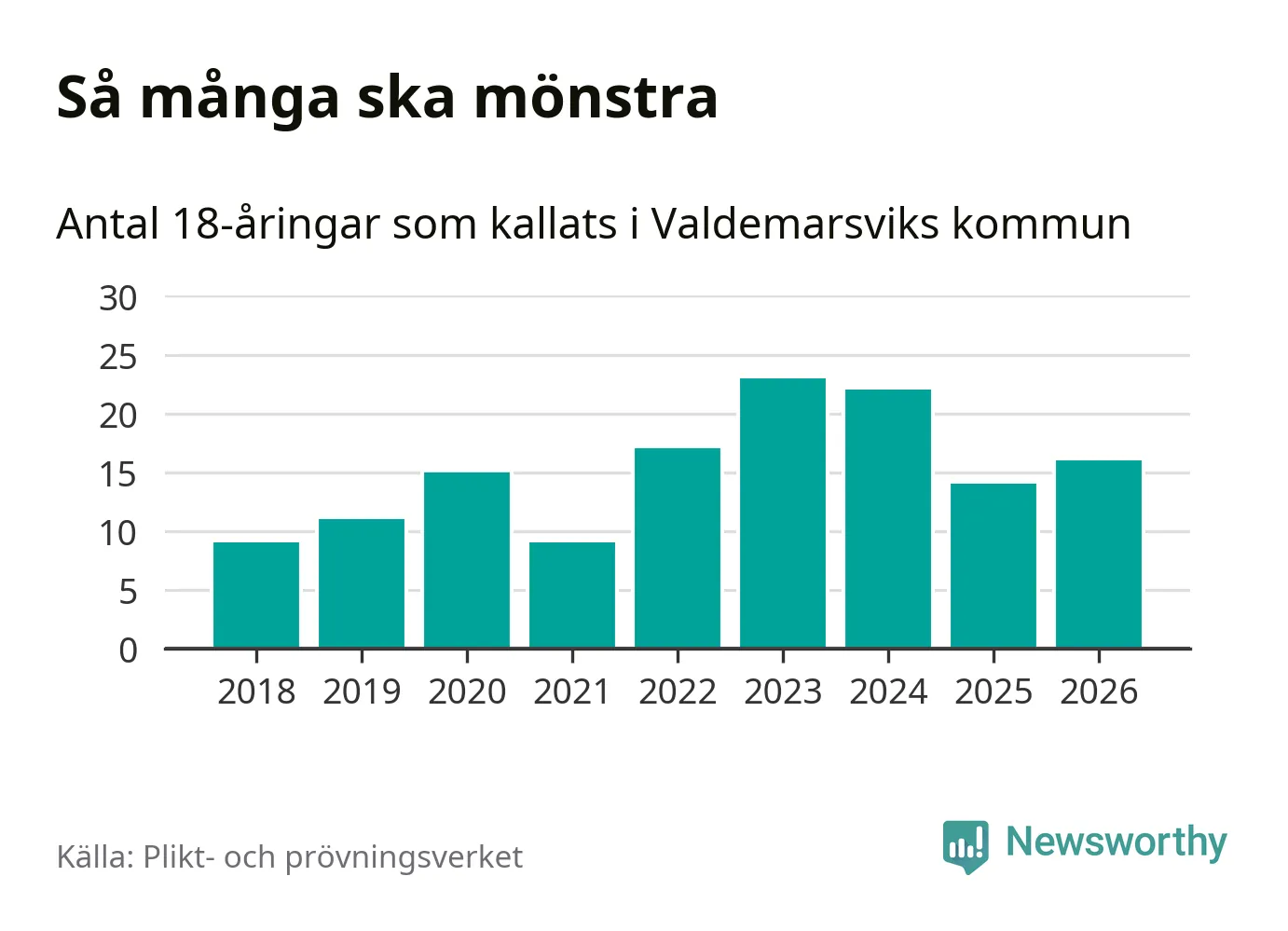 Nu kallas omkring 30 000 svenskar födda 2008 till mönstring. Och 16 av dem kommer från Valdemarsvik, enligt ny statistik från Plikt- och prövningsverket. Det innebär att var femte invånare i åldersgruppen i kommunen kallas till mönstring. Det är en lägre andel än i Östergötland totalt. I riket som helhet kallas nästan var fjärde person i årskullen.