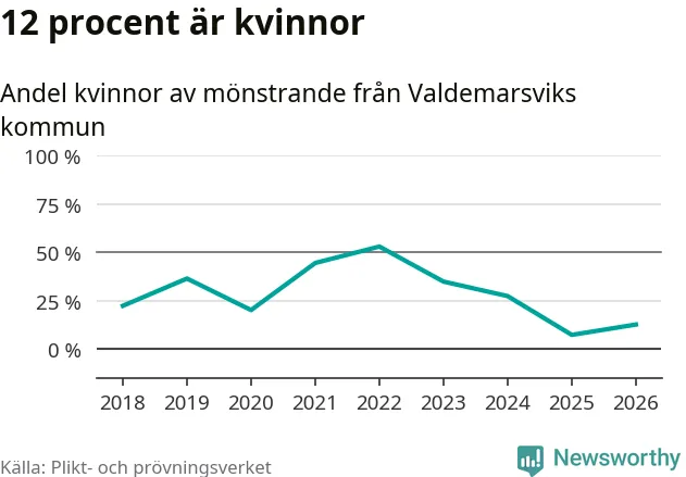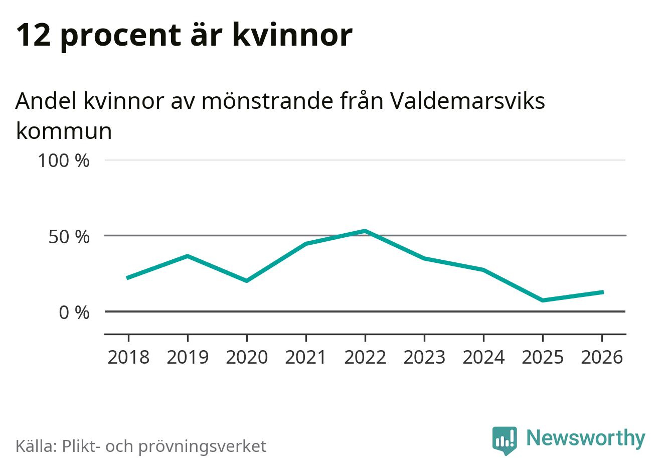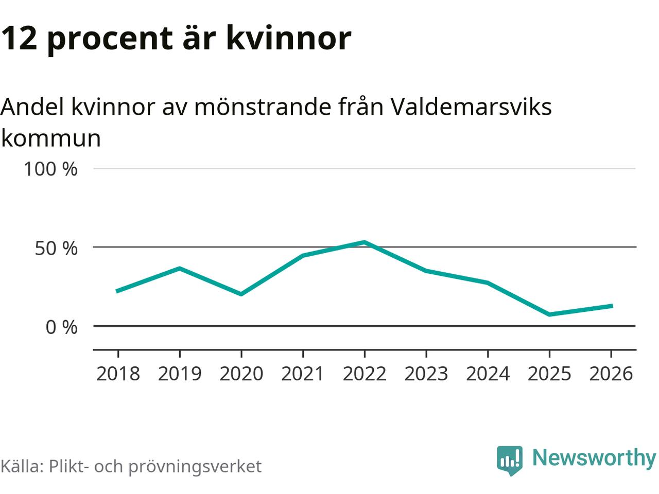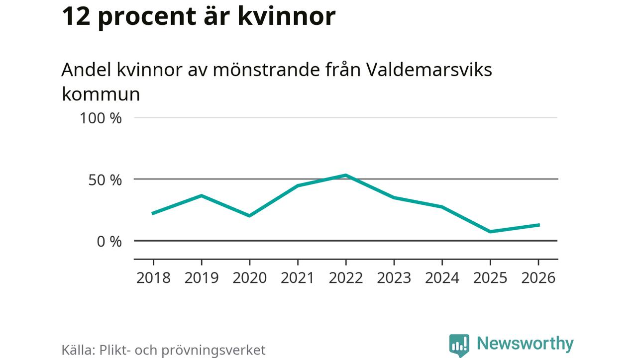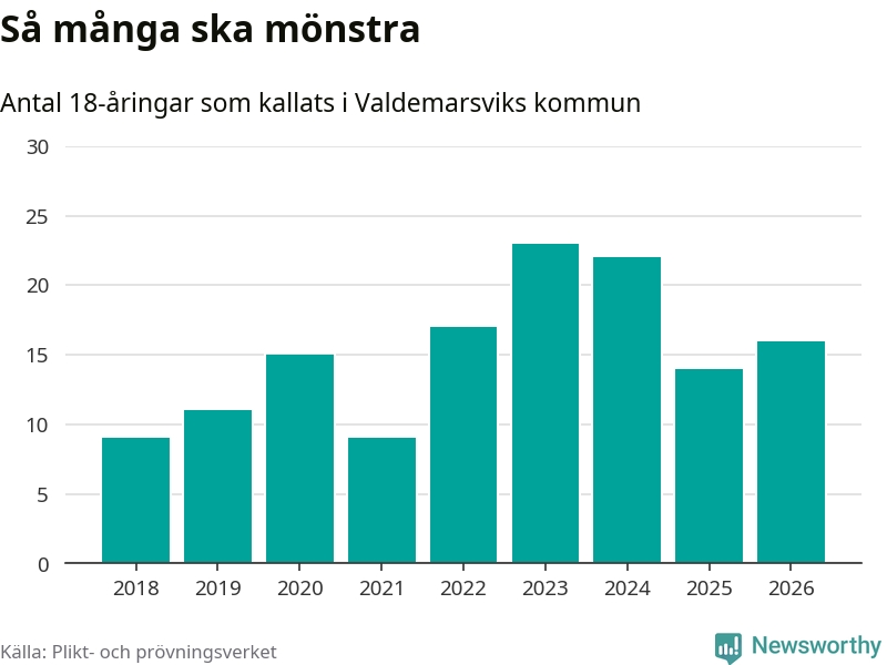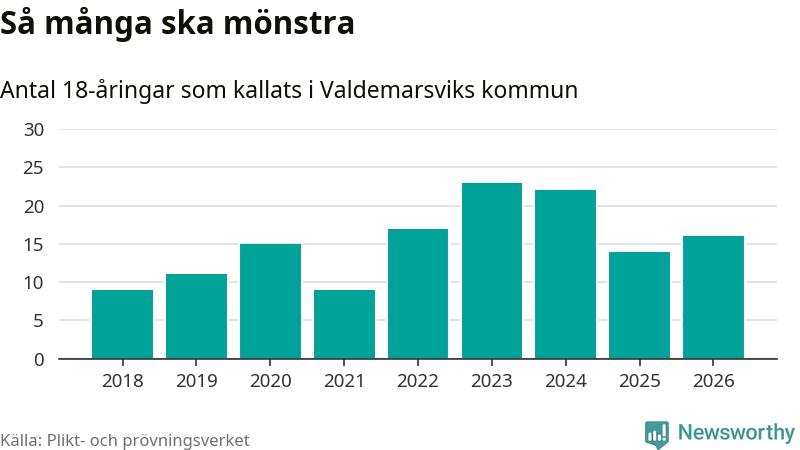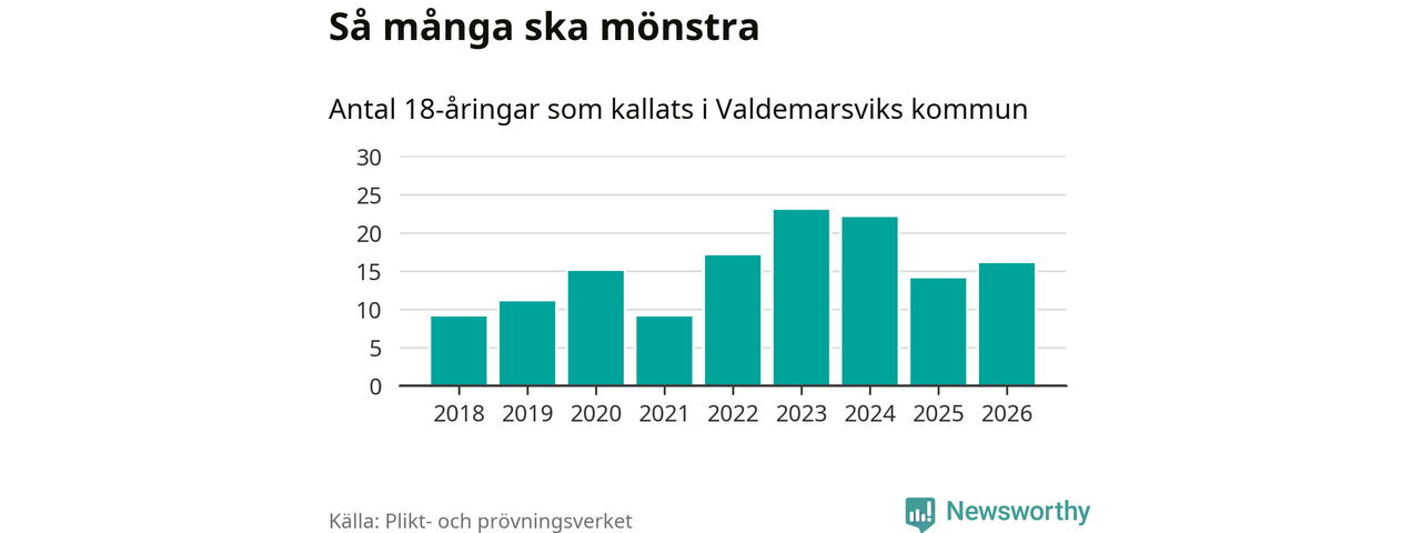 Nu kallas omkring 30 000 svenskar födda 2008 till mönstring. Och 16 av dem kommer från Valdemarsvik, enligt ny statistik från Plikt- och prövningsverket. Det innebär att var femte invånare i åldersgruppen i kommunen kallas till mönstring. Det är en lägre andel än i Östergötland totalt. I riket som helhet kallas nästan var fjärde person i årskullen.