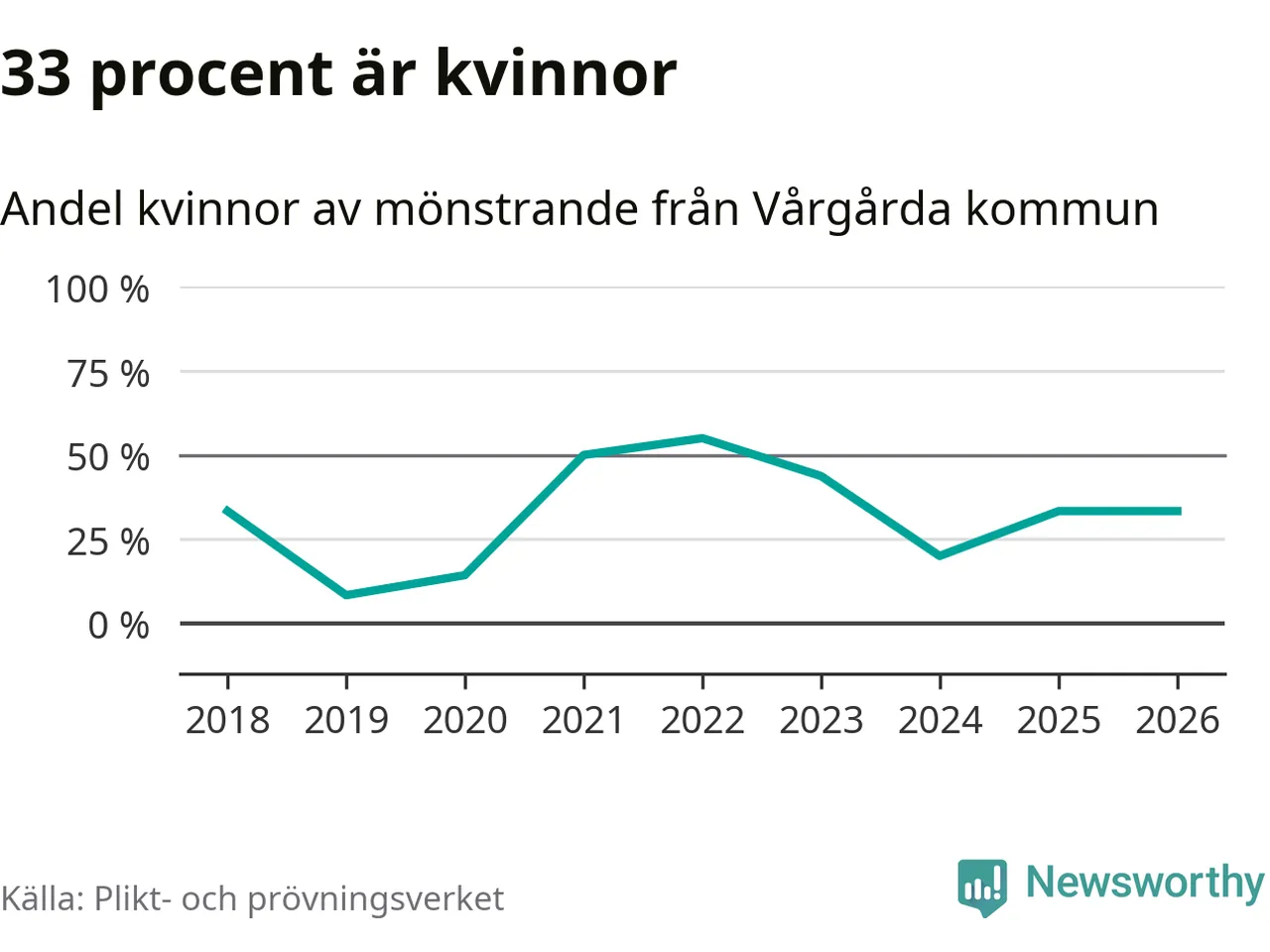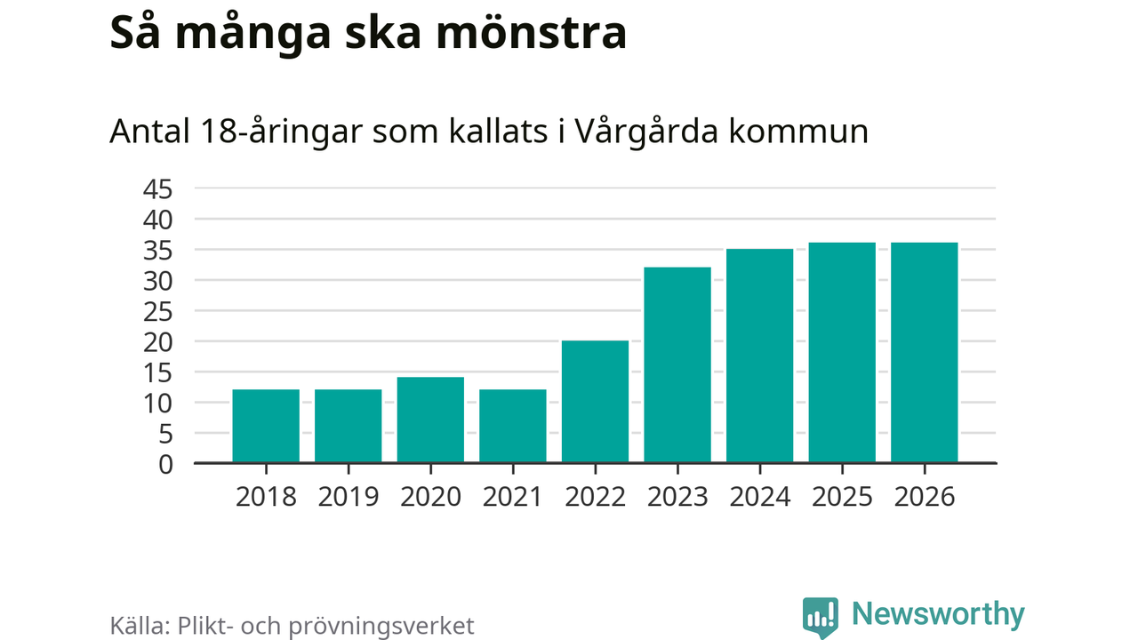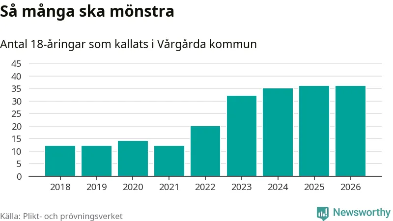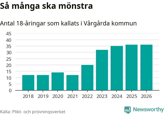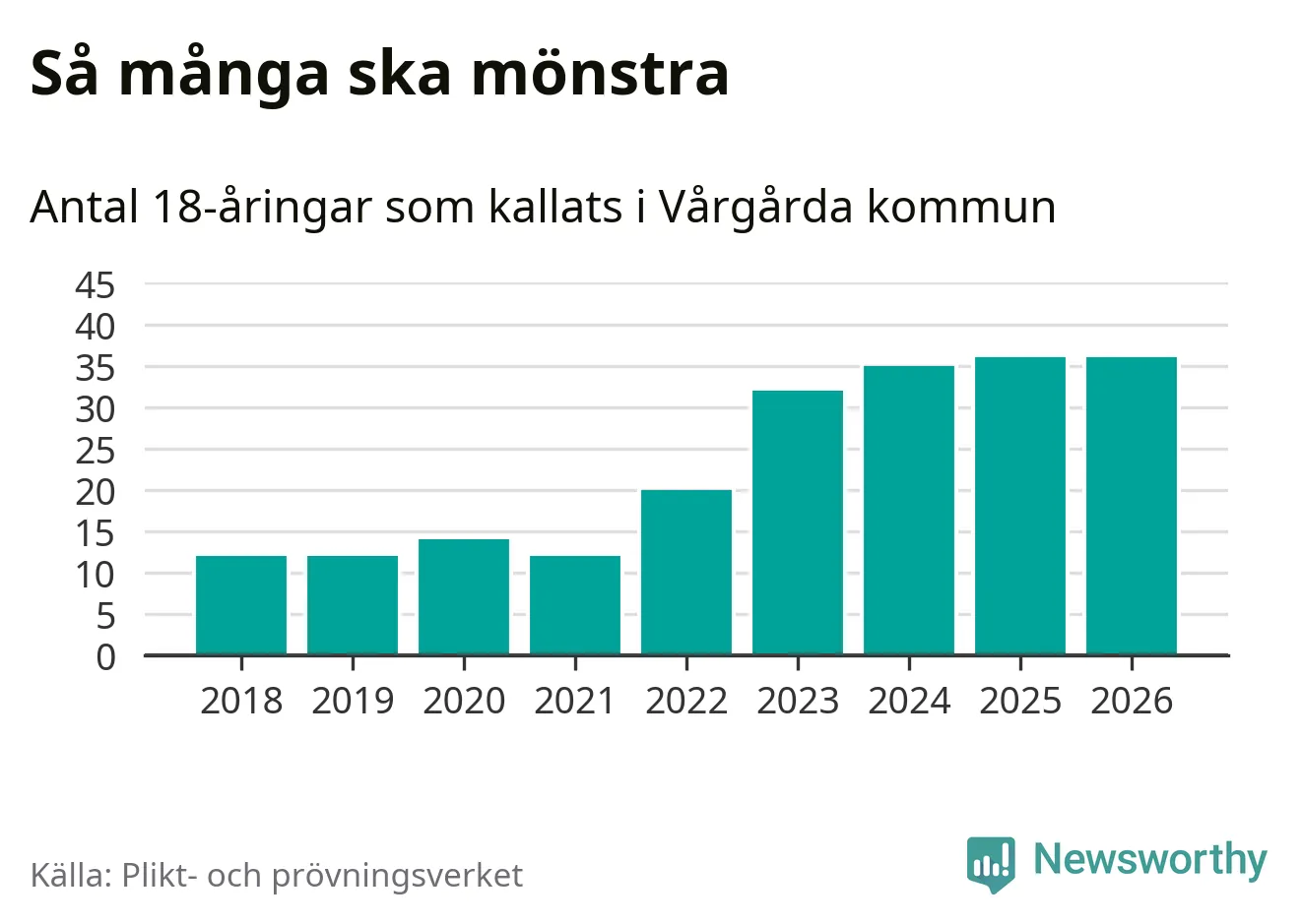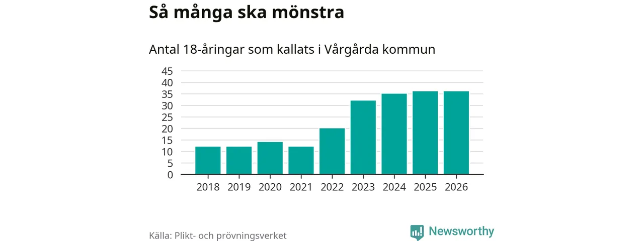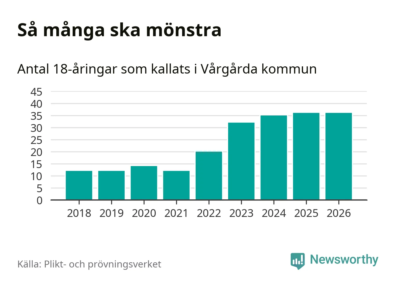 Nu kallas omkring 30 000 svenskar födda 2008 till mönstring. Och 36 av dem kommer från Vårgårda, enligt ny statistik från Plikt- och prövningsverket. Det innebär att var femte invånare i åldersgruppen i kommunen kallas till mönstring. Det är ungefär lika stor andel som i Västra Götaland totalt. I riket som helhet kallas nästan var fjärde person i årskullen.