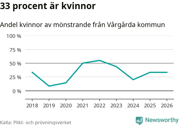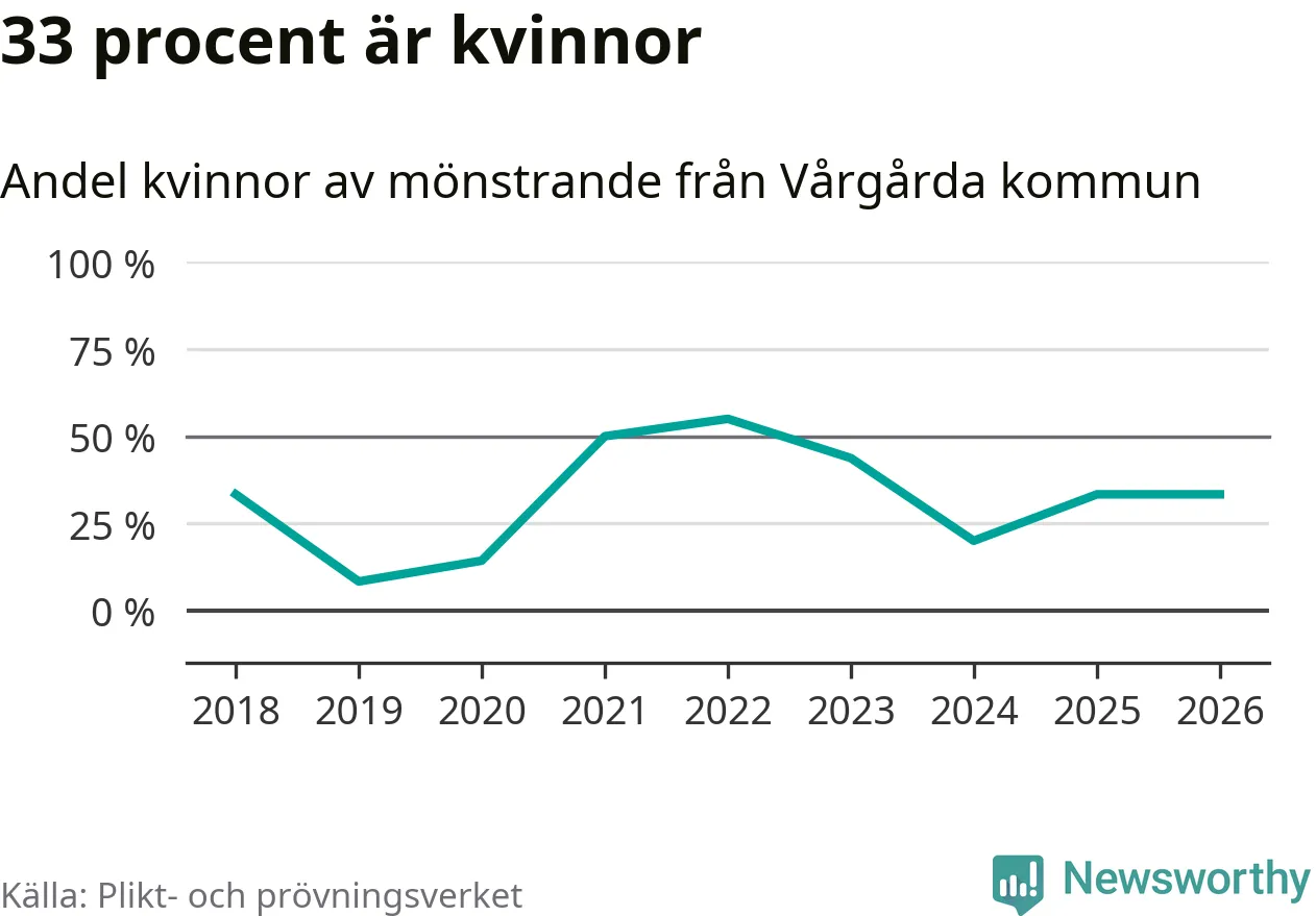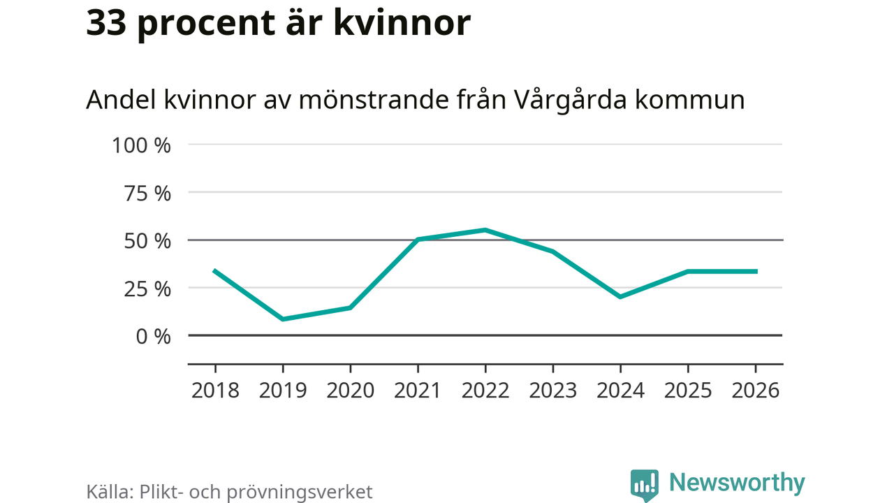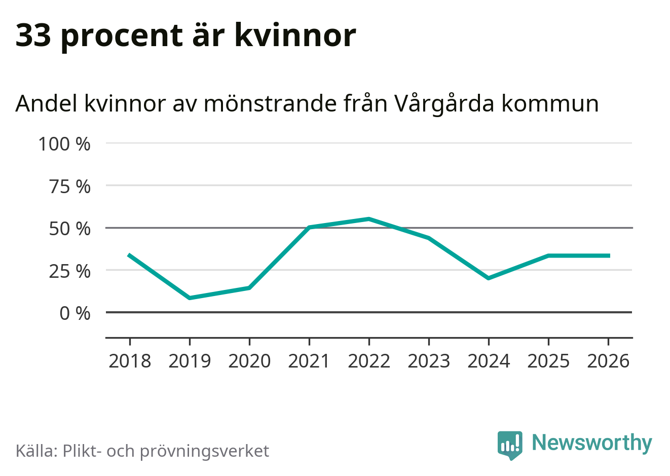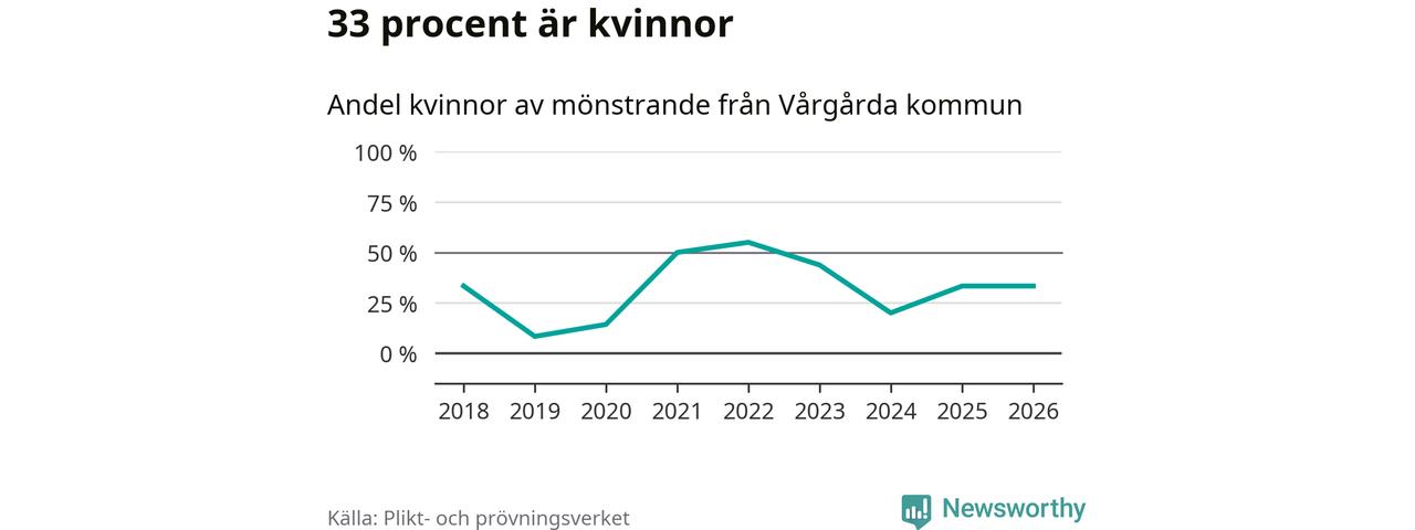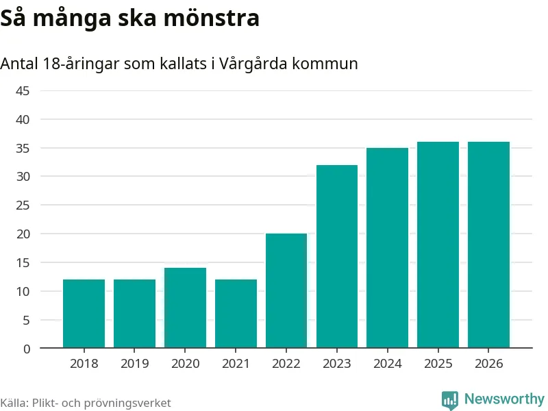 Nu kallas omkring 30 000 svenskar födda 2008 till mönstring. Och 36 av dem kommer från Vårgårda, enligt ny statistik från Plikt- och prövningsverket. Det innebär att var femte invånare i åldersgruppen i kommunen kallas till mönstring. Det är ungefär lika stor andel som i Västra Götaland totalt. I riket som helhet kallas nästan var fjärde person i årskullen.