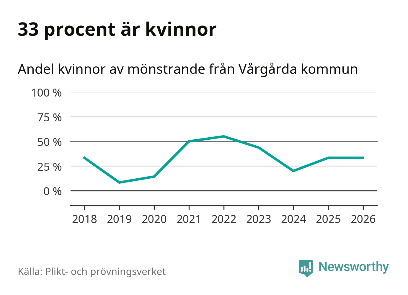 Tolv av de som kallats till mönstring från Vårgårda är kvinnor, vilket motsvarar 33 procent av de mönstrande. Som mest har 14 kvinnor kallats från kommunen (2023). I riket som helhet är 28 procent av de mönstrande tjejer.