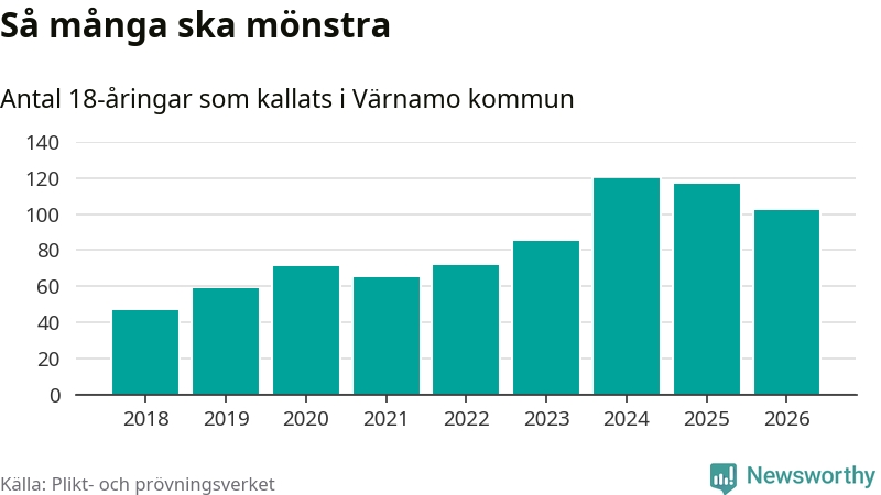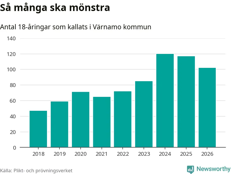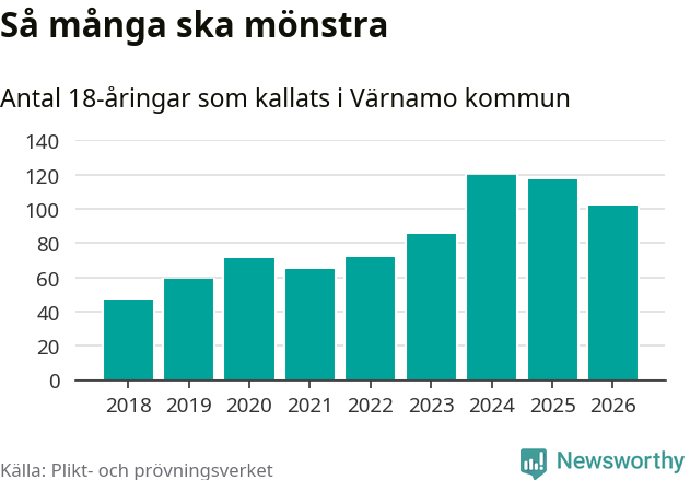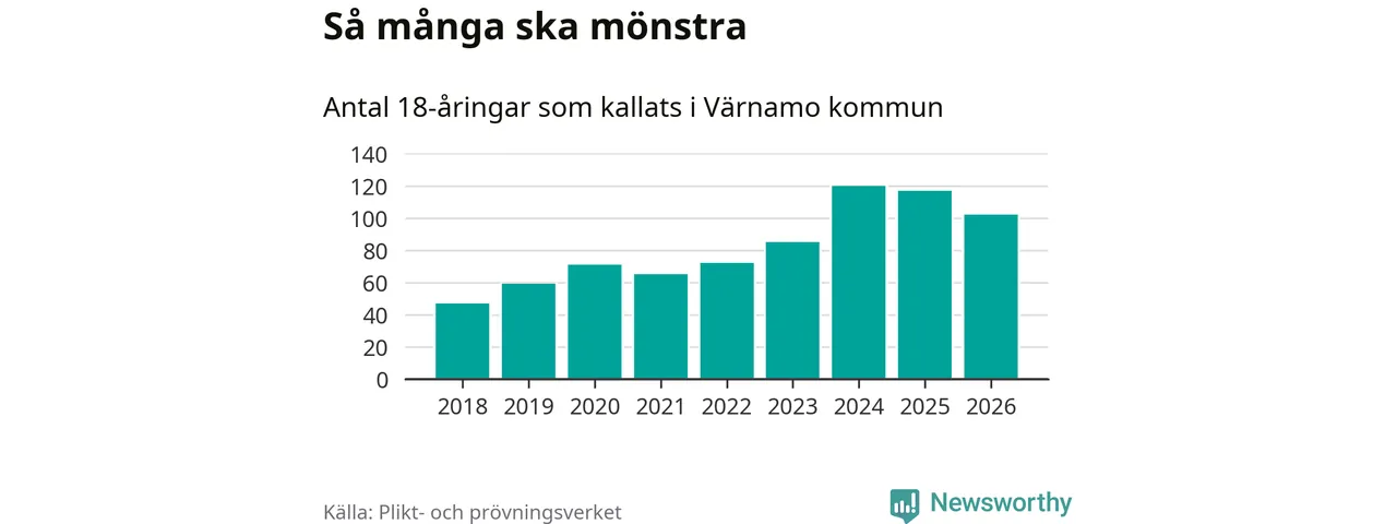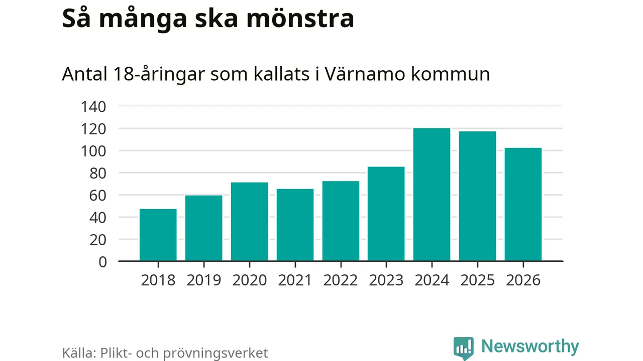 Nu kallas omkring 30 000 svenskar födda 2008 till mönstring. Och 102 av dem kommer från Värnamo, enligt ny statistik från Plikt- och prövningsverket. Det innebär att nästan var fjärde invånare i åldersgruppen i kommunen kallas till mönstring. Det är ungefär lika stor andel som i Jönköpings län totalt. Även i riket som helhet kallas nästan var fjärde person i årskullen.