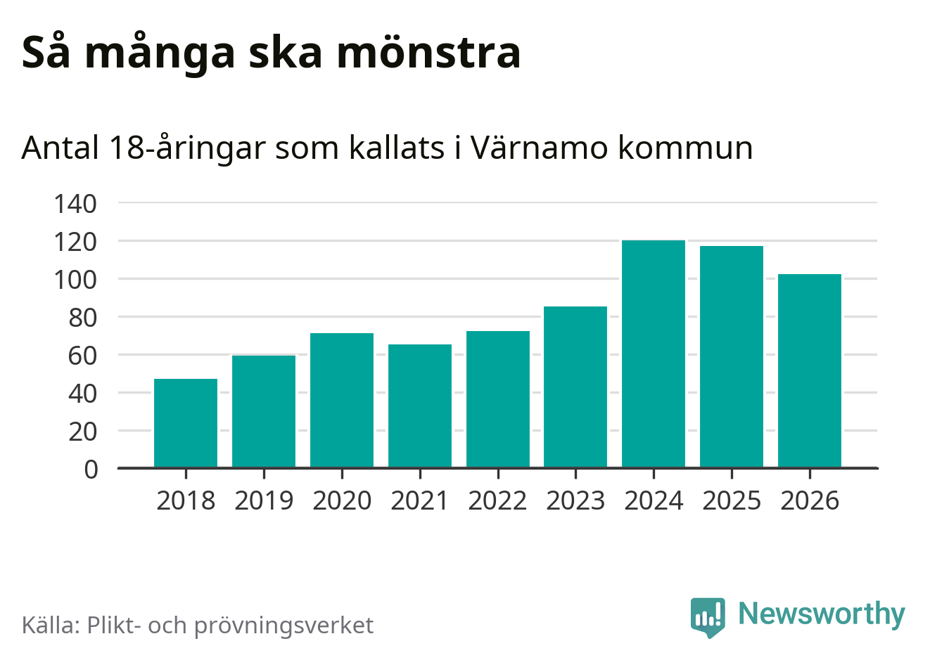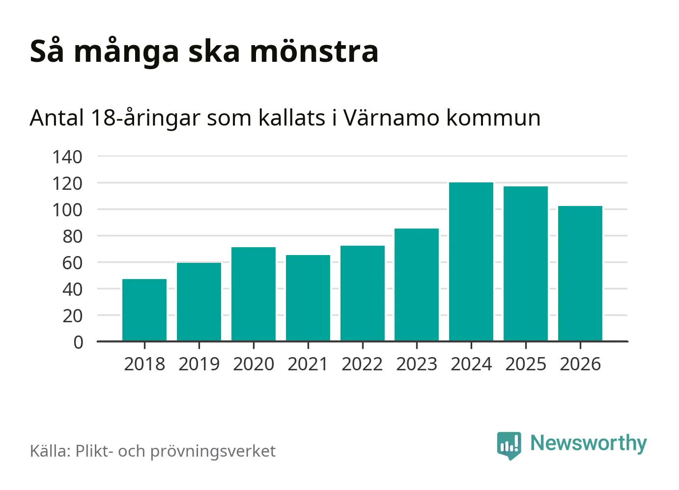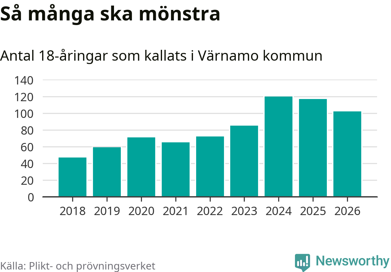 102 personer är 15 färre än 2025. Som mest har 120 personer från en årskull kommunen mönstrat (2024). Totalt från Jönköpings län kallas 1 124 personer i år.