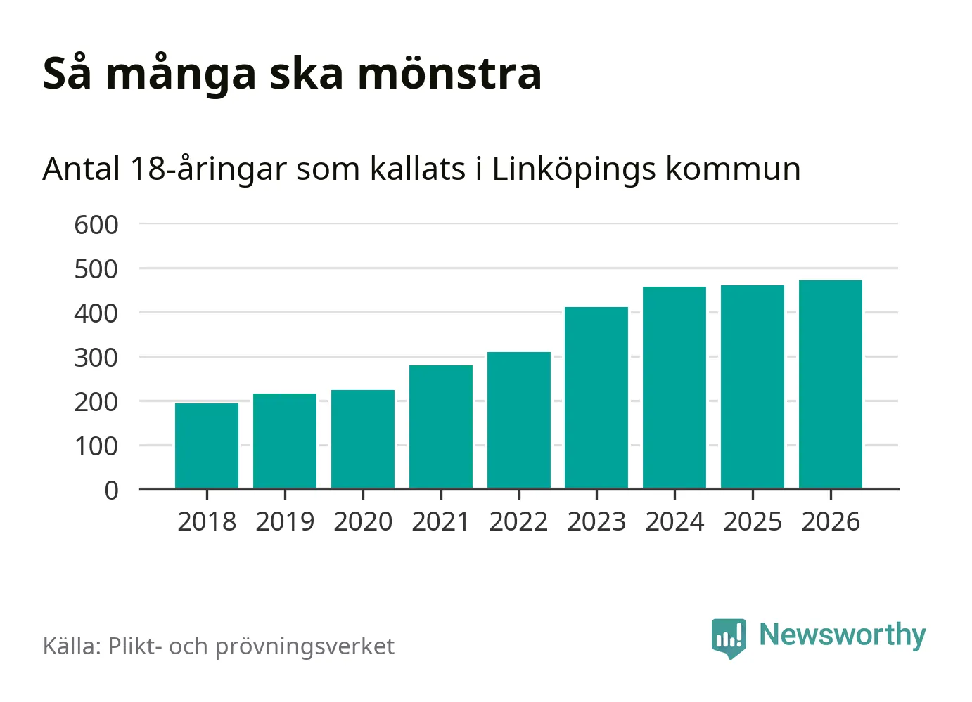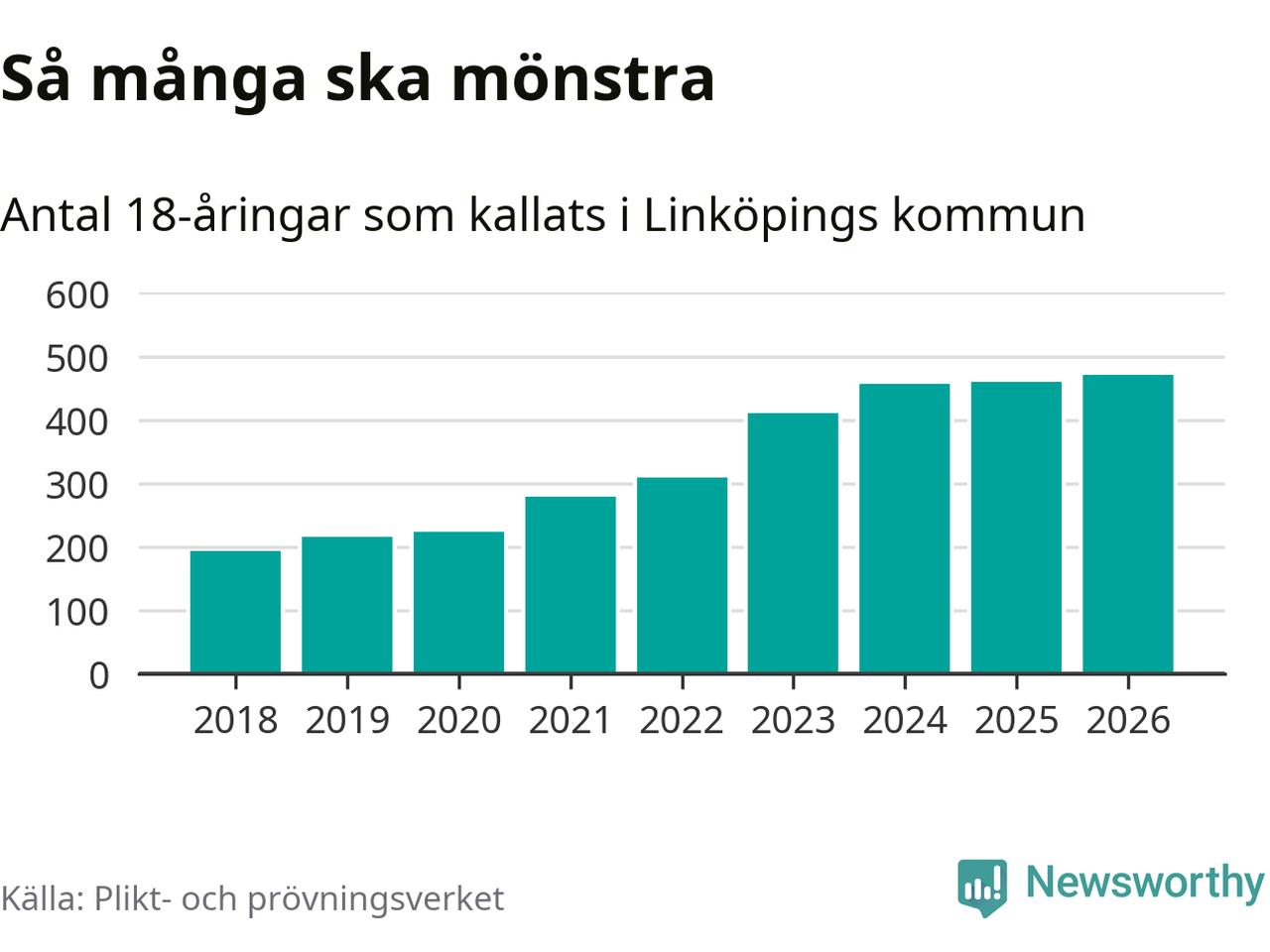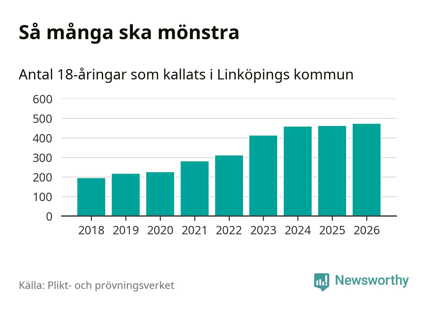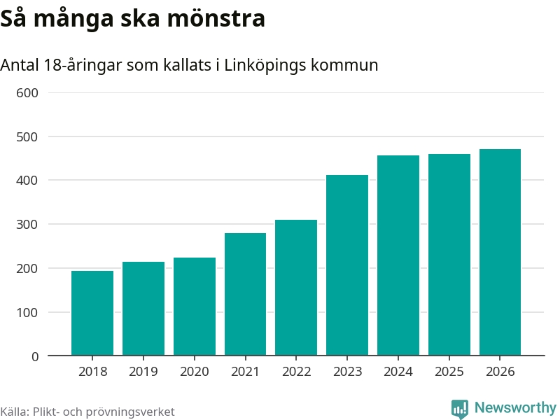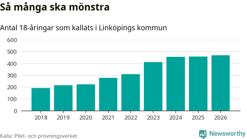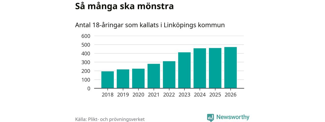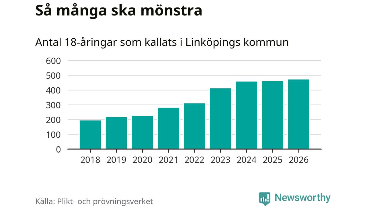 Antalet kallade i Linköping har ökat varje år sedan 2018, som är första året med statistik på kommunnivå (värnplikten återinfördes 2017), och jämfört med 2025 är det tolv fler i år. Totalt från Östergötlands län kallas 1 318 personer i år.